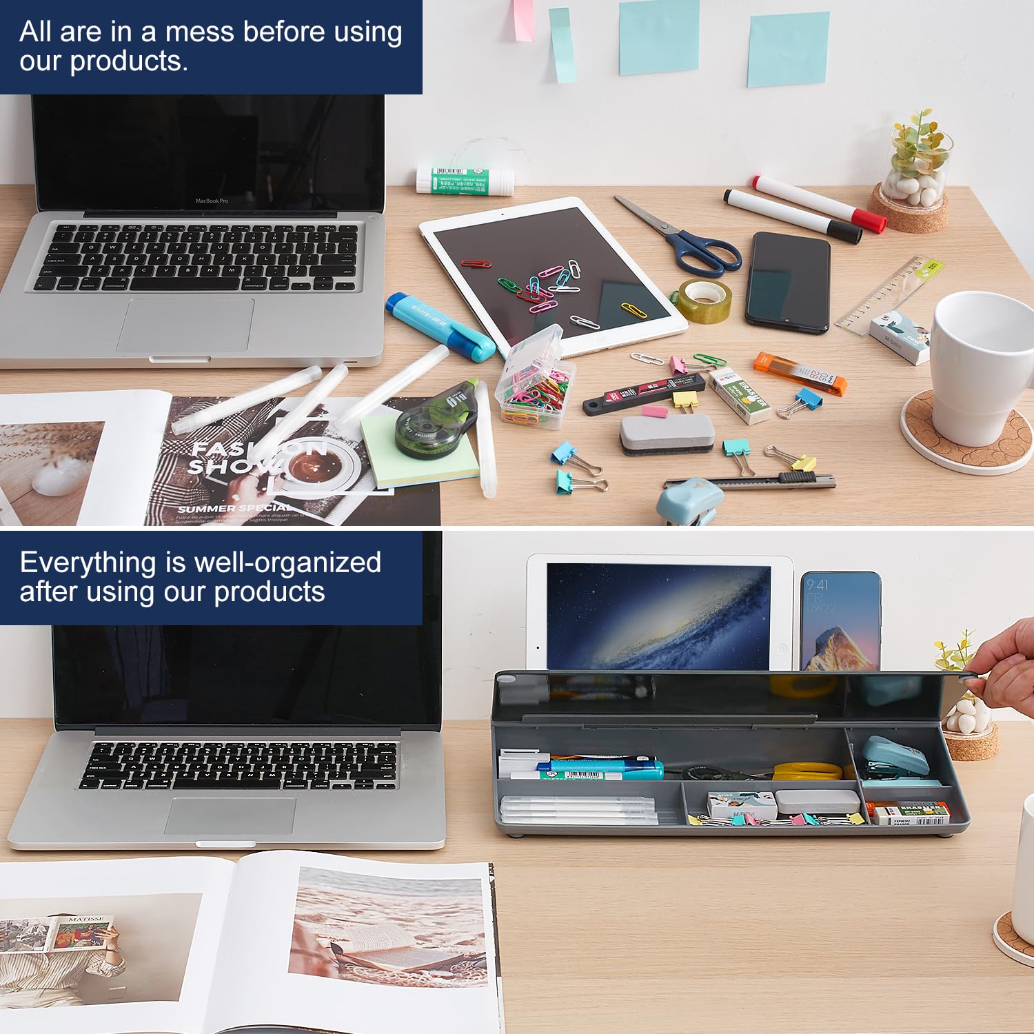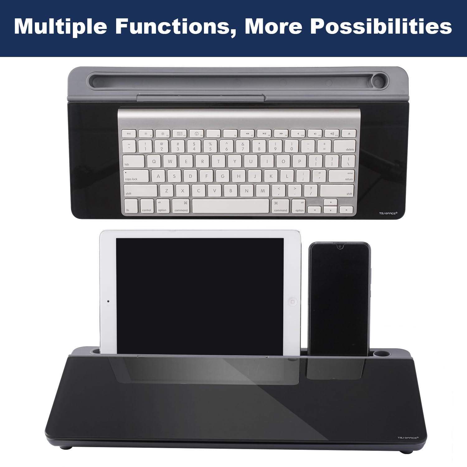 HIDDEN STORAGE & PAD/MOBILE TRAY: De-clutter your desk by storing markers, magnetic eraser and other desktop accessories in the opening drawer or place markers on the accessory tray for quick access. And one more long tray on the top of the dry erase white board for your pad or mobile.