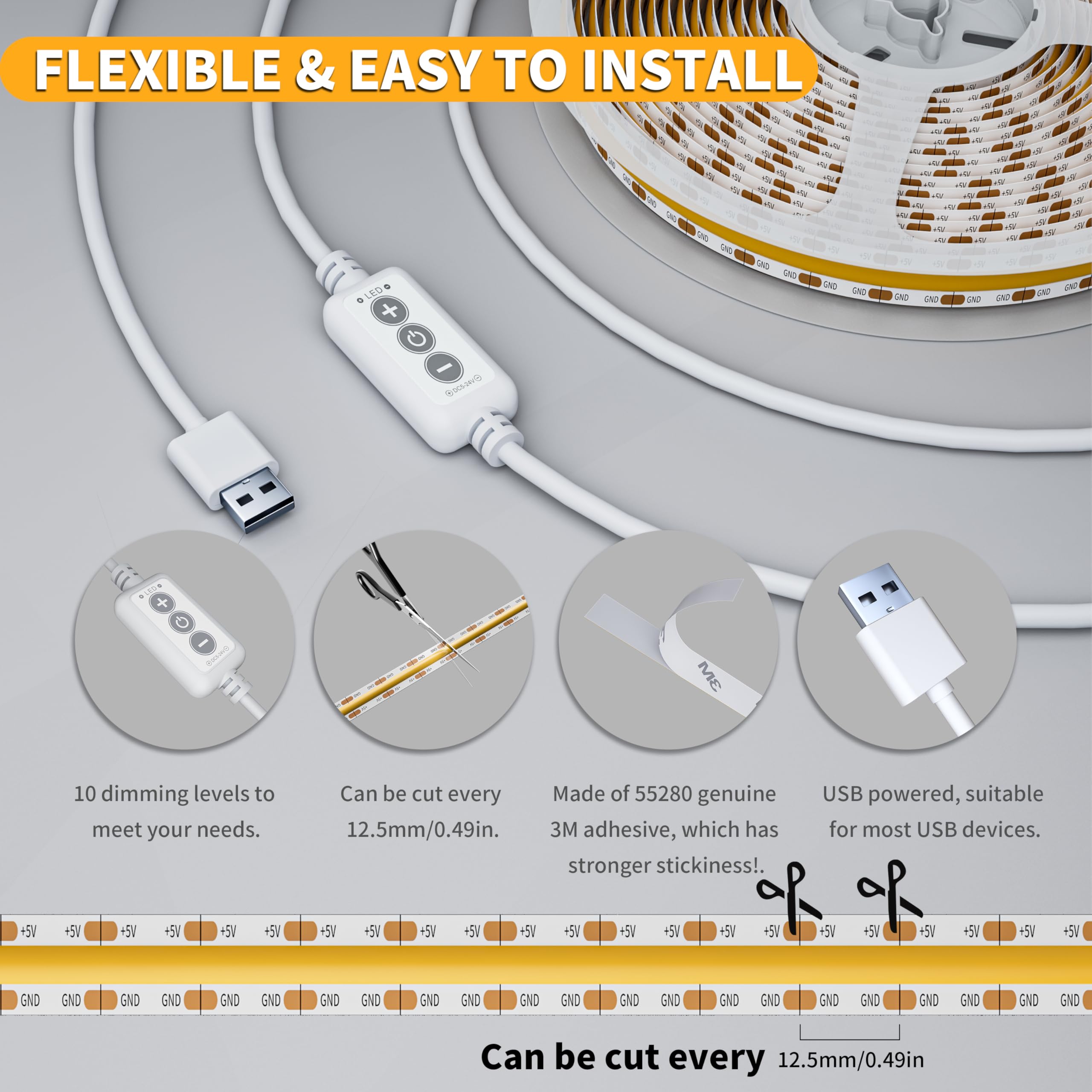 【Dimmable Brightness and Memory Function】With the UPGRADED dimmer for 10-level brightness adjustment.With memory function,this USB powered cob led strip restores to its last setup to save your time effectively.PAUTIX 5V natural white USB COB led lights strip is ideal for daily use