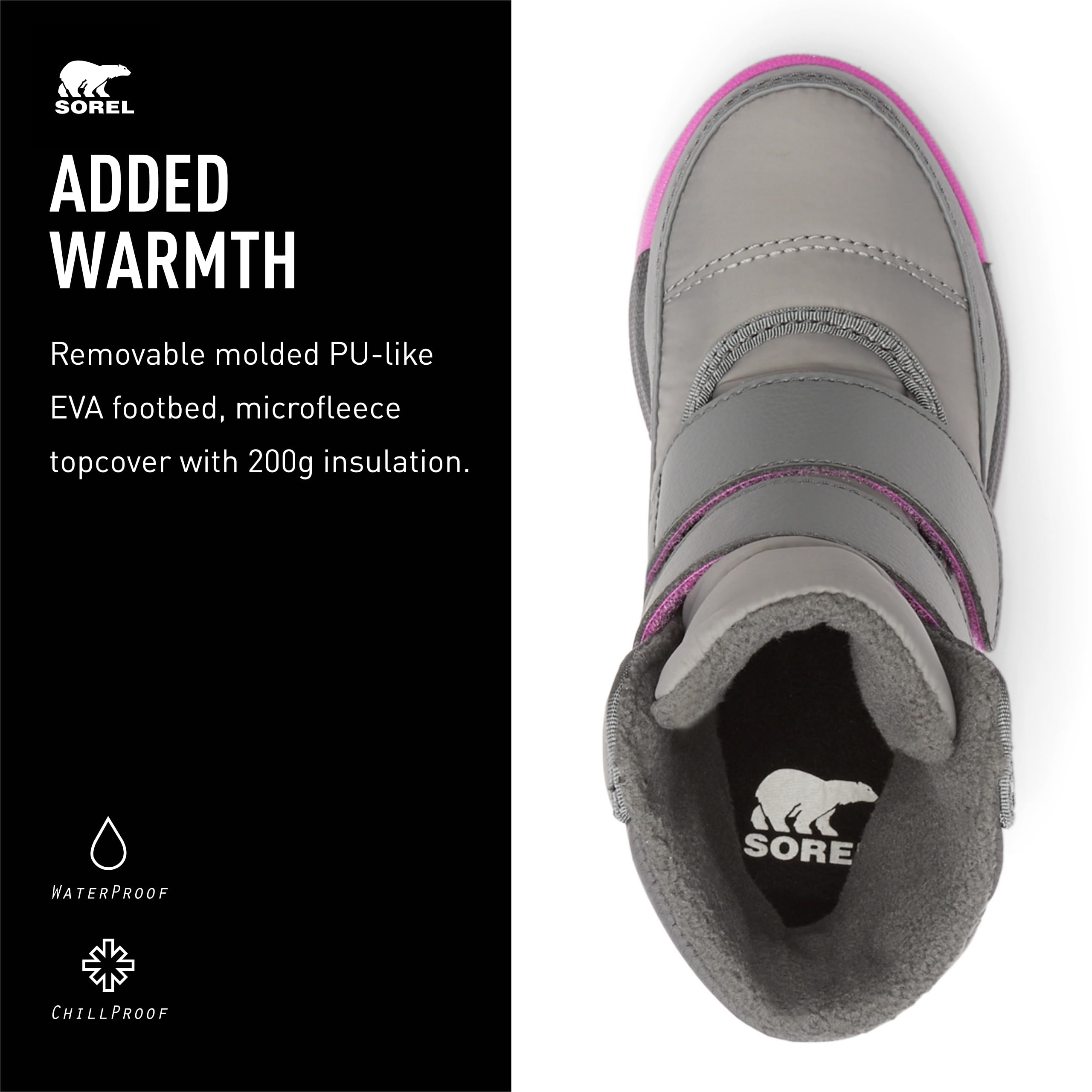 Description An easy choice for winter fun, these boots are cozy, waterproof, and oh-so simple to put on and take off. The durable upper is lined with faux fur and microfleece, plus 200g insulation for even more warmth. Combine that with the EVA footbed and high-traction rubber sole, and you've got the recipe for happy little feet.