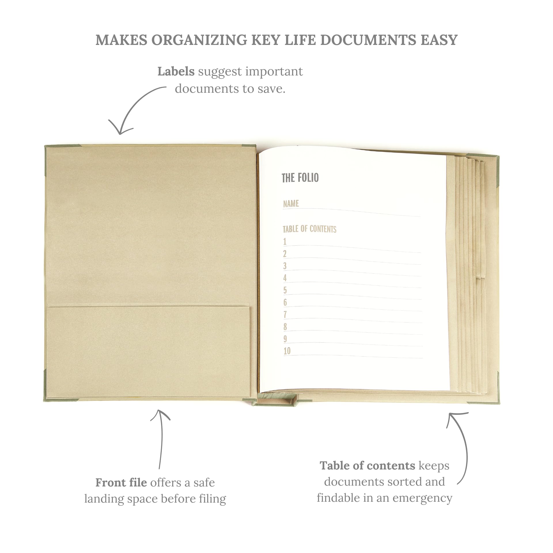 Organization made simple: Table of contents keeps track of documents organized inside. Hand-Illustrated labels show you what to save and where to find it. Front pouch provides a landing space for documents before they are filed.
