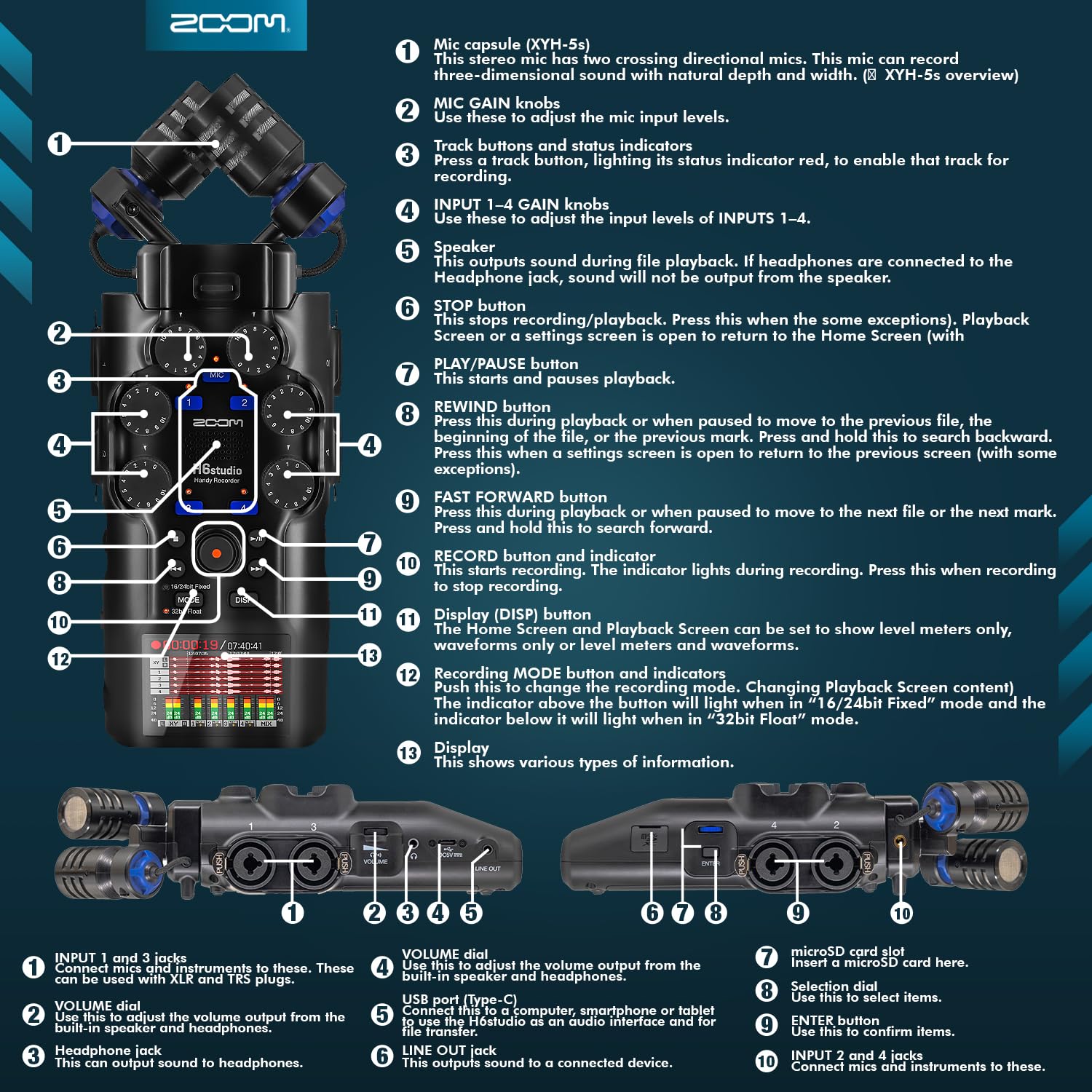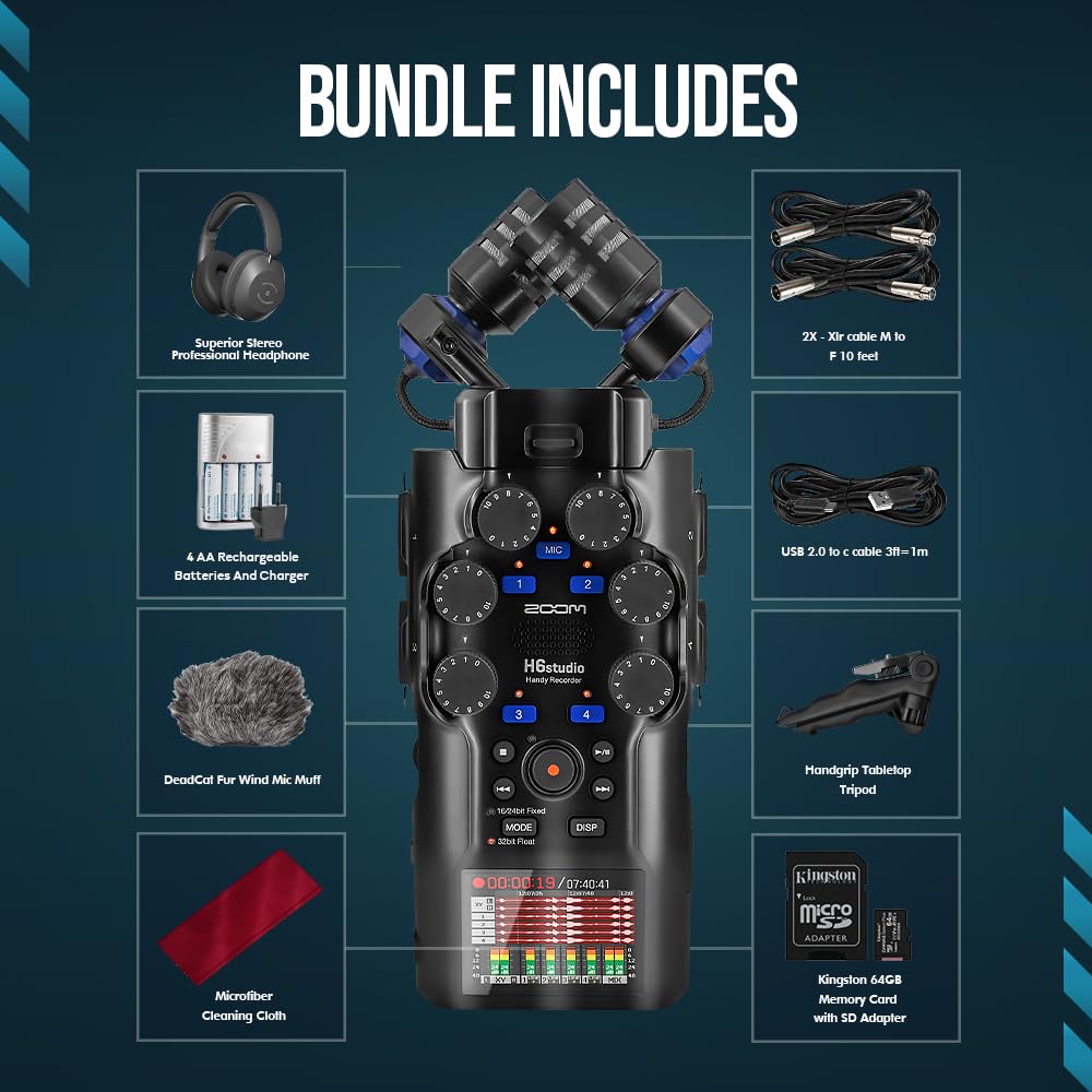 Comprehensive Kit – This Zoom H6 Studio handy recorder includes SonicSound accessories: 1x USB 2.0 to c cable 3ft=1m, 1x Microfiber Cleaning Cloth, 1x 64GB MicroSDXC Memory Card with SD Adapter, 1x Handgrip Tabletop Tripod, 1x Superior Stereo Professional Headphone w Built-in Microphone, 1x Fur Wind Mic Muff, 2x XLR cable M to F 10 feet, and 1x 4AA Rechargeable Batteries and Charger.