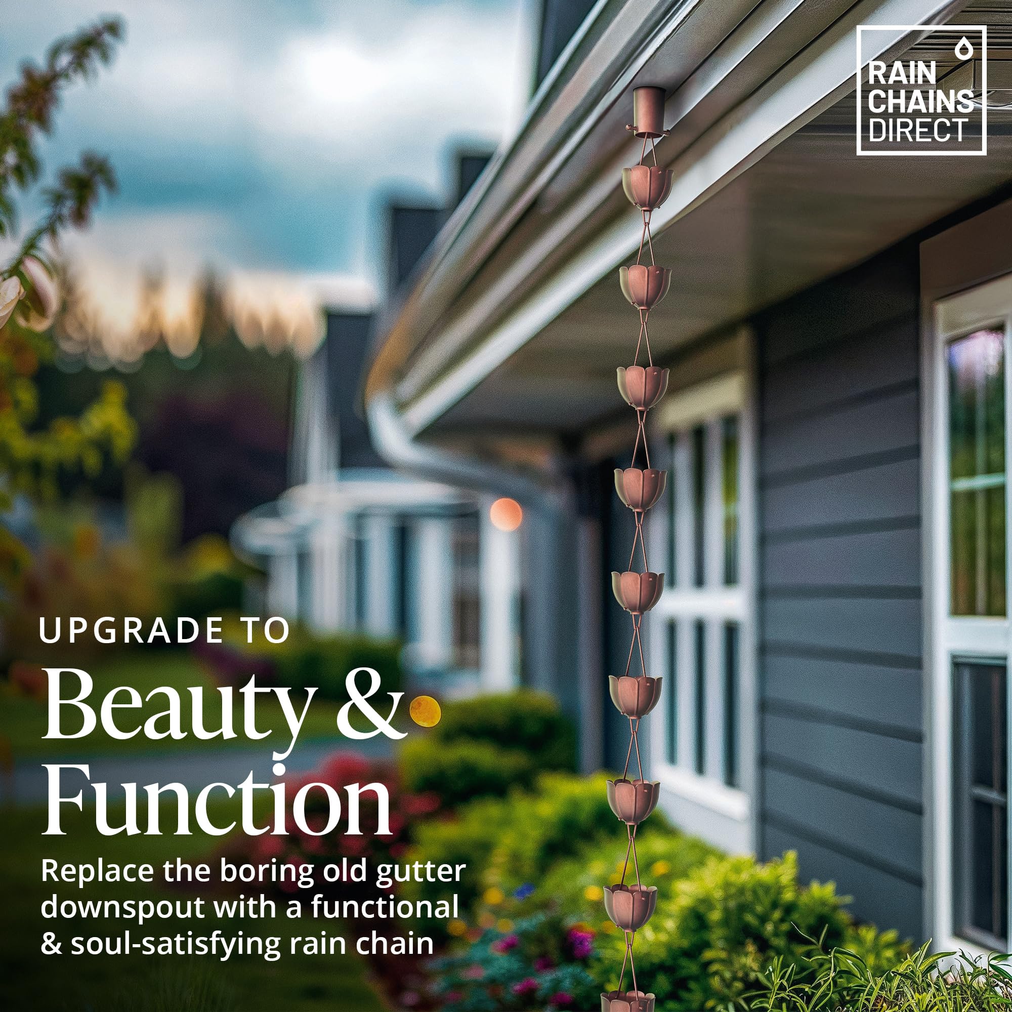 Rain chains, sometimes called “gutter chains” or “downspout chains”, are a functional yet beautiful replacement for traditional gutter downspouts. Unlike traditional gutter downspouts, which are often placed out of sight because they are not attractive, rain chains can be prominently placed, enhancing the overall look and curb appeal of the home. Our Orchid Rain Chain in copper is a part of our contemporary styled line of chains. It's sleek "flower" links are inspired by the beautiful tulip flower, making for a simple and unique design. It's simplicity ensures that it will look great on any home. Like all of our copper rain chains, this will gain a beautiful patina over time, enhancing its look. This chain comes with it's own hanging hook, making installation to any standard gutter system simple. For an even more premium look and function, a gutter installer (adapter) can also be purchased separately Material: 100% Copper Color: Copper Length of Chain: 8.5 feet Size of Cup: 3.25 inches wide, 2.5 inches tall Number of cups: 17