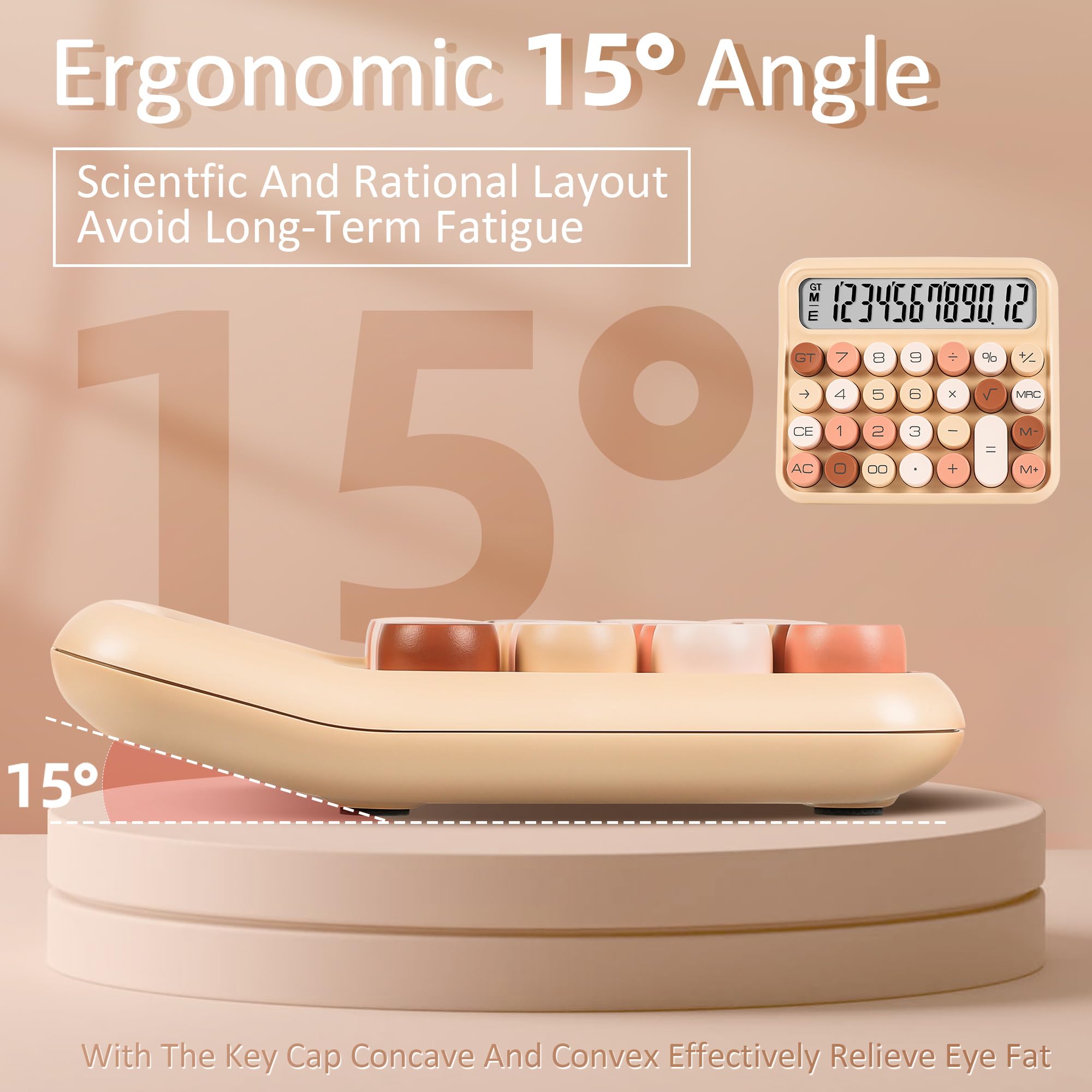 IMITATION MECHANICAL KEYBOARD: Imitating the knocking feel of a mechanical keyboard (the keyboard cannot be disassembled without special tools), the key operation is fast and accurate, bringing a pleasant experience.. The touch of your fingers and the unique clicking sound are addictive.Large button, candy color.Large LCD screen,12-digit display, vertical back,15-degree angle for easy-to-read calculator