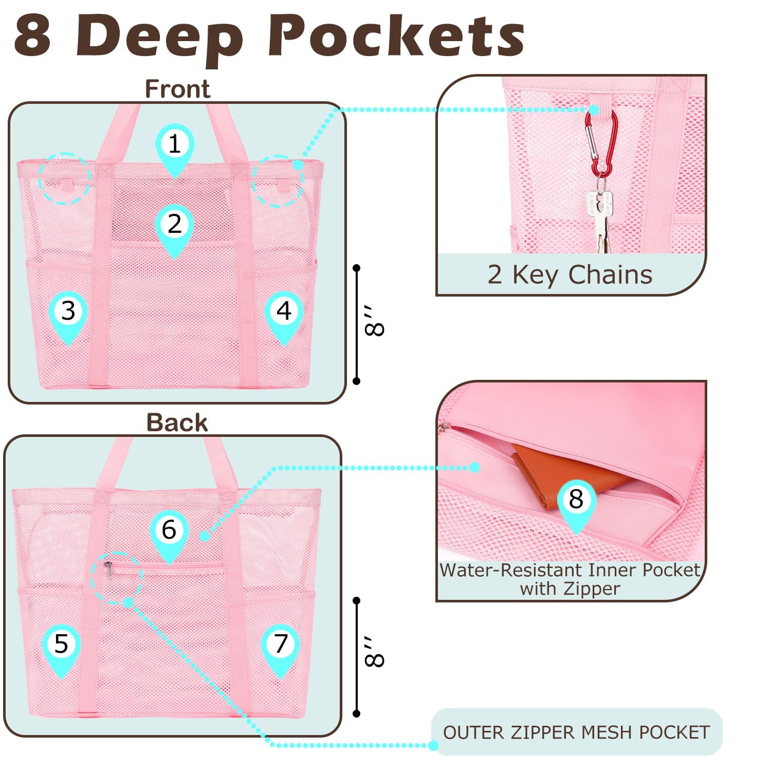 ๐๏ธใ๐ ๐๐จ๐๐ค๐๐ญ๐ฌ & ๐๐ข๐ฉ๐ฉ๐๐ซ๐๐ ๐๐ฅ๐จ๐ฌ๐ฎ๐ซ๐ใDesigned for both men and women, this beach bag features a secure top zipper closure and 8 pockets, including a waterproof internal zipper pocket to store valuables like phones and keys. The 2 D-rings offer extra convenience for hanging accessories.