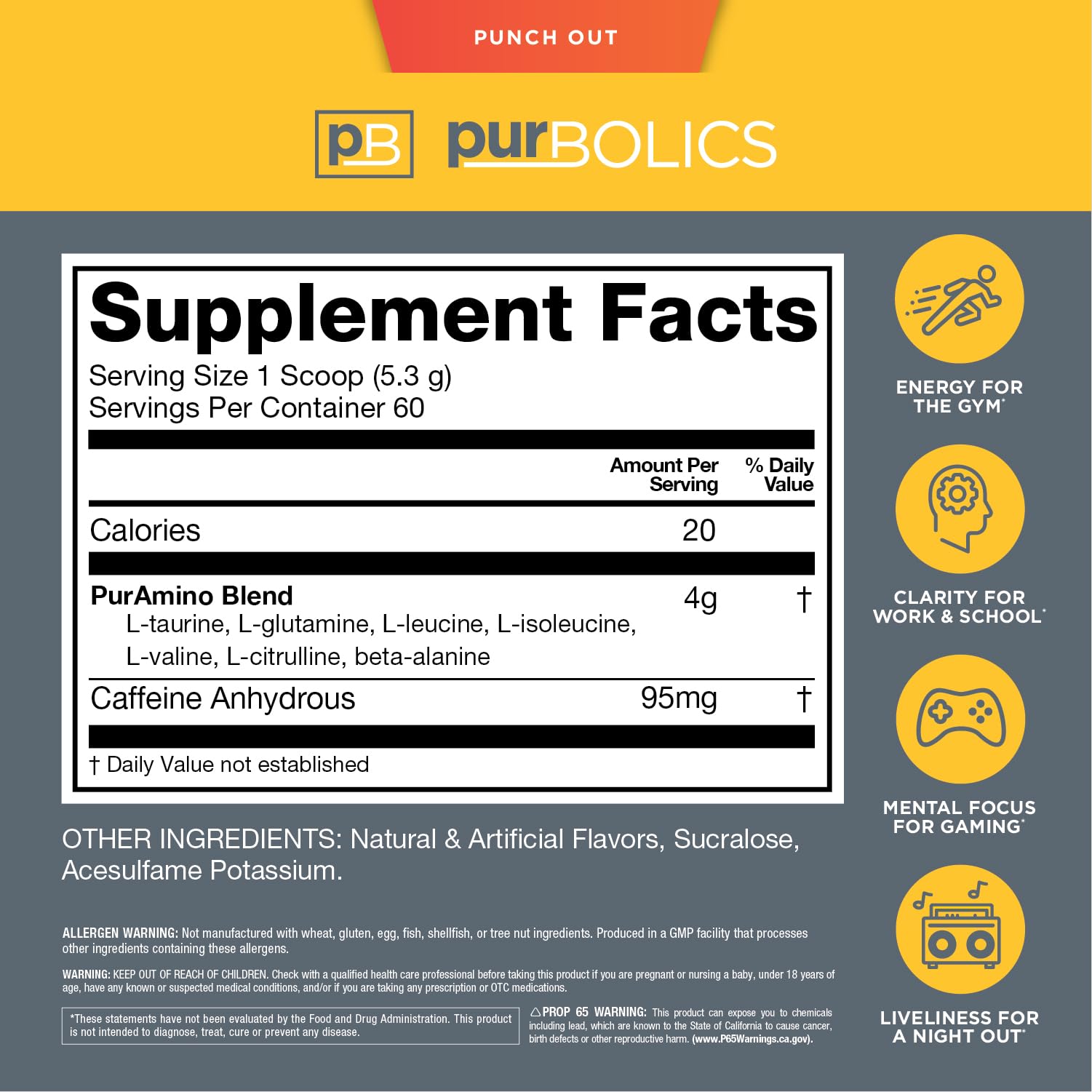 When we first tried this flavor, we could only imagine one person being able to knock our taste buds out the same way and that was Mike Tyson. So, we decided to name this flavor Punch Out after one of the greatest. Watch out for that counter hook! Focus, Concentration, and Recovery. Purbolics is perfect for those looking to get more out of their body and the aminos they consume! With amazing flavors we are helping individuals recovery faster, better, and stronger! Boosting with caffeine is just a perk that'll leave you focuses and ready to tackle the day!