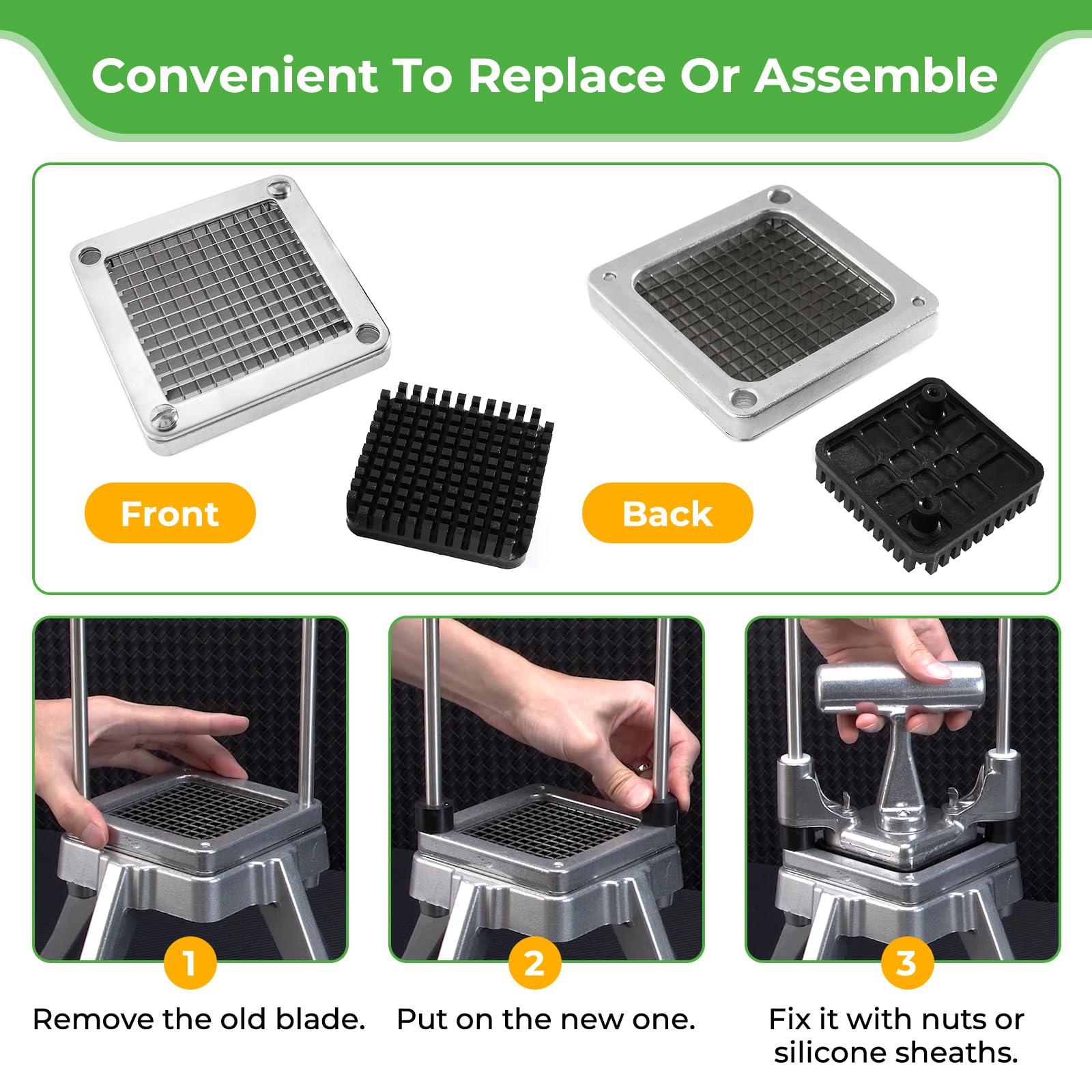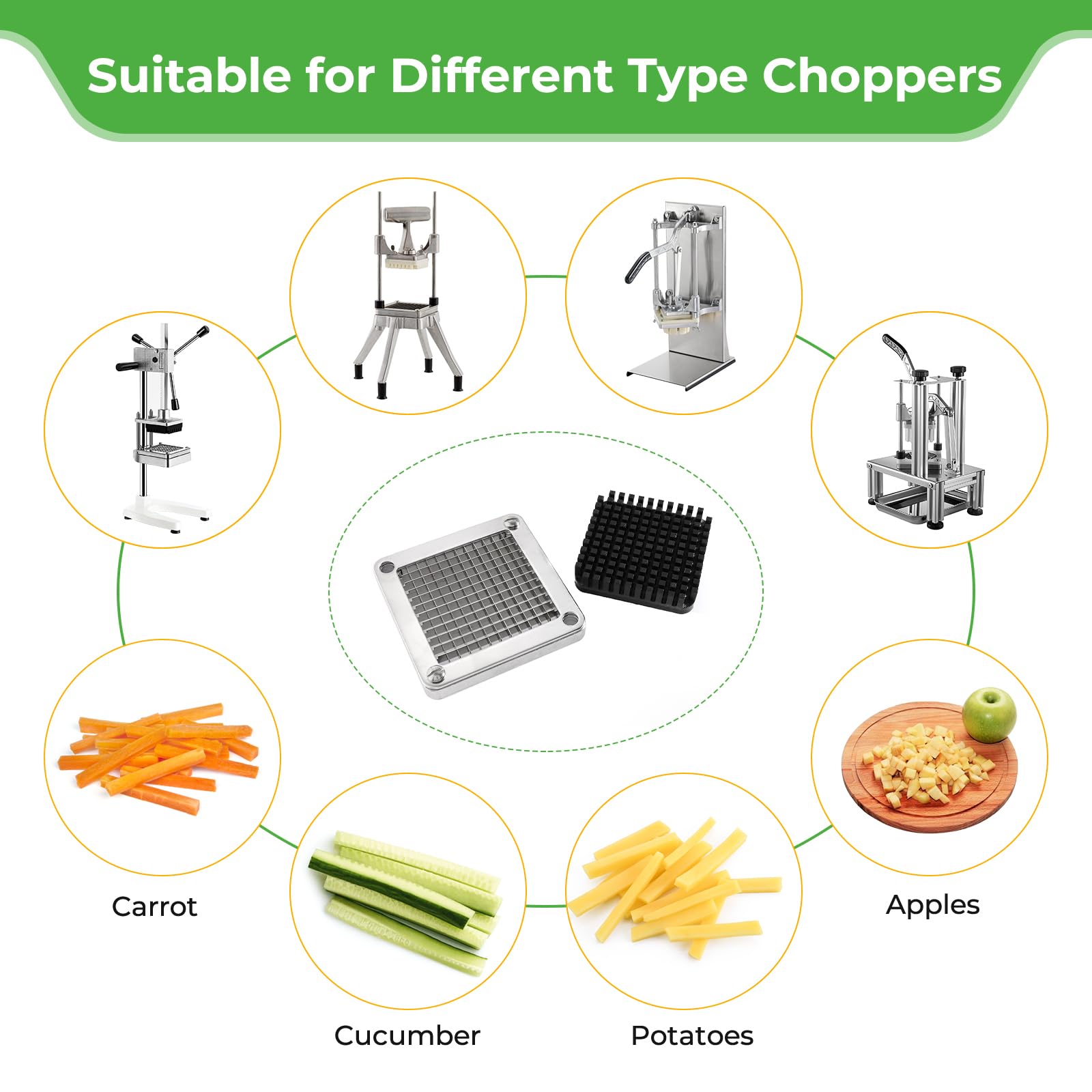 š ćEasy to OperatećSimply place the vegetables on the blade assembly and pull down the pusher block and you will get 1/4" (0.6 cm) of cut vegetables or fruit from the french fry cutter blades.these chopper blades can greatly produce ingredients in perfect uniform sizes.