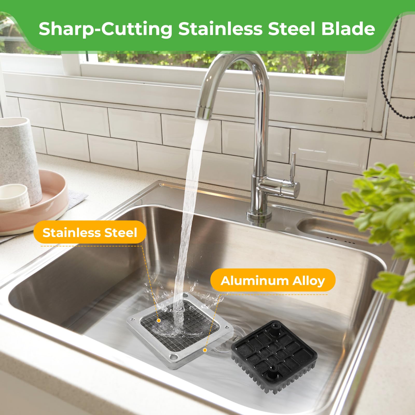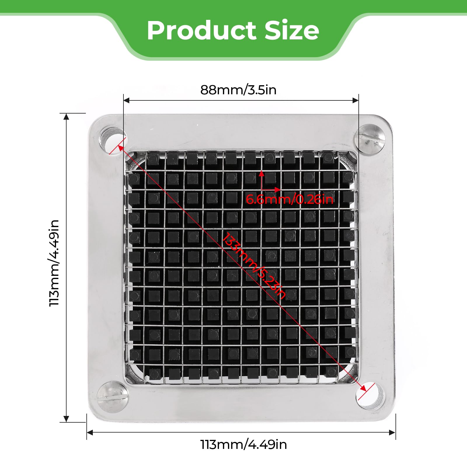 š ćStainless Steel BladećThe french fry blade made of high qulity stainless steel on blades for long-lasting use, rust & corrosion-proof and wear resistant. The stainless steel blades are sharp enough for chopping or dicing the vegetable and fruit ingredients.