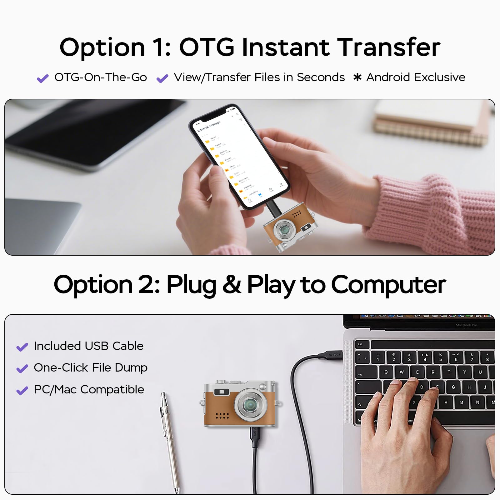 â ăComplete Recording ToolkităOperate this mini camera digital with just 4 intuitive buttons and a 0.96" preview screen. Package includes: 1*Camera, 32GB card, Type-C cable, OTG adapter, PU strap, keychain, manual. Backed by 1-year warranty â If you have any issues, our dedicated customer support is here to assist.