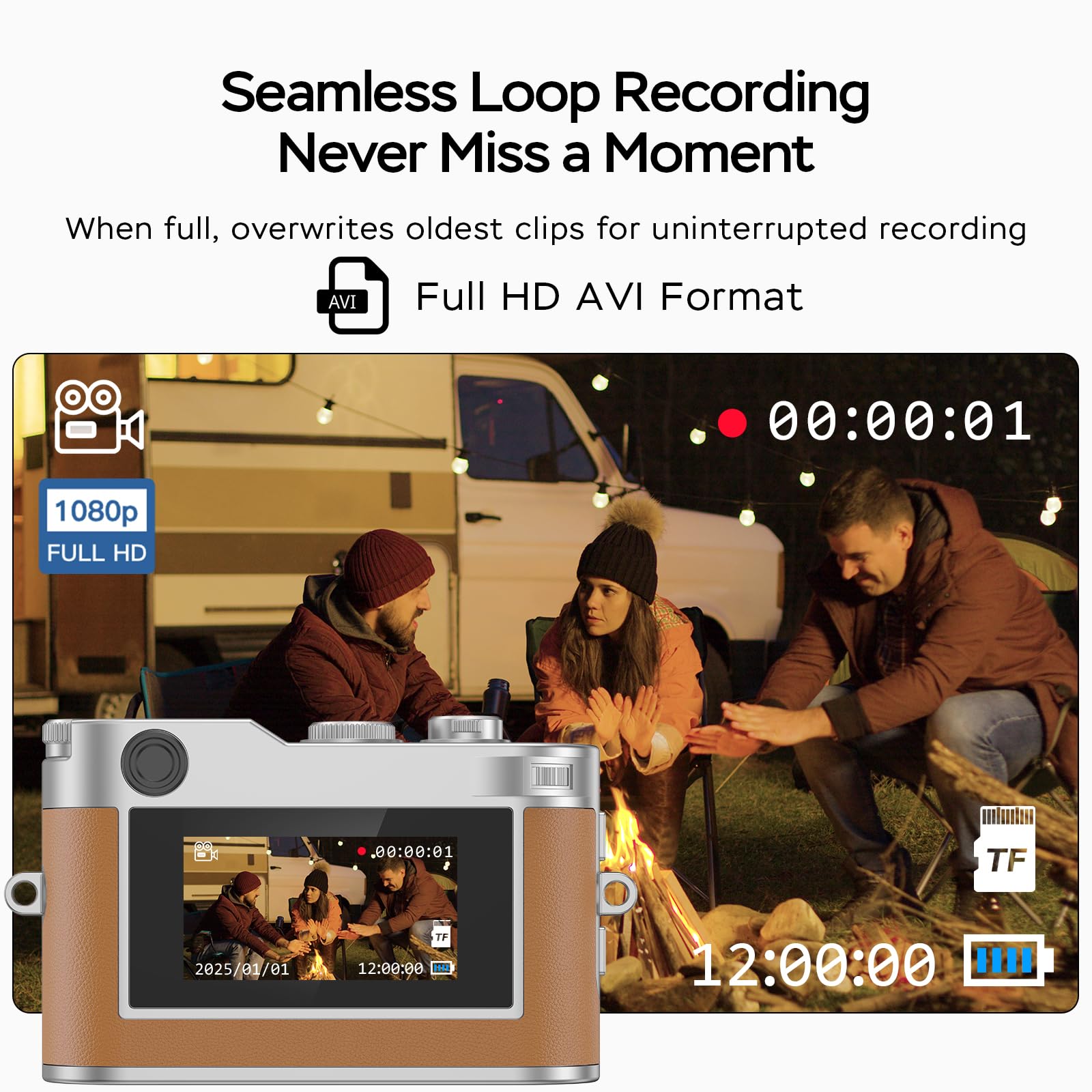đ¸ă1080P HD Video & 12MP PhotosăEquipped with advanced CMOS metering, this keychain digital camera delivers vibrant 1080P video and 12MP photo resolution. The built-in LED fill light and 6 creative filters enhance shots in low light, while aluminum speakers provide clear audio â making every detail pop like a pro retro camera.