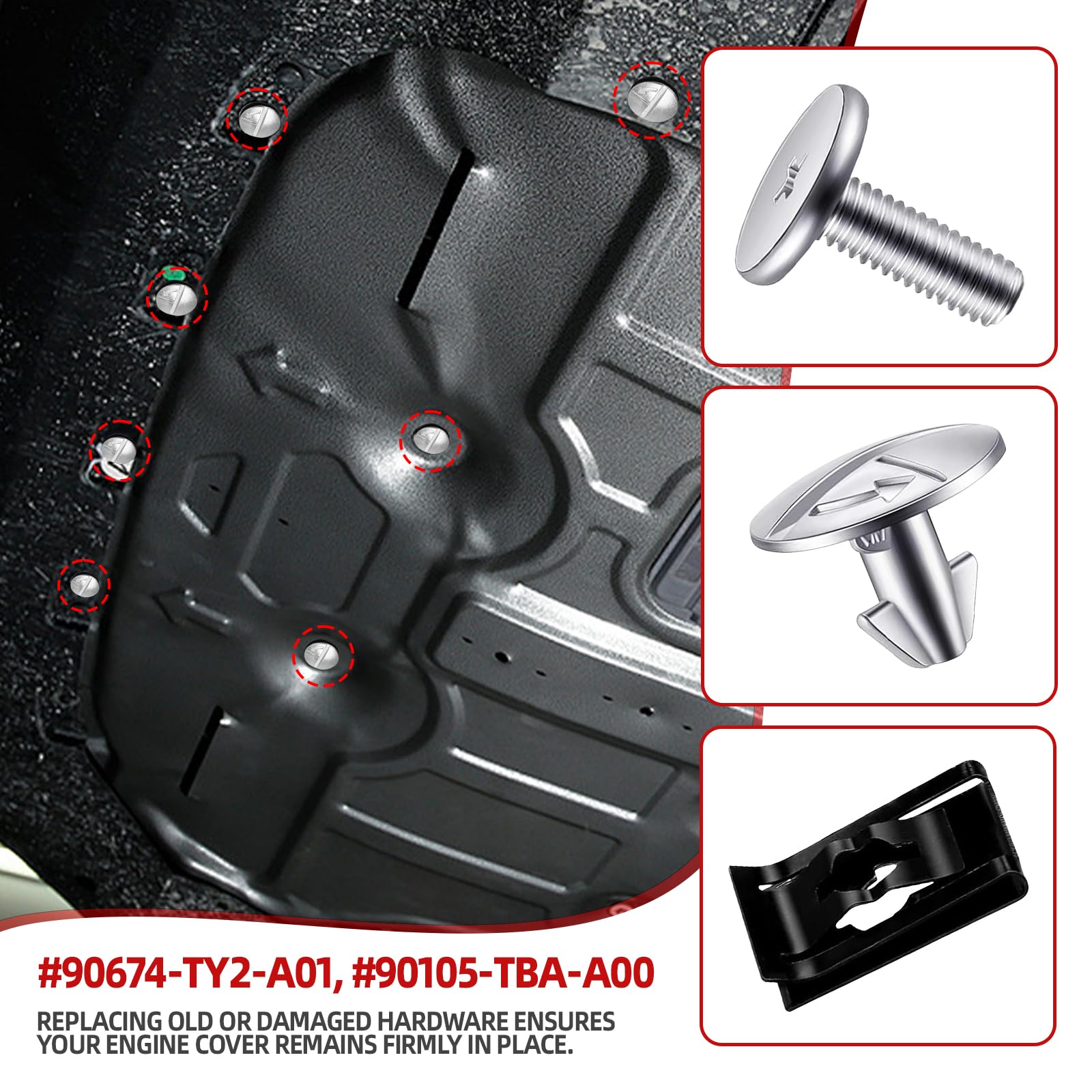 Engine Protection: These splash guard pin screws and clips are essential for securely attaching the undercarriage skid plate and oil pan shield, helping to protect your engine from road debris and potential damage. Replacing old or damaged hardware ensures your engine cover remains firmly in place