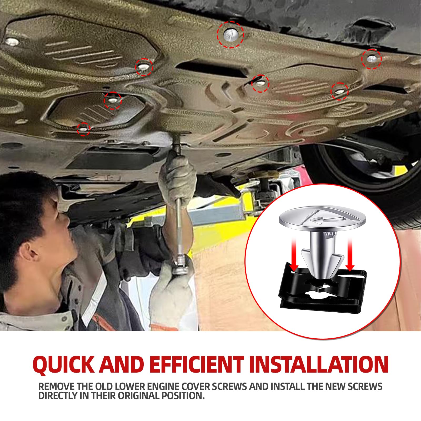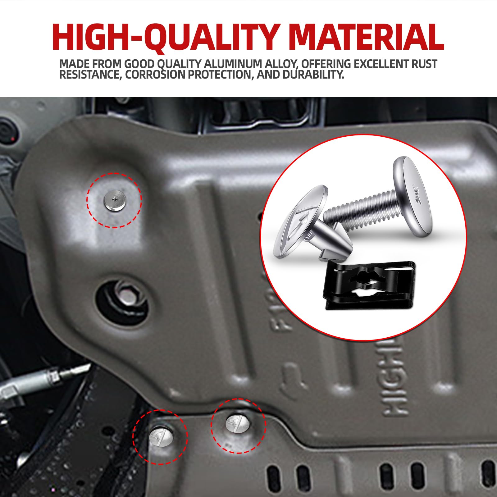 Durable Construction: These engine lower cover pin screws are made from high-quality aluminum alloy, offering excellent rust resistance, corrosion protection, and durability. Designed to withstand harsh automotive conditions, they ensure a long-lasting secure fit for your car