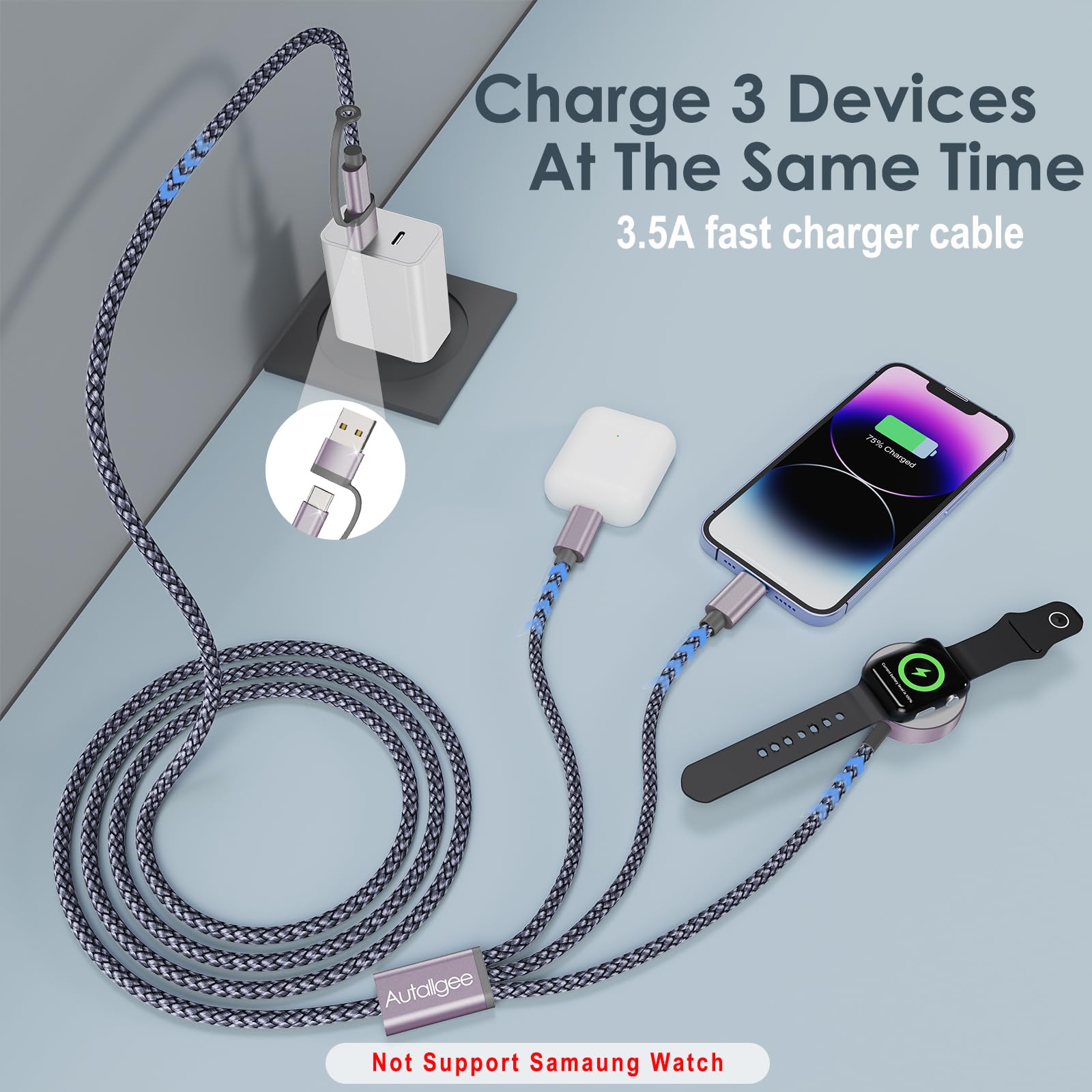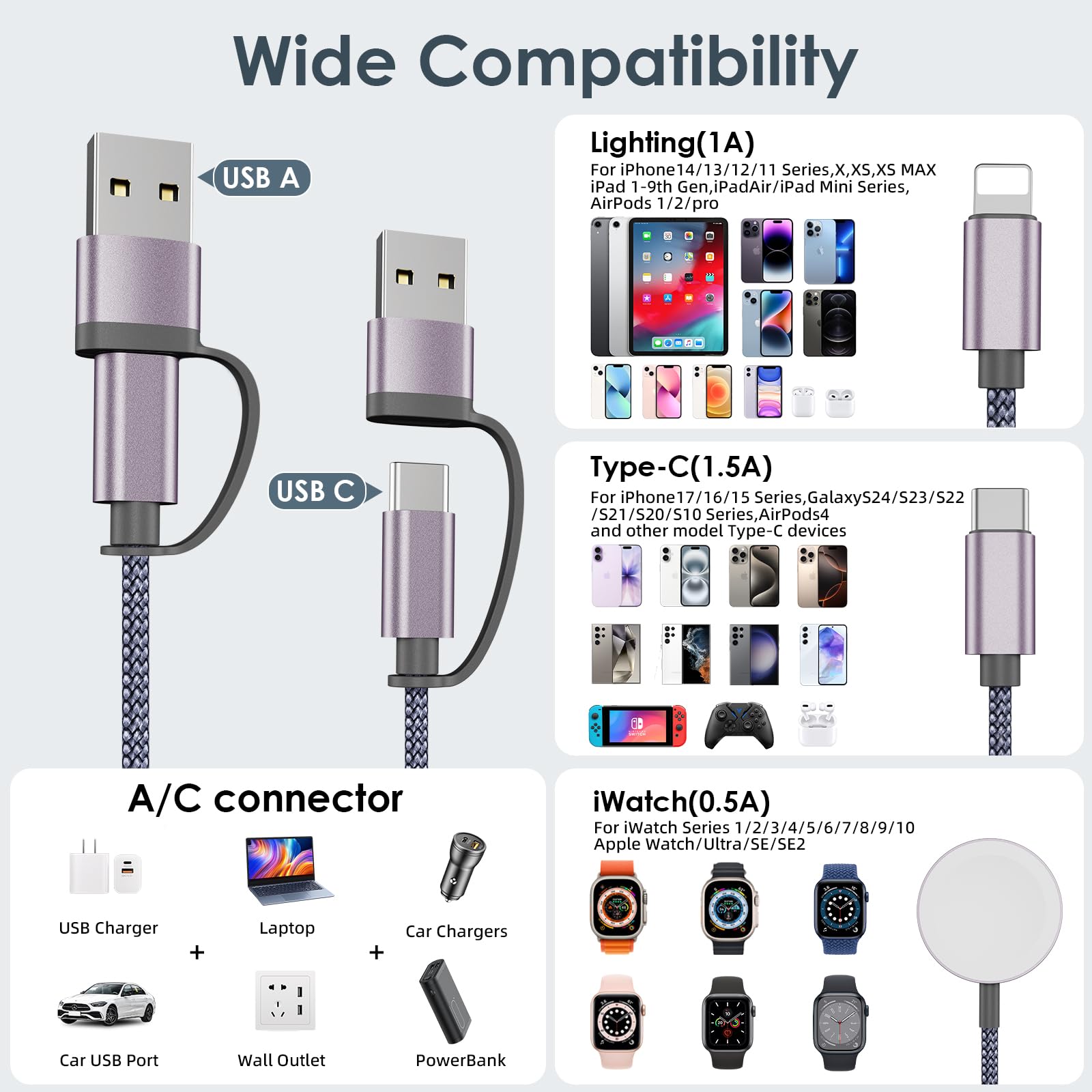 【Super 3 in 2 Multi-Function】3-in-2 multi charging cable provide 6 charging modes (USB-C/A for Apple Watch charger, Lightning, and Type-C),which compatible with iWatch Series 1-9, SE, and Ultra models, compatible with iPhone 17 and newer models,and iPads (Lightning/USB-C).A portable travel charger and a universal charging cable for multiple devices,designed to charge multiple devices at once