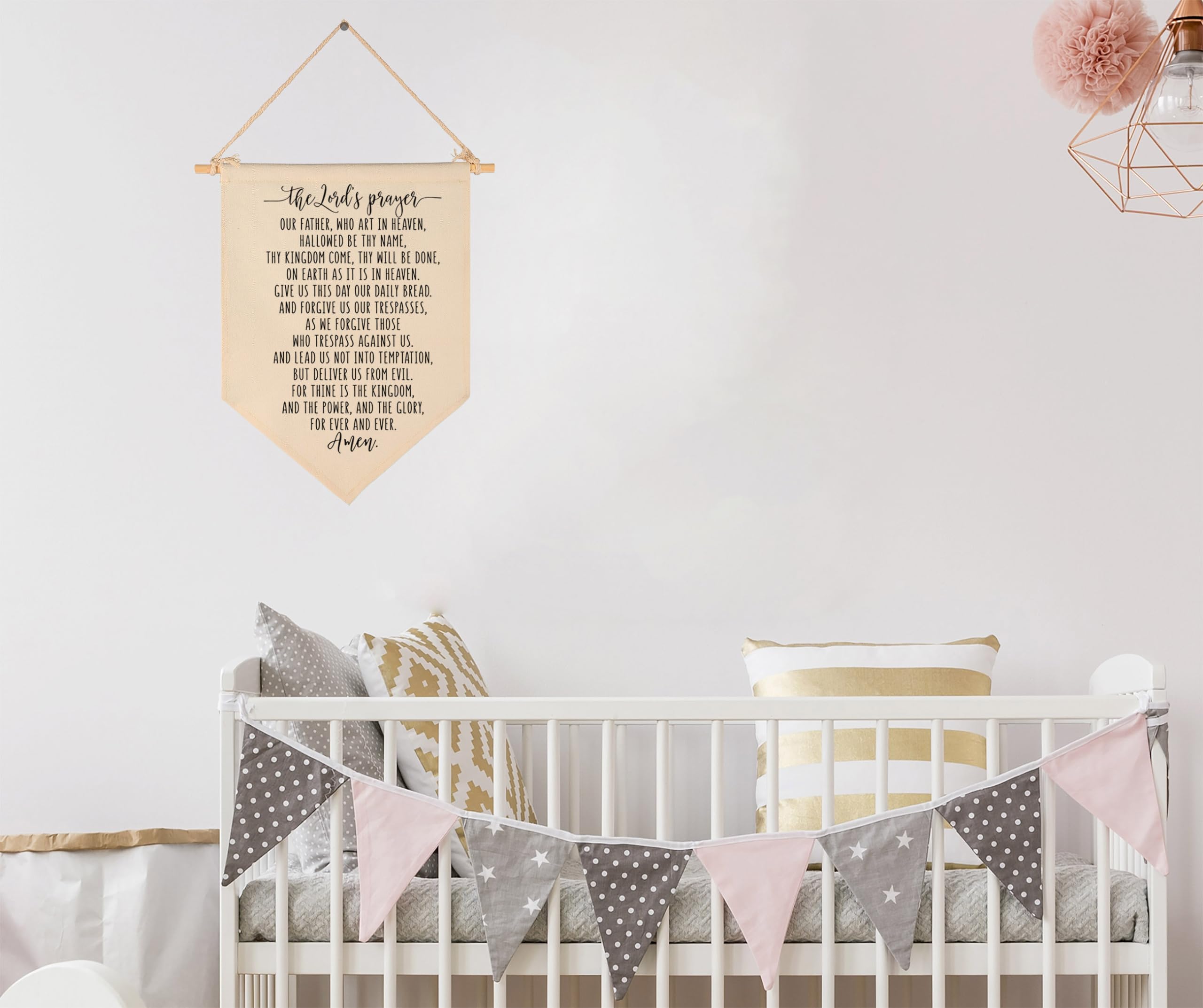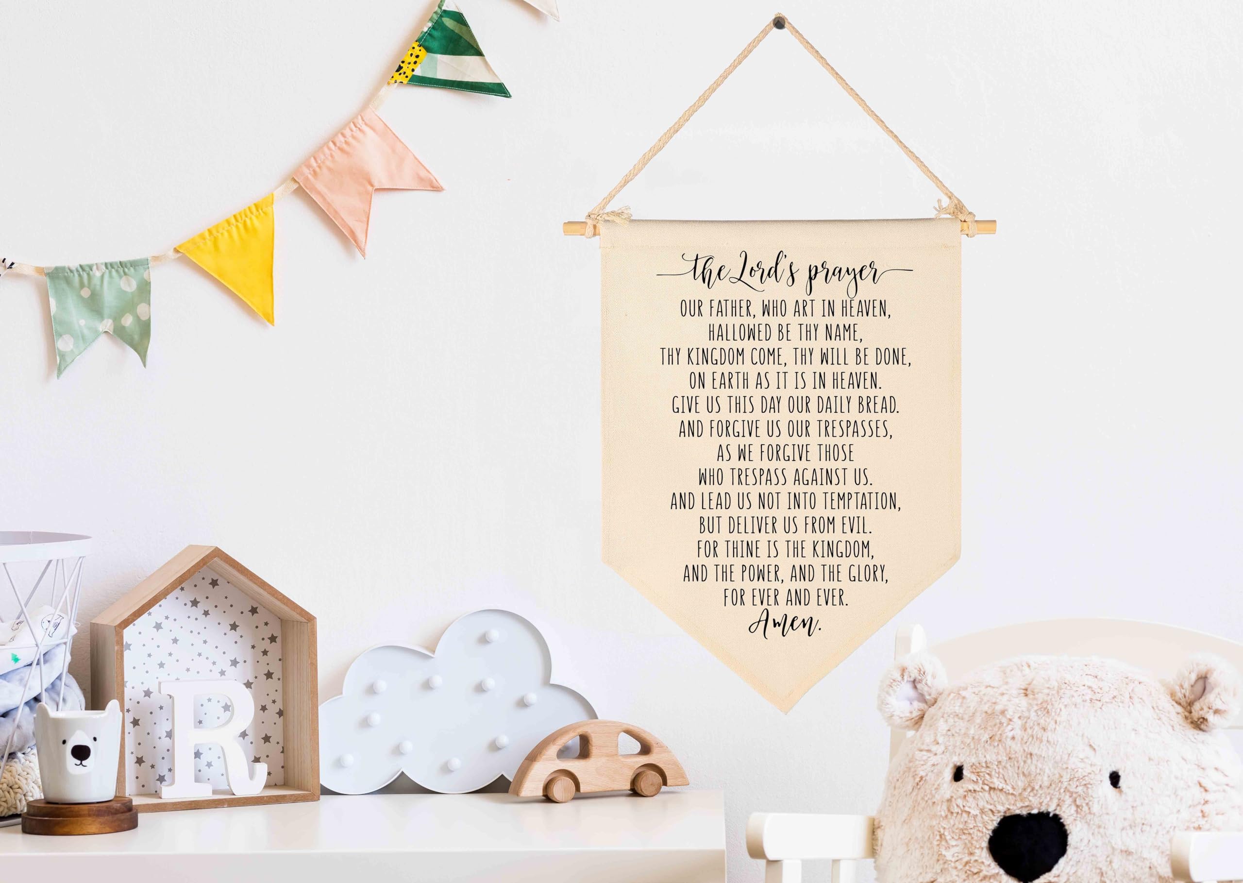 Crafted from natural cotton canvas, this 15.4 x 11 inch nursery wall banner brings a soft and calming touch to baby room, above crib or toddler space. The durable fabric keeps its shape with a natural texture, while the clear print stays bright with everyday use. Lightweight and easy to hang, it comes with a wooden dowel and pre-tied twine for quick setup on walls, doors or shelves. The versatile size fits small spaces without feeling crowded, making it perfect for creating a cozy nursery atmosphere. A thoughtful gift for baby showers, newborn arrival or first birthday.