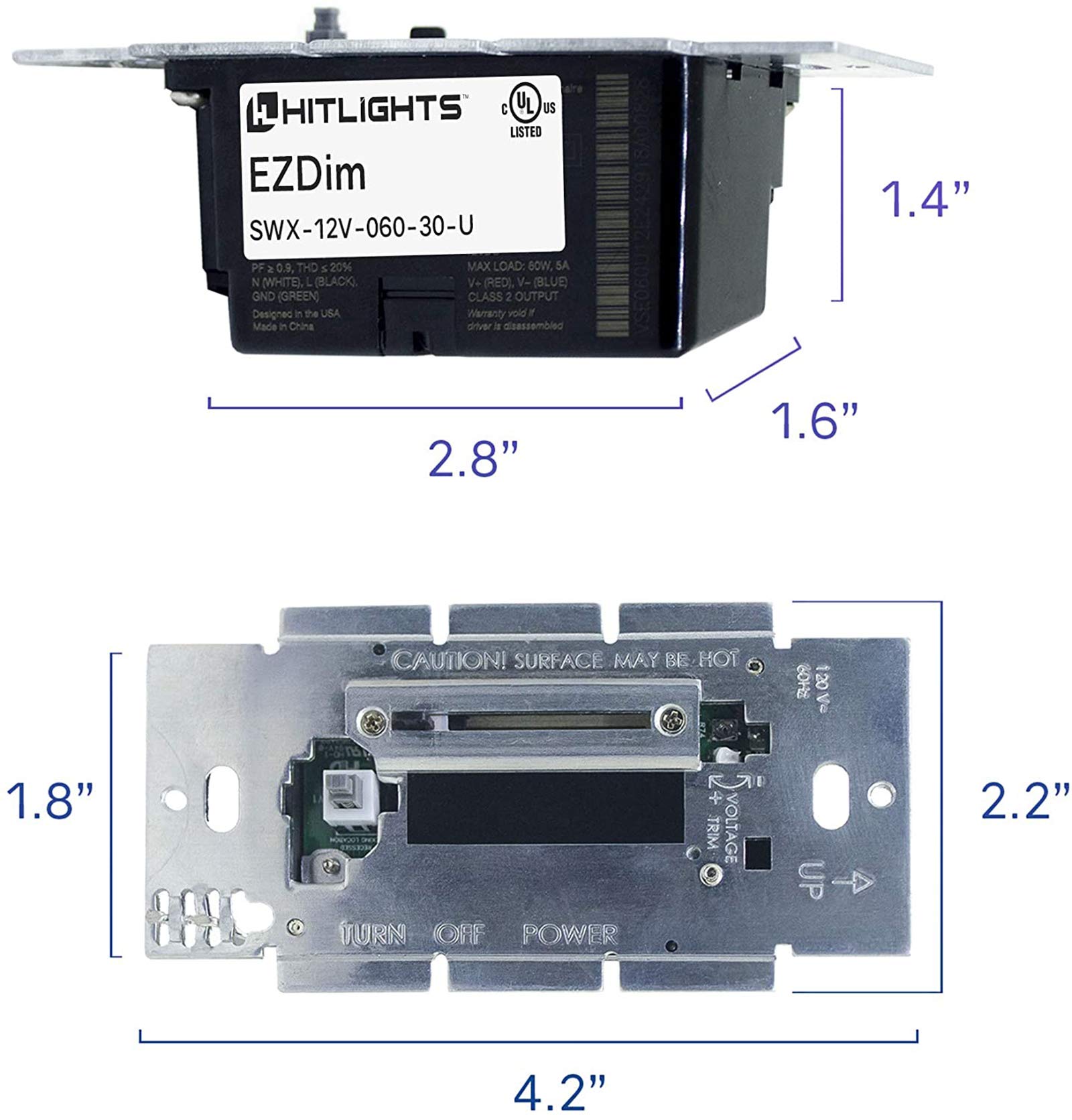 Product Description EZDim Product - First LED Driver + In-Wall Dimmer Switch in one unit, Simplifies LED installation by eliminating compatibility issues between driver and dimmer; Fits in a standard recessed electrical box. 100% - 1% SMOOTHING DIMMING - Output voltage is adjustable via sliding lever, main suapply output voltages remain within the regulation limit of +/- 3%; Short circuit, thermal runway, and over voltage protection. Power failure memory - If power is interrupted, EZDim will return to setting prior to interruption; No derating required when ganging units. Input Voltage - 120VAC (108 ~ 132VAC), 50/60Hz (47 ~ 63Hz), Stand-by Power: ≤0.5W; Input Current: <1.0A @ 120VAC max load. HITLIGHTS QUALITY, UL LISTED, RoHS Certified, CE Certified & MADE IN THE USA and backed by a FIVE year warranty from HitLights for peace of mind; Contact our US-based customer service team at any time for no-hassle troubleshooting and replacement or for any questions about purchasing or installation. Manufacturer Contact Information Made by HITlights: For questions about the product or product usage, please call (855) 768-4135 to contact the manufacturer.