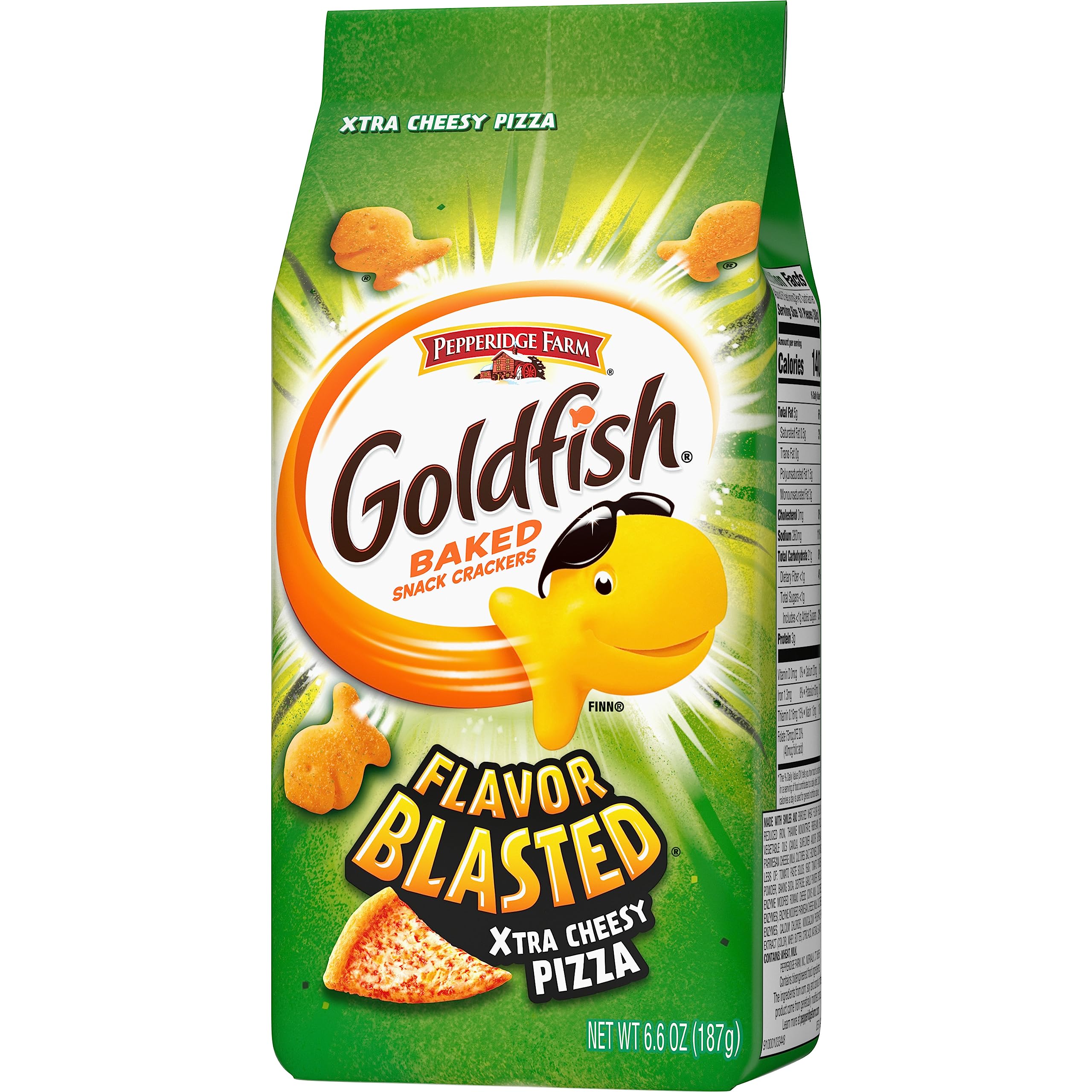 Kick snack time up a notch with the intense flavor of Goldfish Flavor Blasted Xtra Cheesy Pizza snack crackers. Like all of our cheese varieties, theyβre always baked with real cheese, and are made with no artificial flavors or preservatives. So add a little fun to your snack time with this zesty and cheesy snack thatβll keep you coming back for more. They're also the perfect companion to add a crunchy, cheesy excitement to your meals. For lunch, add them to soups, sprinkle them on salads or just simply munch them as a side with your sandwich. Crumble them up and use them to bread chicken breasts for an exciting spin on dinner. From snack time to meal time, there are so many ways to enjoy the goodness of Goldfish. And if you are looking to add a little more flavor in your life, give our Flavor Blasted Sour Cream & Cheddar, Cheddar Jackβd or Xtra Cheddar a try. Go for the handful!