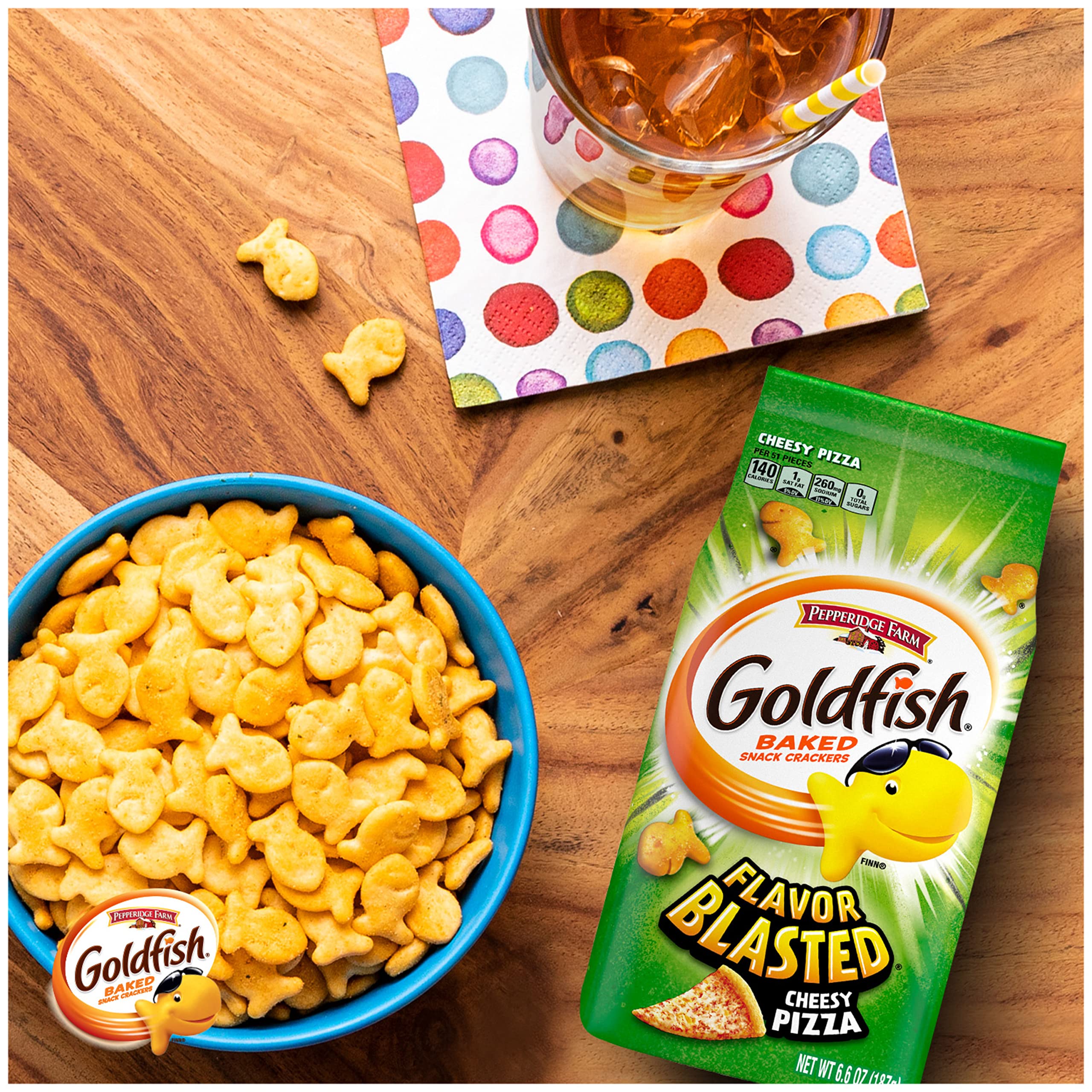 Intense flavor: xtra cheesy pizza flavor blasted Goldfish crackers with bold and zesty taste