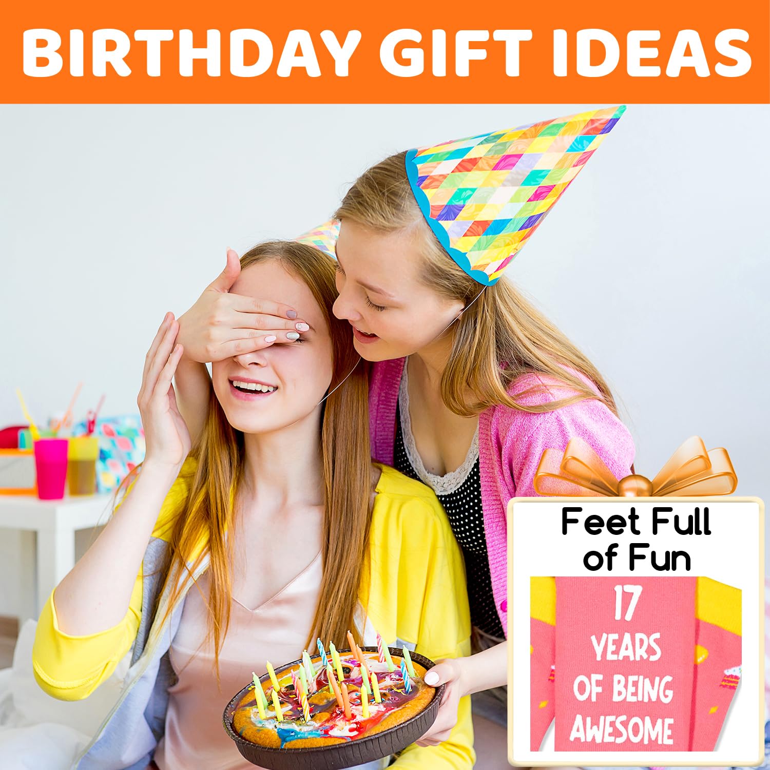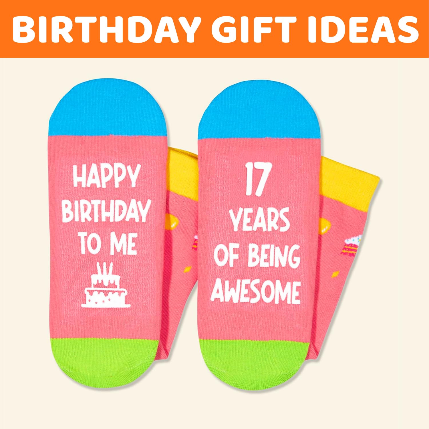 17TH BIRTHDAY GIFTS FOR GRIL: These pink "HAPPY BIRTHDAY TO ME, 17 YEARS OF BEING AWESOME" socks are perfect for teen girls