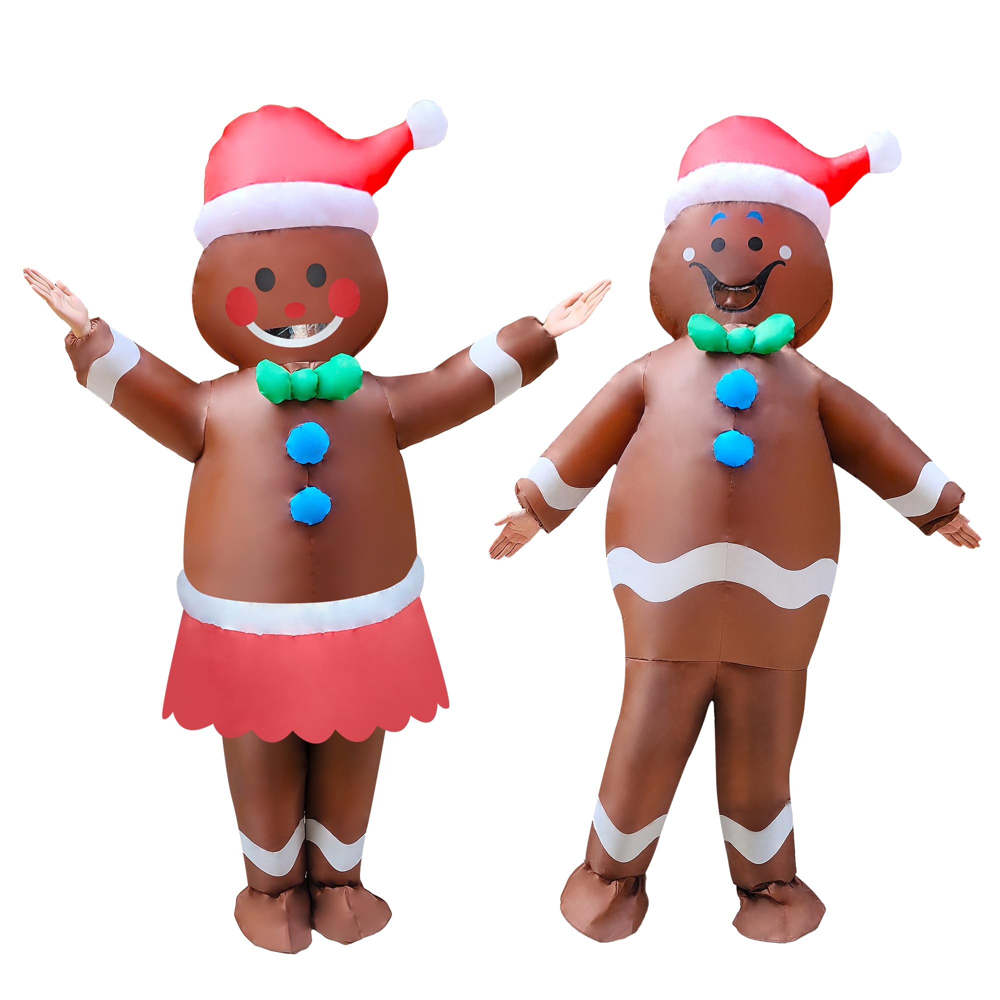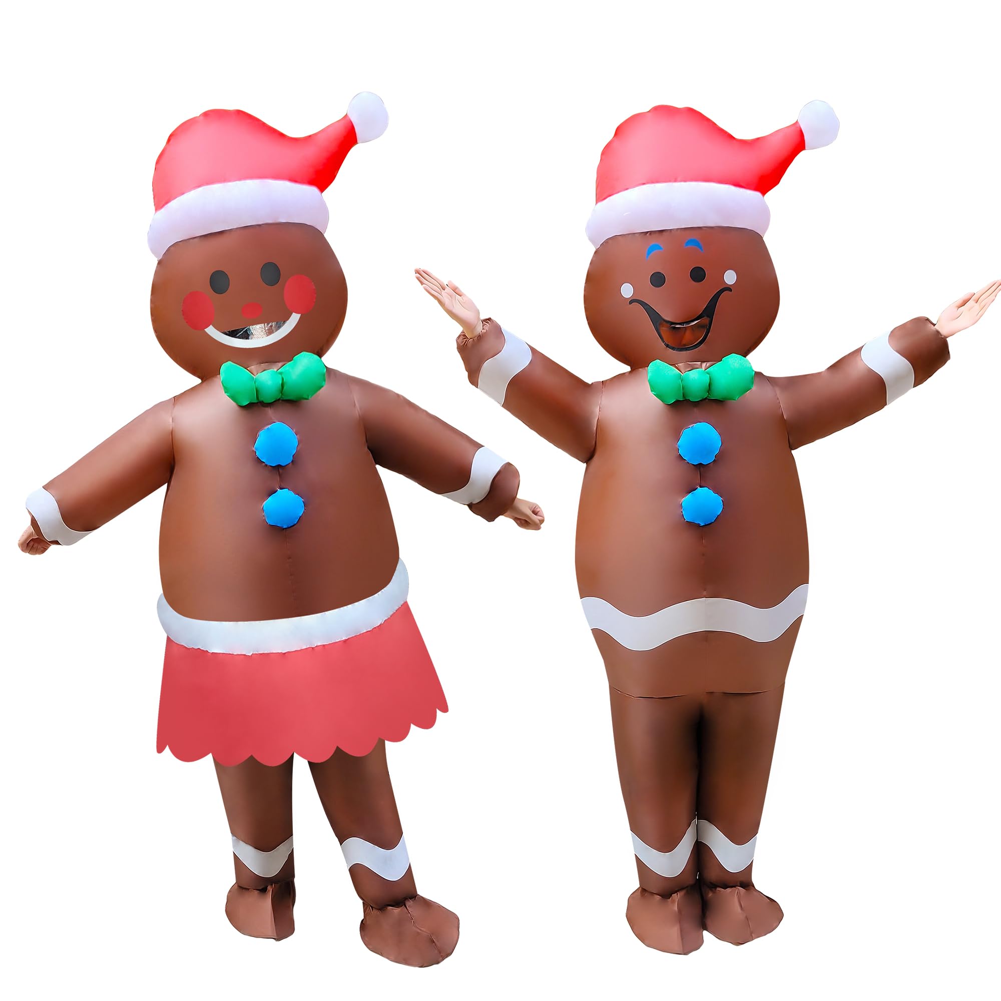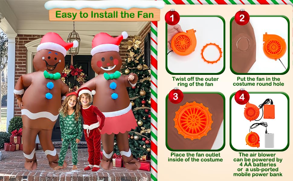 Description Package Includes: 2x Inflatable costume 2x fan 2x battery holder Product detail: Material : Polyester Special use:Christmsas Costume, Halloween costume for Adult Suitable range: Company, bars, clubs, dance party, parks, television programs, supermarket chains, hotel chains, the annual event, carnival, opening ceremonies, weddings. Installation instructions: 1: Put in 4 AA batteries in battery pack, then fix the cover . 2: plug in power cord from battery-pack to fan. 3.Step into costume and clip battery pack to your own clothing. Move battery-pack switch to ON position. It wil take about some minutes to inflate the costume.