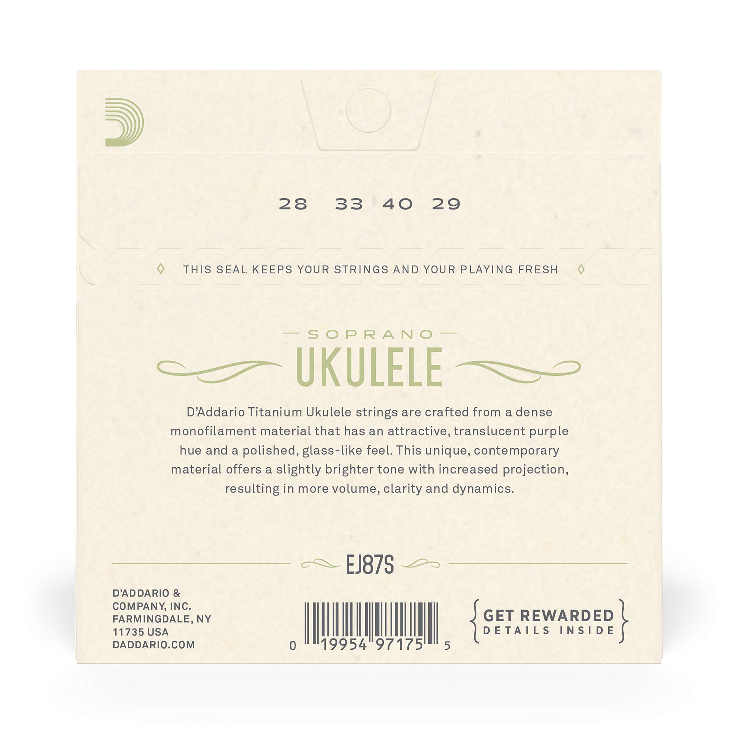 D'Addario EJ87S sets are designed for use with all soprano ukuleles. Each string within this set is made from our bright sounding titanium material and optimized for GCEA tuning.D'Addario Titanium Ukulele strings are crafted from a dense monofilament material that has an attractive, translucent purple hue and a polished, smooth feel similar to nylon. This unique material is particularly beneficial to Ukulele's due to its slightly brighter tone and increased projection, resulting in more volume, clarity and dynamics.D'Addario, the world's largest manufacturer of musical instrument strings, is known as The Players Choice with a reputation for unsurpassed quality and consistency. D'Addario's innovative, environmentally friendly packaging reduces waste and provides protection from corrosion. All D'Addario strings are manufactured in the U.S.A. using proprietary, digitally controlled, state-of-the-art machinery for unmatched performance, set after set.