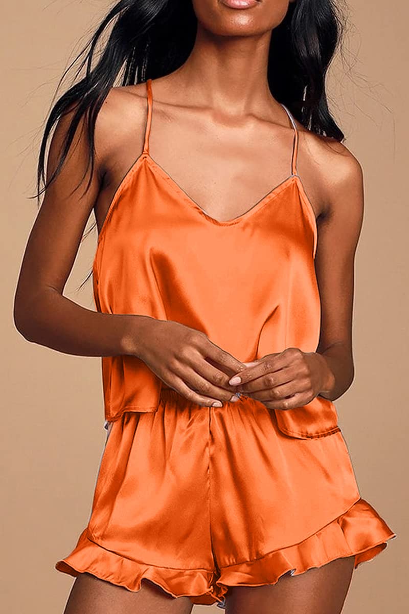 The cute satin silk cami pajamas tops features v neck,low cut,racerback,adjustable straps,the shorts features high waisted,elastic waist,casual loose style.The cute and sexy pajamas sets will make you look more flattering,elegant for your sweet night.