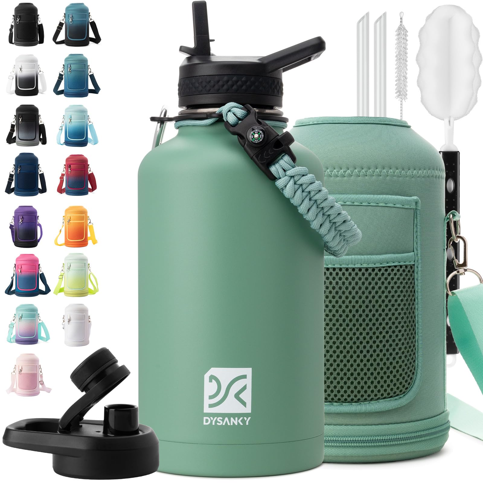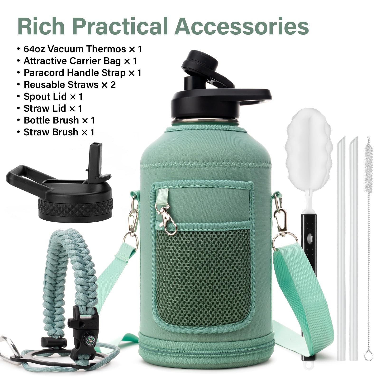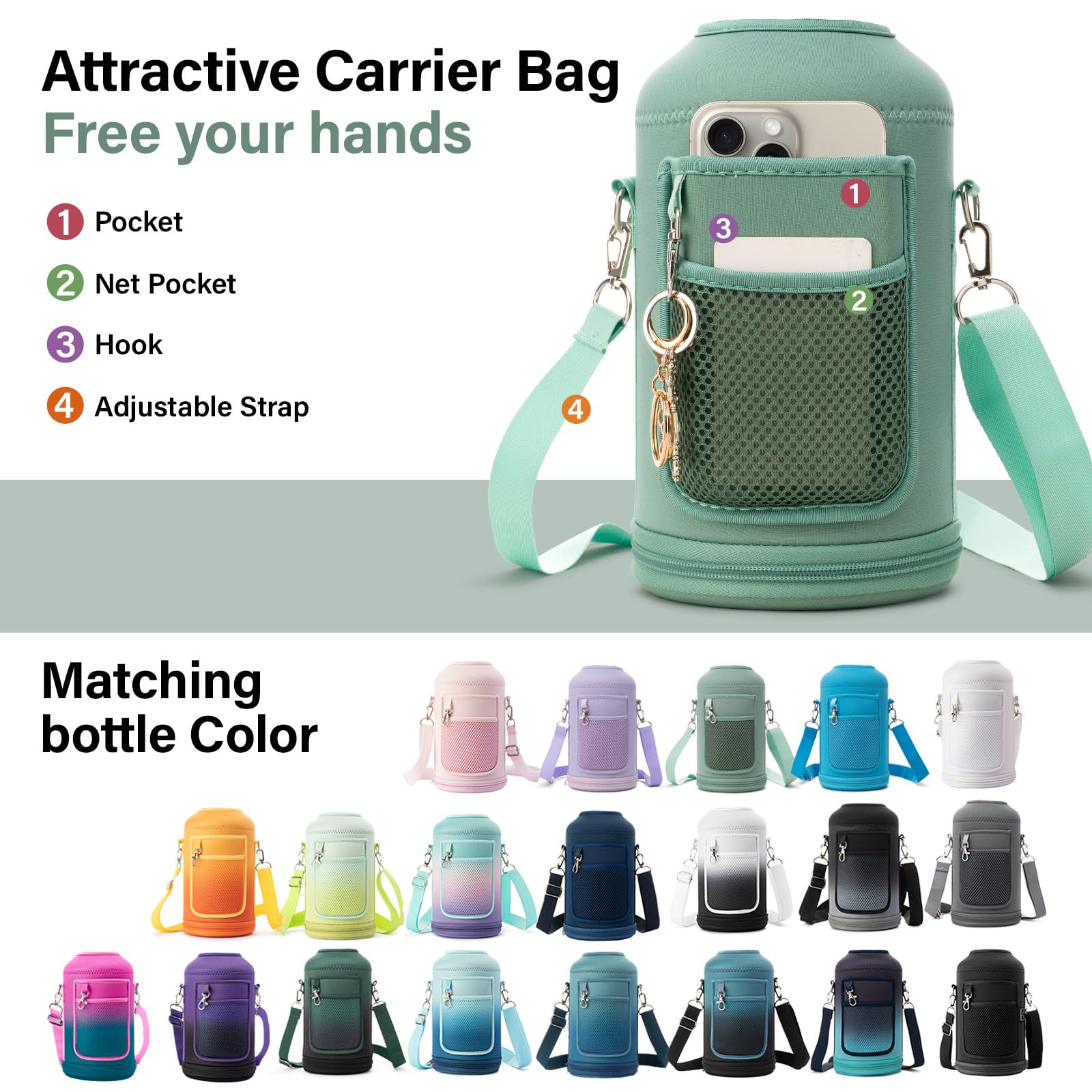 VERSATILE AND STYLISH CARRIER BAG:The colorful water bottle carrier bag is designed to match the bottle's body, adding a touch of flair while providing practical functionality. The shoulder strap and carabiner make it easy to carry and hang, whether you're out on a hike or running errands. Plus, the small storage bag for your phone and a hook for keys make this bottle even more versatile.