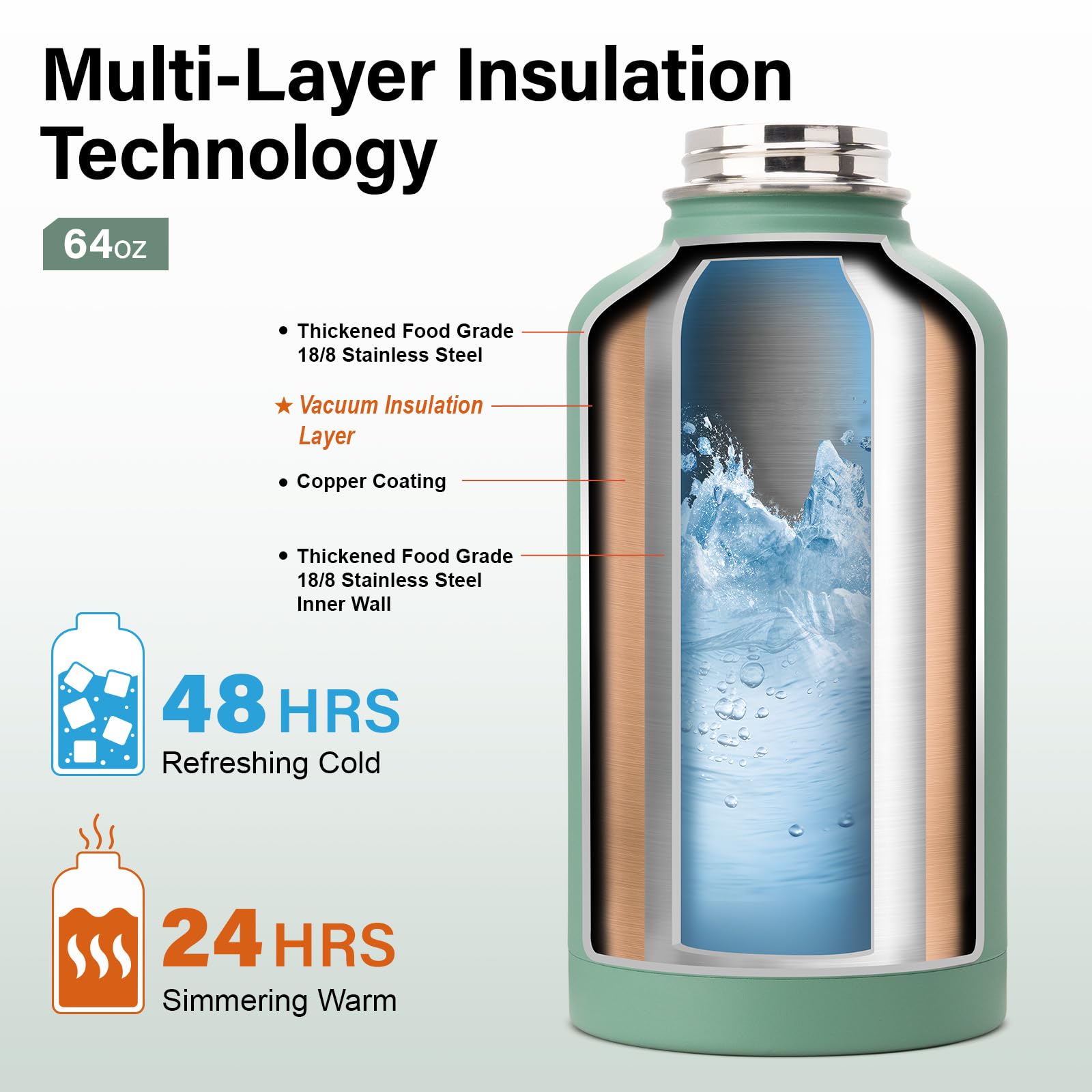 THE MULTI-LAYER INSULATION TECHNOLOGY FEATURES: the first layer is a thick food-grade 18/8 stainless steel inner wall; the second layer has a copper plating that reduces heat transfer; the third layer is a vacuum layer that prevents heat loss. As a result, you can enjoy an insulated water bottle that keeps beverages cold for up to 48 hours and hot for up to 24 hours, making it perfect for any adventure, whether it's a long hike or a busy workday.