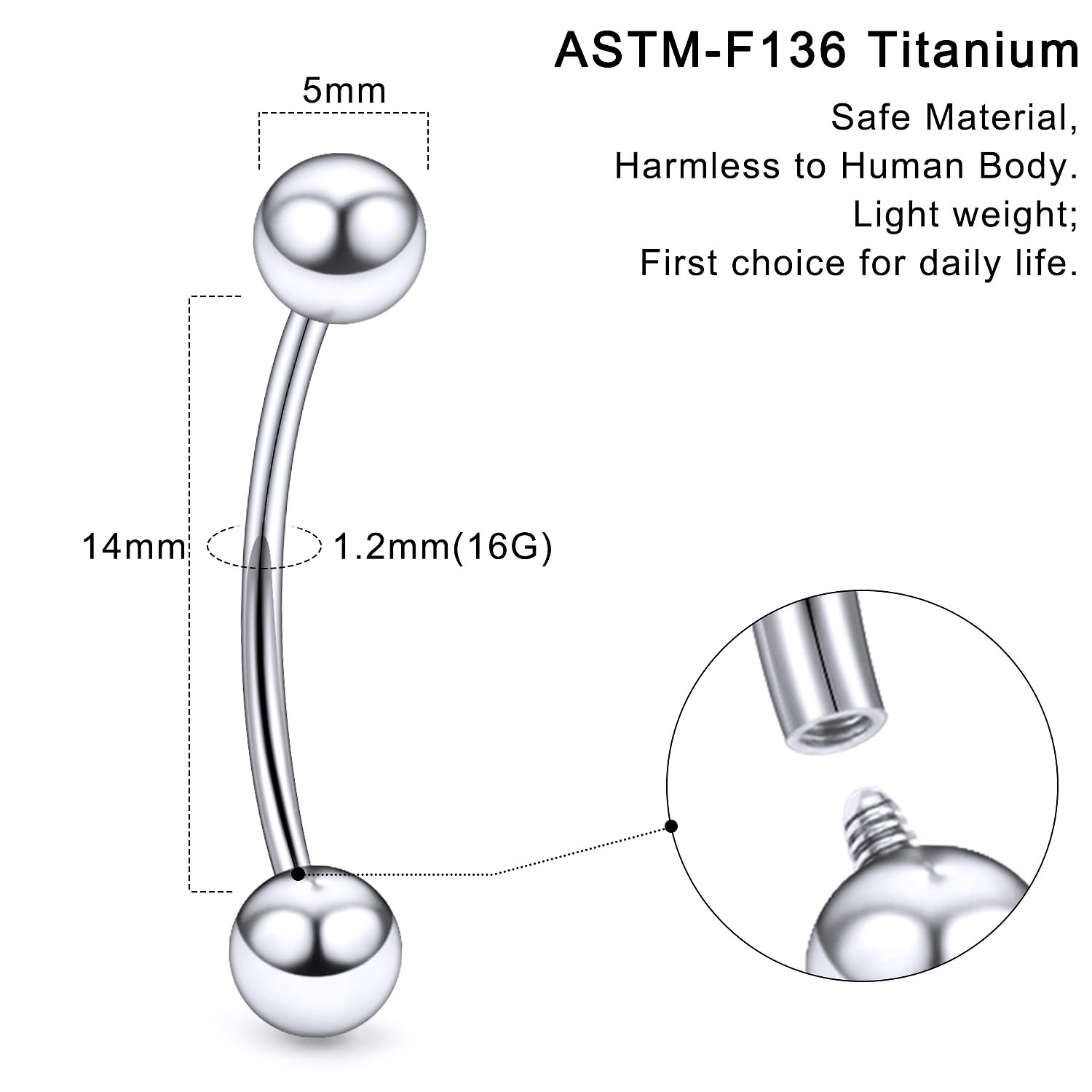 【Multiple Uses】: Titanium internal thread Curved Barbell Piercing Used as Eyebrow Piercing Jewelry, Anti Eyebrow Piercing Jewelry, Vertical Labret Lip Jewelry, Rook Earrings, Bridge Piercing Jewelry, Small Blley Button Ring, Navel Rings, Frog Eyes Piercing Jewelry, Snake Eyes Tongue Rings, Snake Eyes Piercing Jewelry, Vertical Hood Piercing Jewelry, Surface Tragus Piercing Jewelry, VCH Piercing Jewelry.