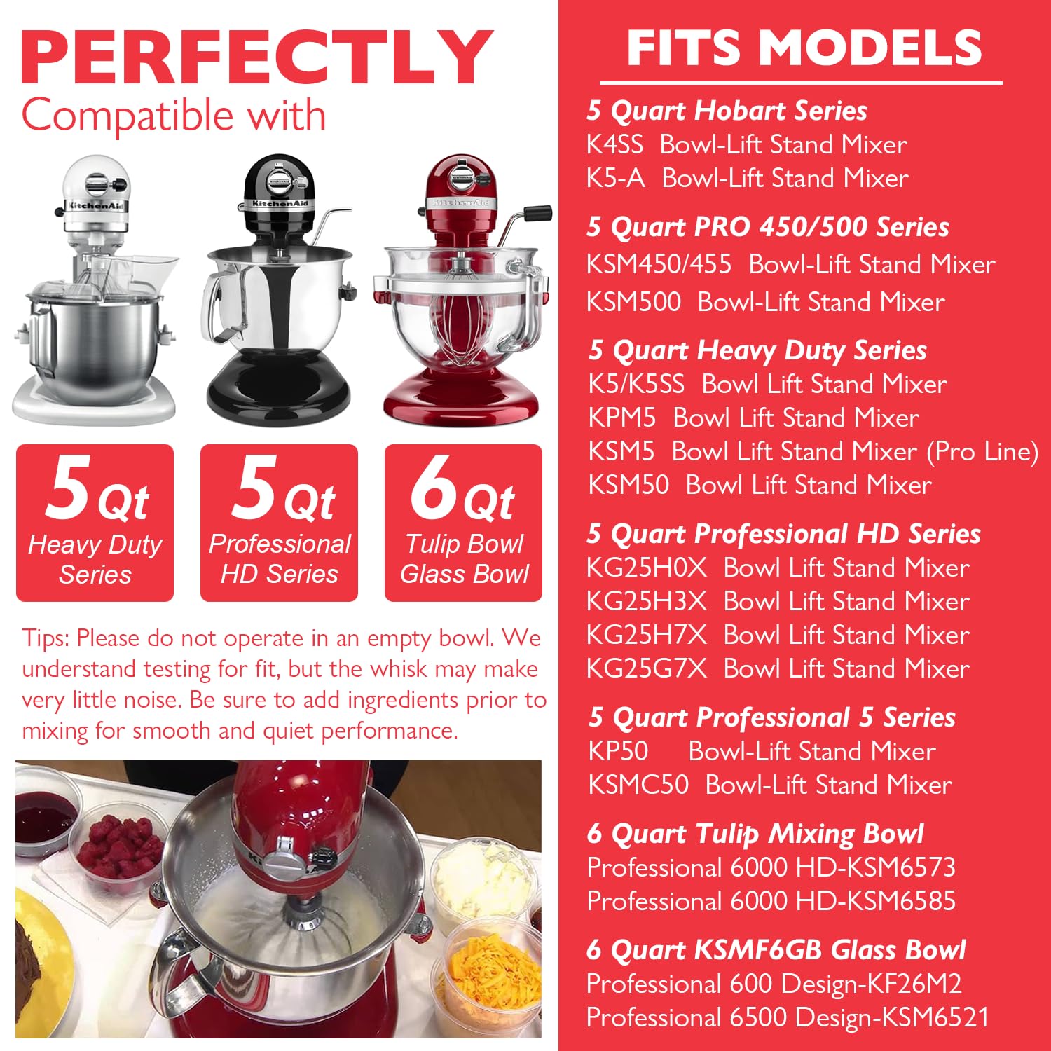 🌟【Design for KitchenAid】This whisk compatible with Kitchen Aid 5 Quart bowl lift stand mixer. Include model: K4SS, K5-A, KSM450/455, KSM500/550, K5/K5SS, KP50, KSMC50, KMP5, KPM50, KSM5, KSM50, KG25H/KG25G, PROFESSIONAL 6000 HD KSM6573(with a tulip mixing bowl), Pro 600 Desigh KF26M (with a glass bowl).