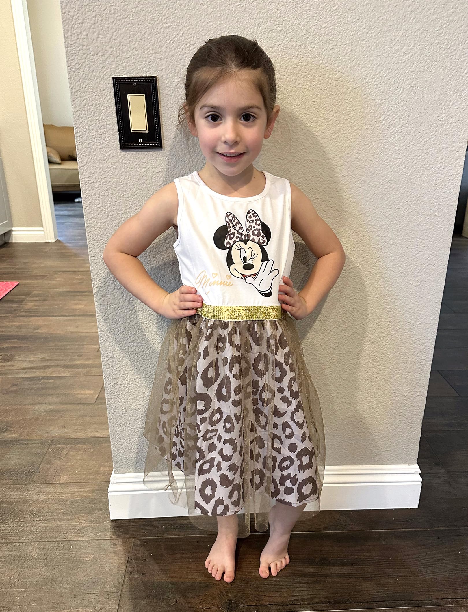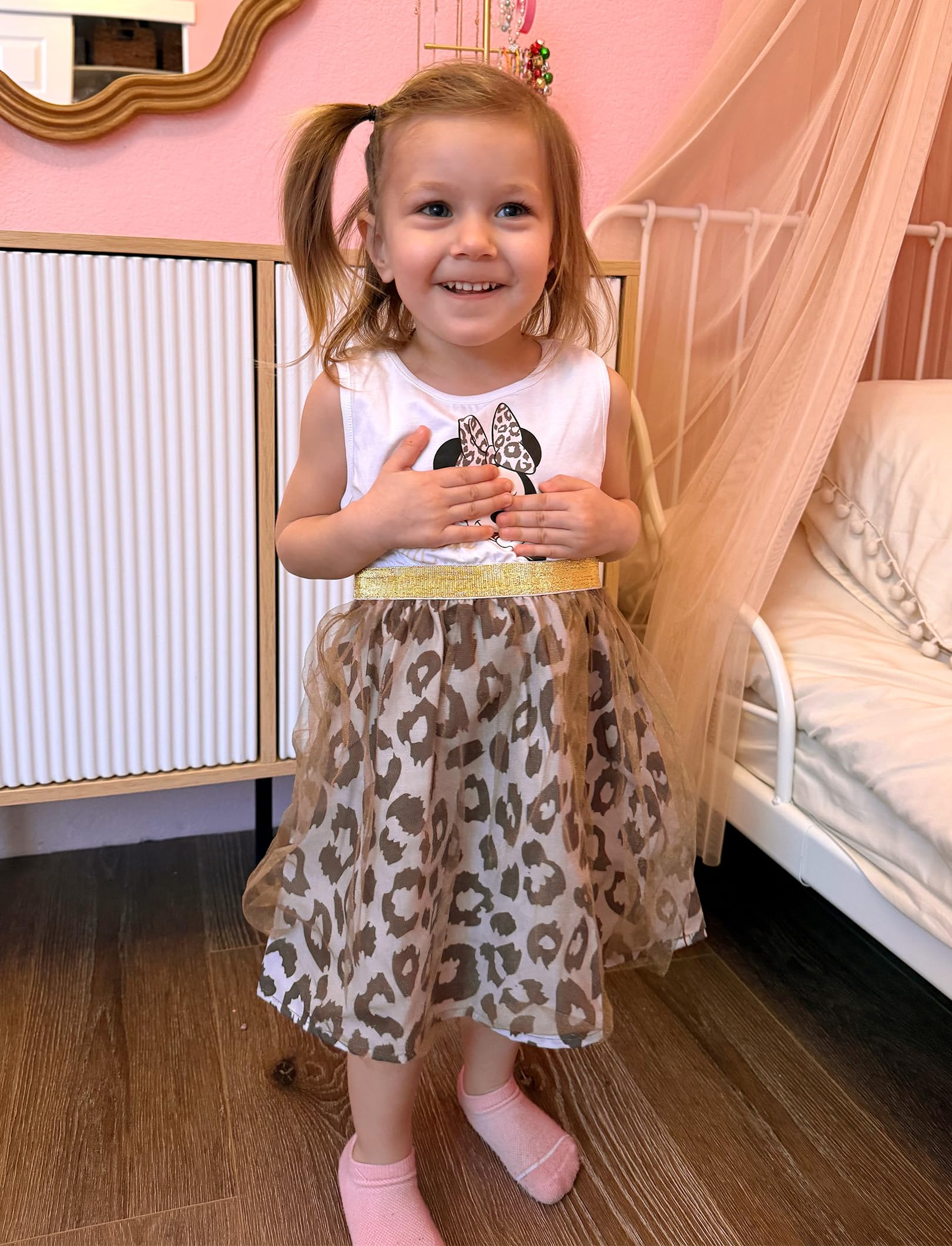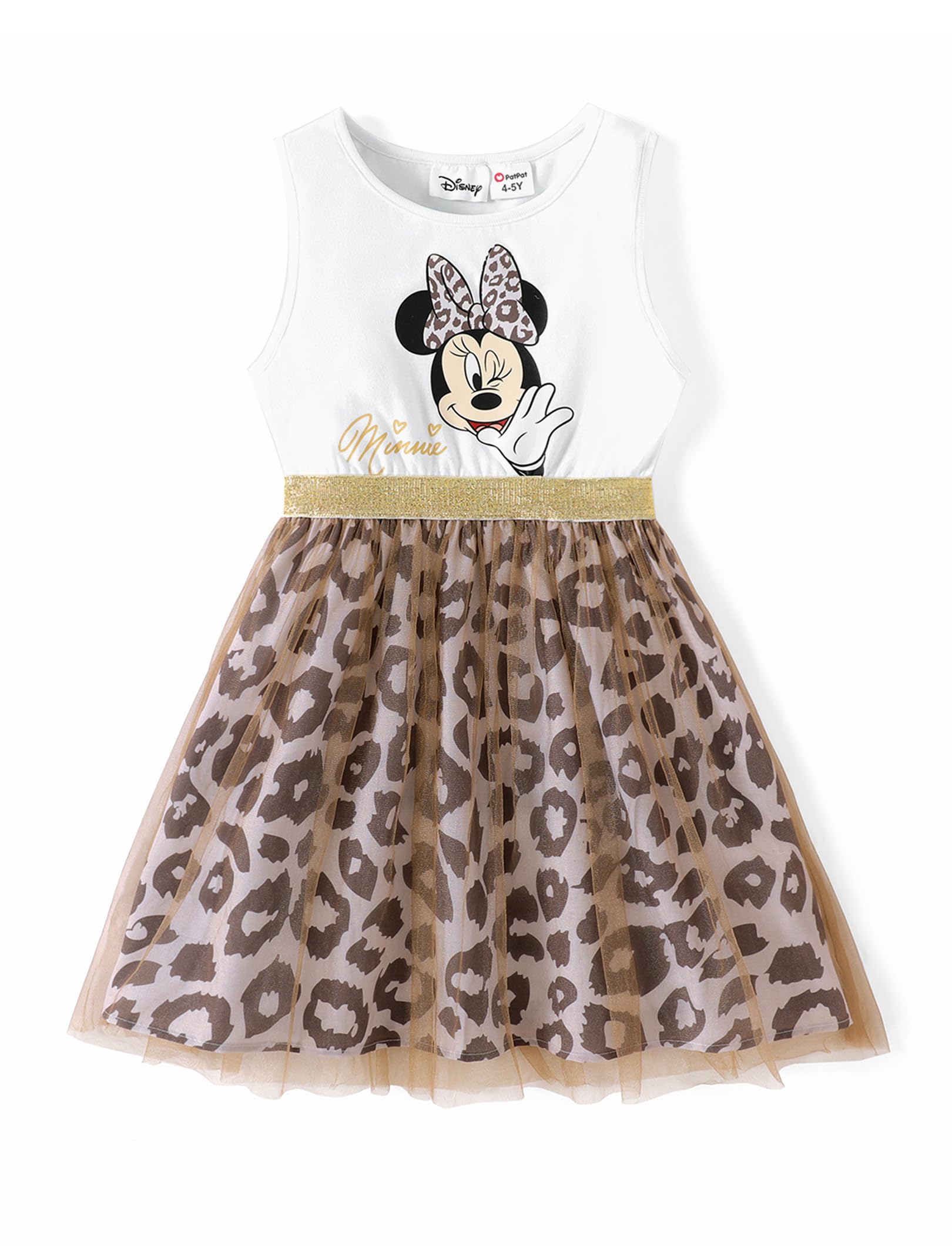 Charming Design: This sleeveless dress features a loose fit for comfort and practicality. The design showcases Minnie Mouse with a chic leopard-print bow, paired with a golden glitter waistband and a stylish leopard-print tulle skirt for a trendy, playful look. With its fit-and-flare silhouette and breathable fabric, it ensures all-day comfort for little girls