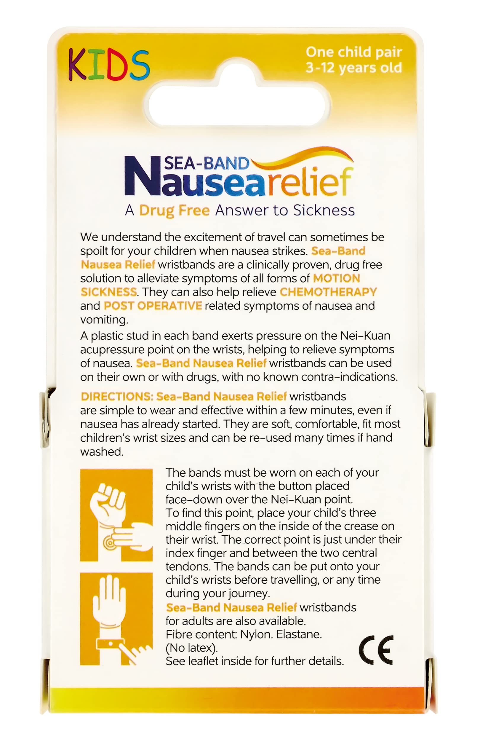 Sea-Band Nausea Relief wristbands are a drug free solution to alleviate symptoms associated with all forms of Motion Sickness, They can also relieve Chemotherapy and Post Operative related symptoms of nausea. A plastic stud in each bands exerts pressure on the Nei-Kuan acupressure point on the wrists, helping to relieve symptoms of nausea.