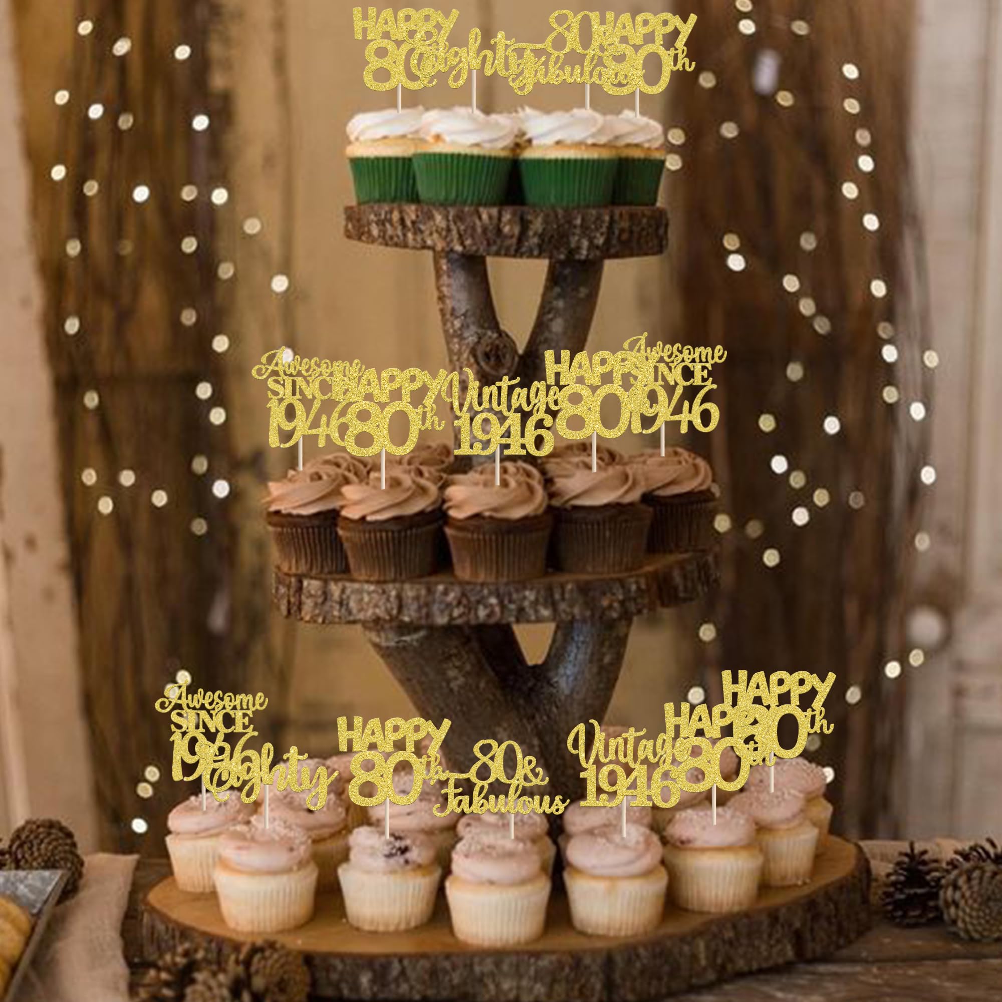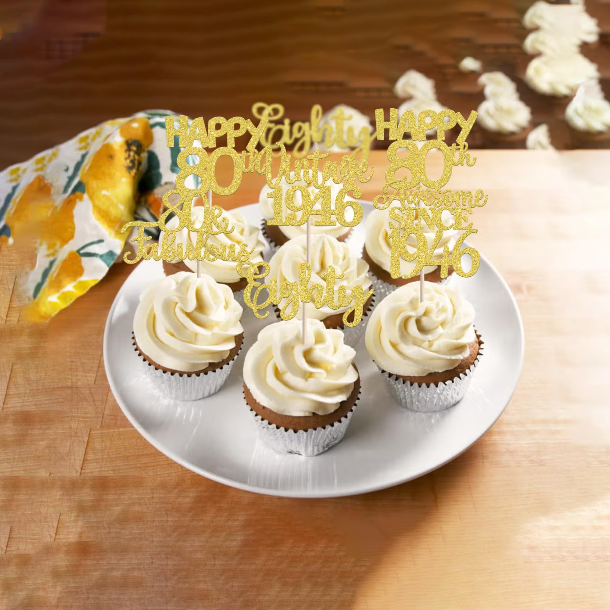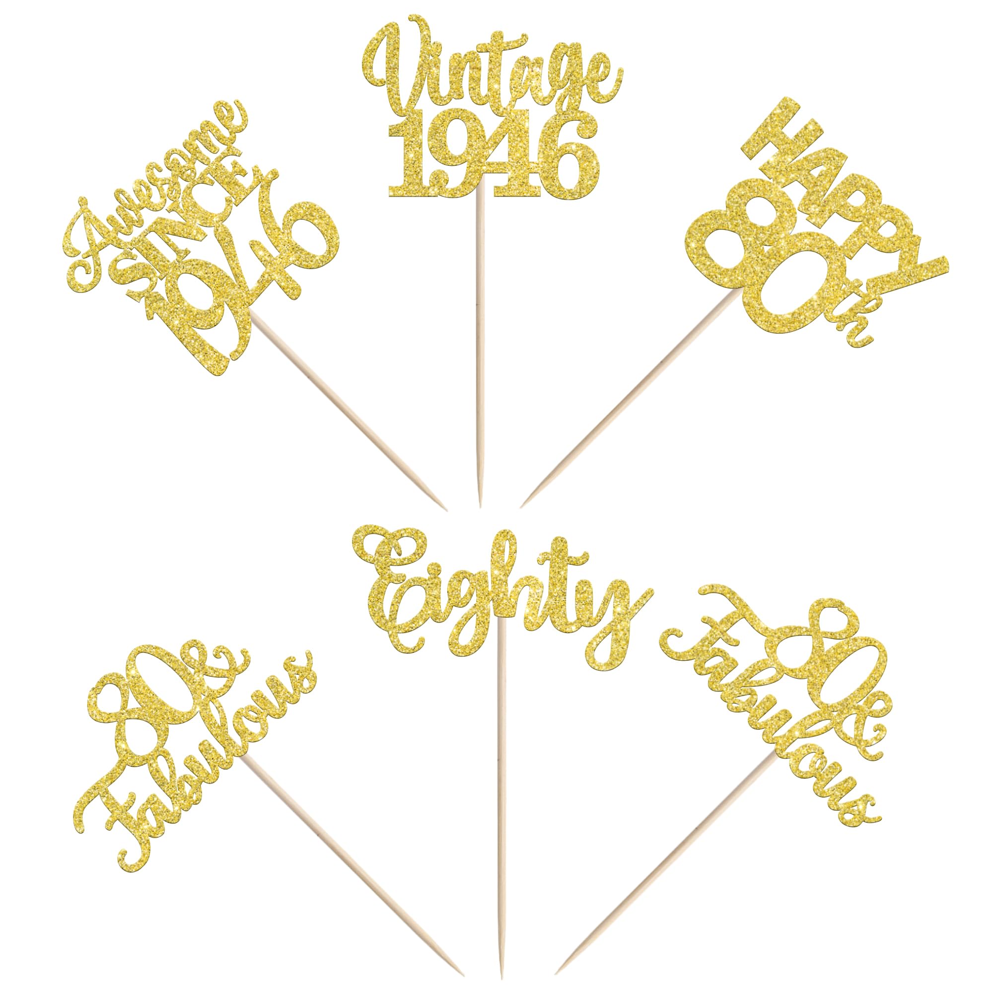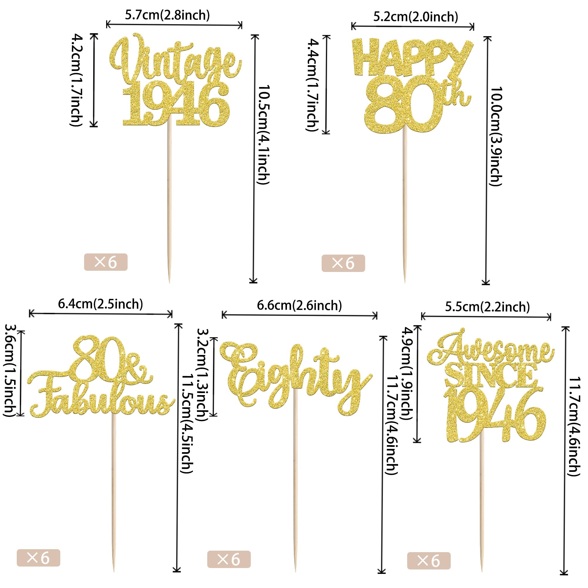 Vintage 1945 Happy 80th Birthday Party Cupcake Toppers Decoration Supplies Perfect for vintage 1945 theme party, 80th birthday theme party, 80th wedding anniversary theme party,cheers to 80 years theme party cupcake decorations supplies. Pack of 30 pcs,6 pcs of each design The size is 2.2*4.3/ 2.5*4.3/ 2*4.3/ 2.2*4.5/ 2.6*3.7 inch ( with stick ) Made of high quality paper card stock,thick and thick and sturdy. These cupcake toppers are single glitter, the back is white, and they are intended for decoration only, please do not put them in oven or microwave. If the item you received has any defects, please contact us fimmediately.we will deal with it within 24 hours.