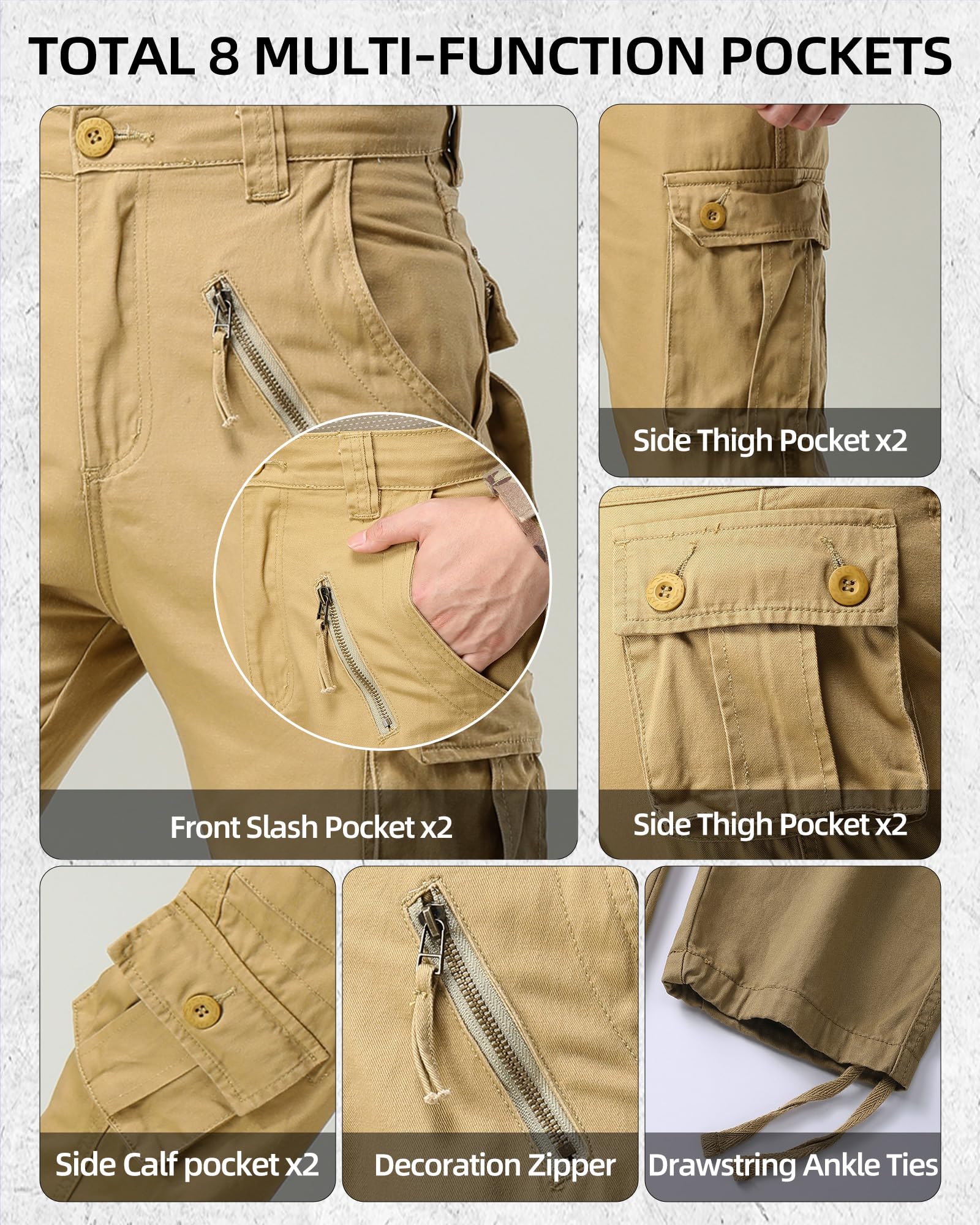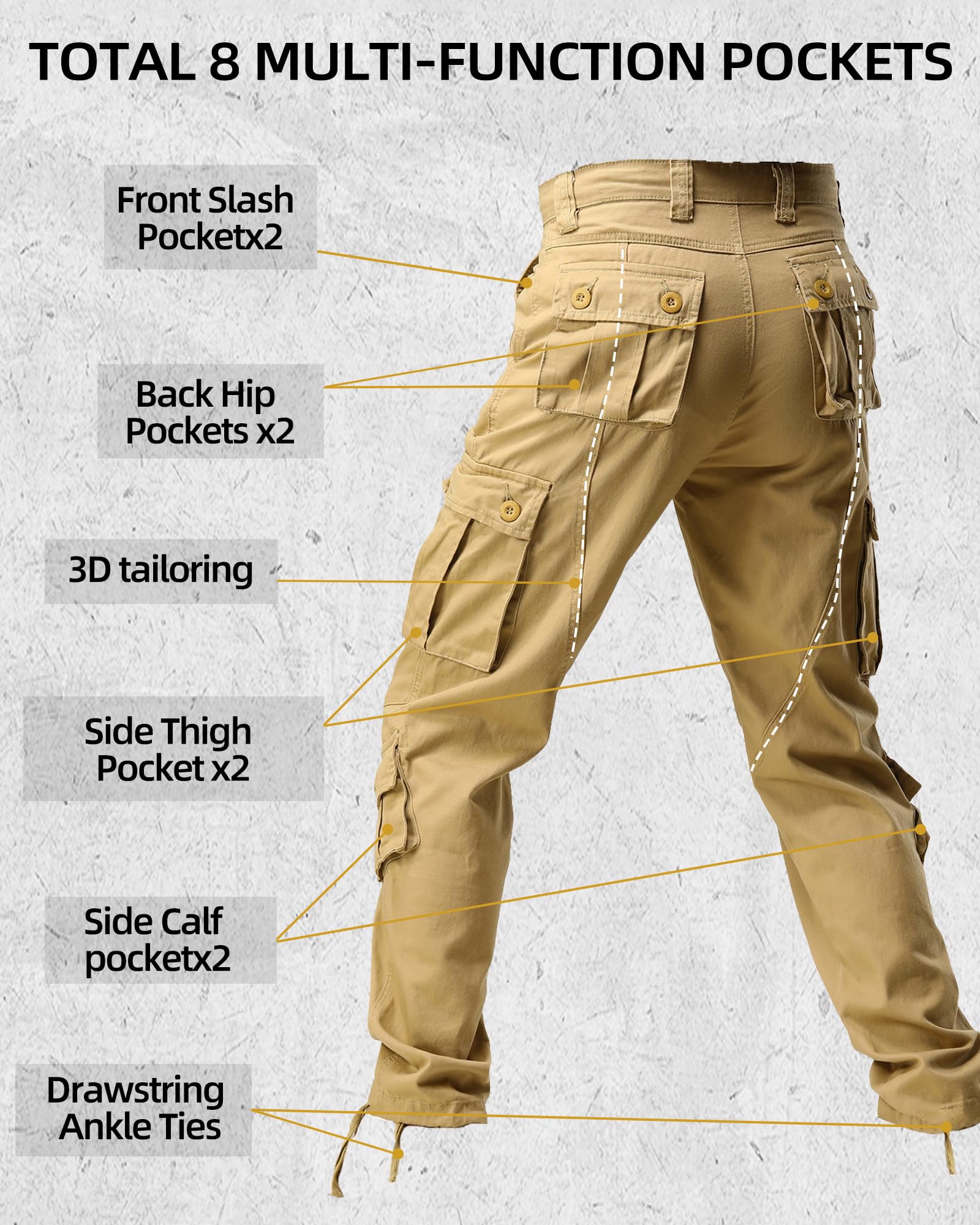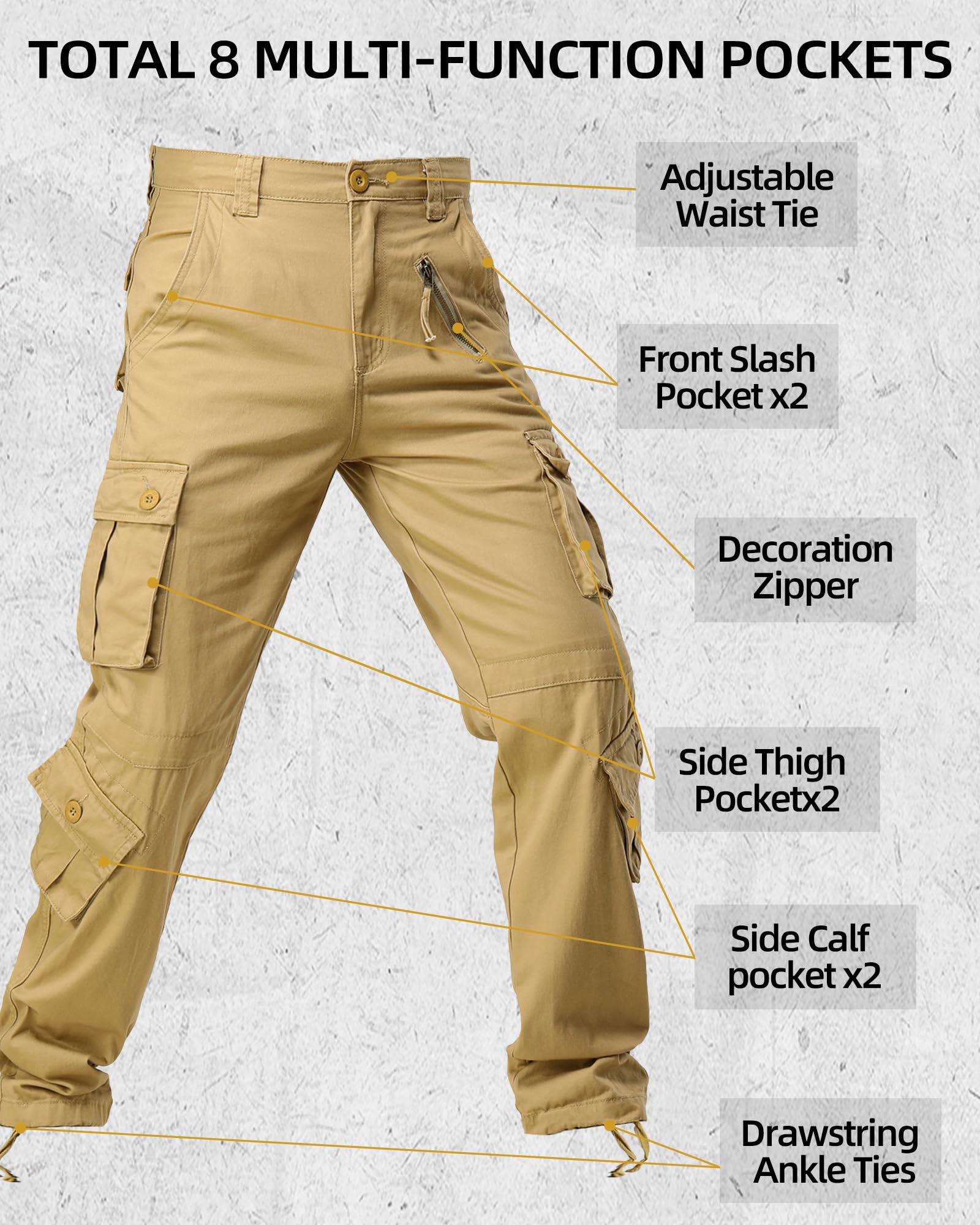 Product Material: Solid and camo cargo pants for men use 100% cotton fabric, treated for ease of care with a wrinkle-resistant finish and durability,it features non-slip, durable, comfortable, abrasion-resistant soft,breathable and sweat-absorbent,can repel the stains, liquids and soil keep you all day dry and clean.Relaxed fit military pants with zipper closure and straight leg,drawstring tie inside the ankle and the waist for comfort fit.