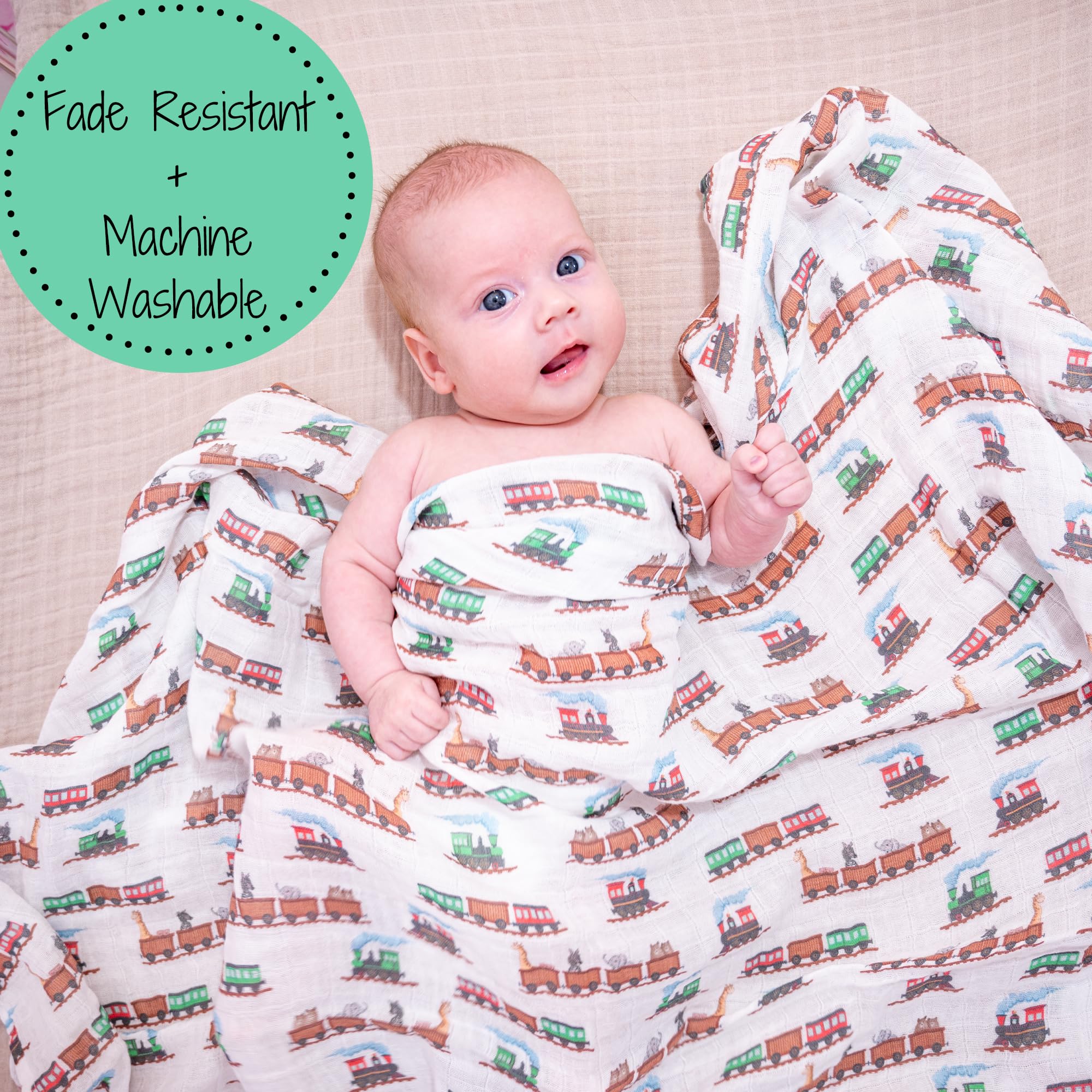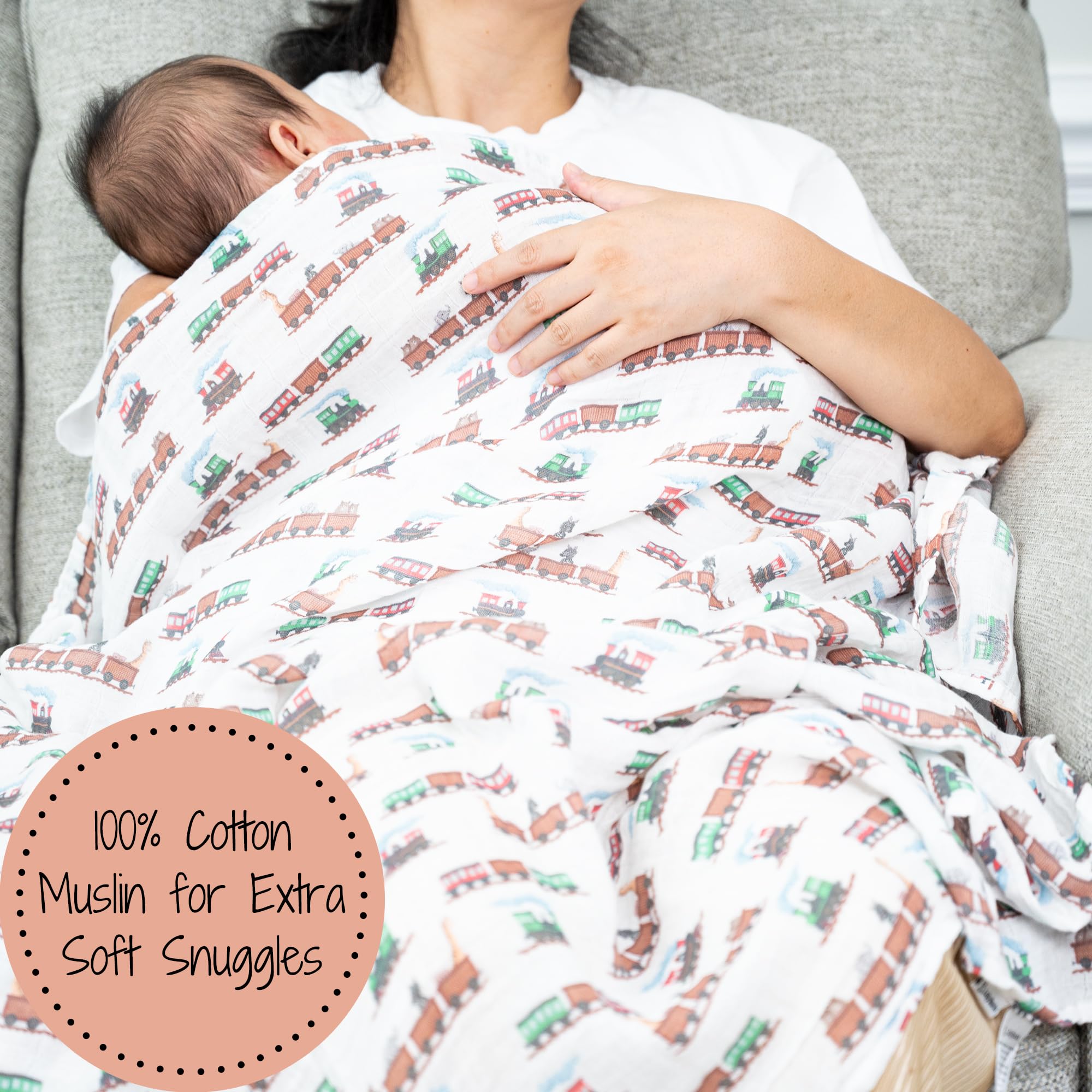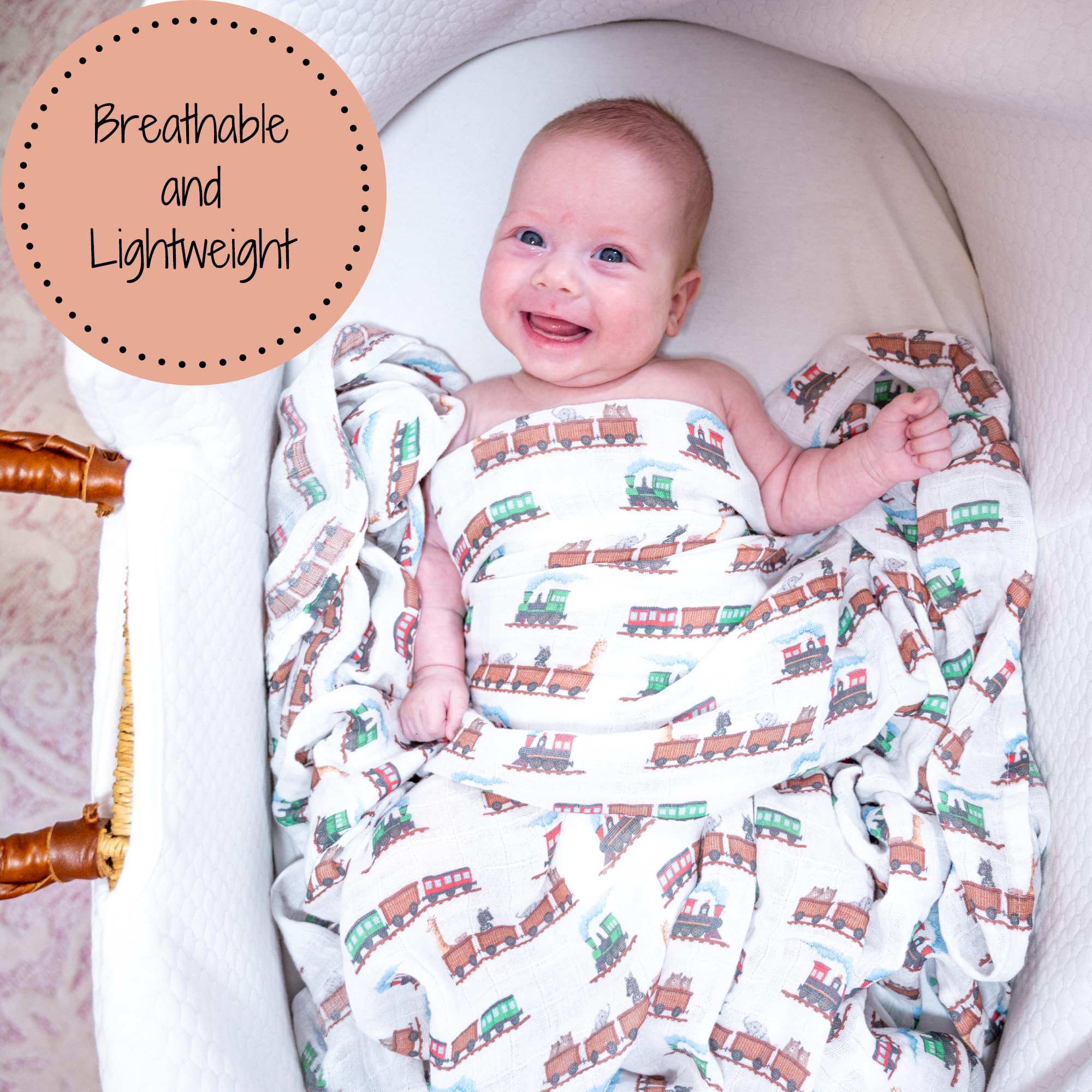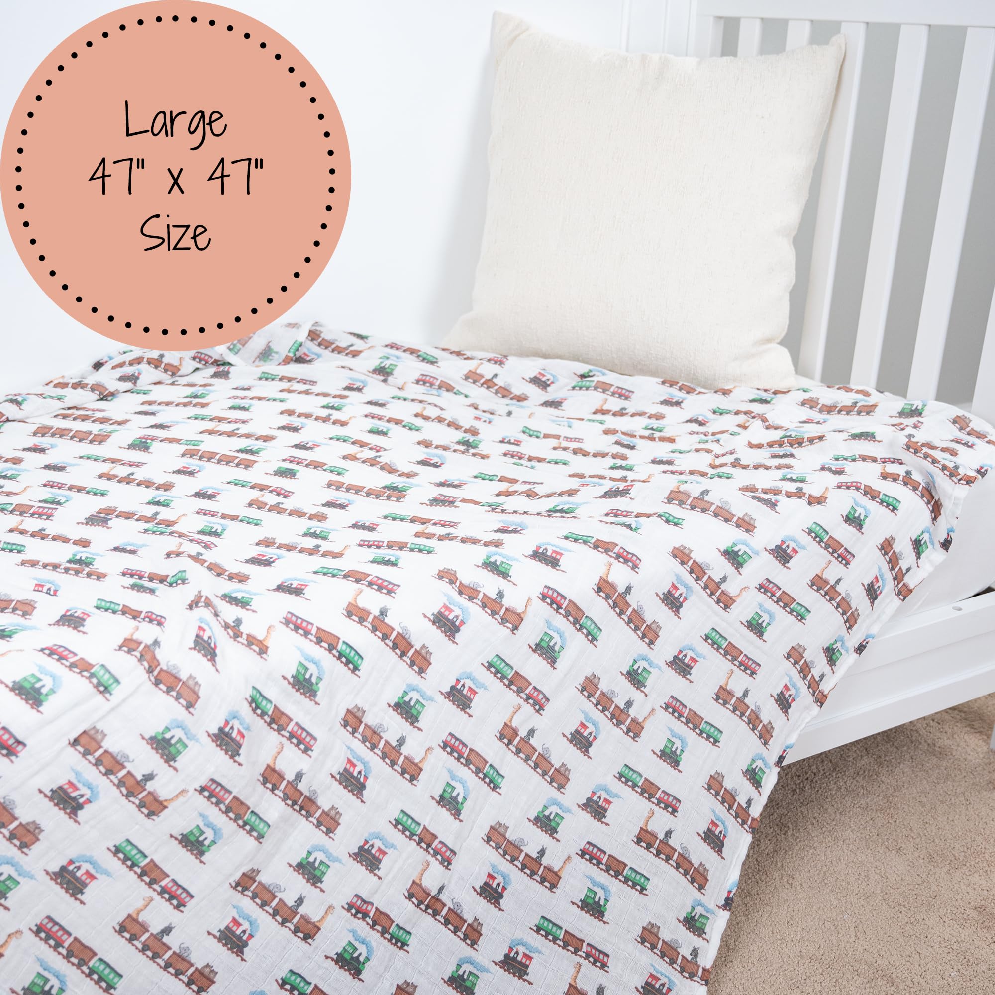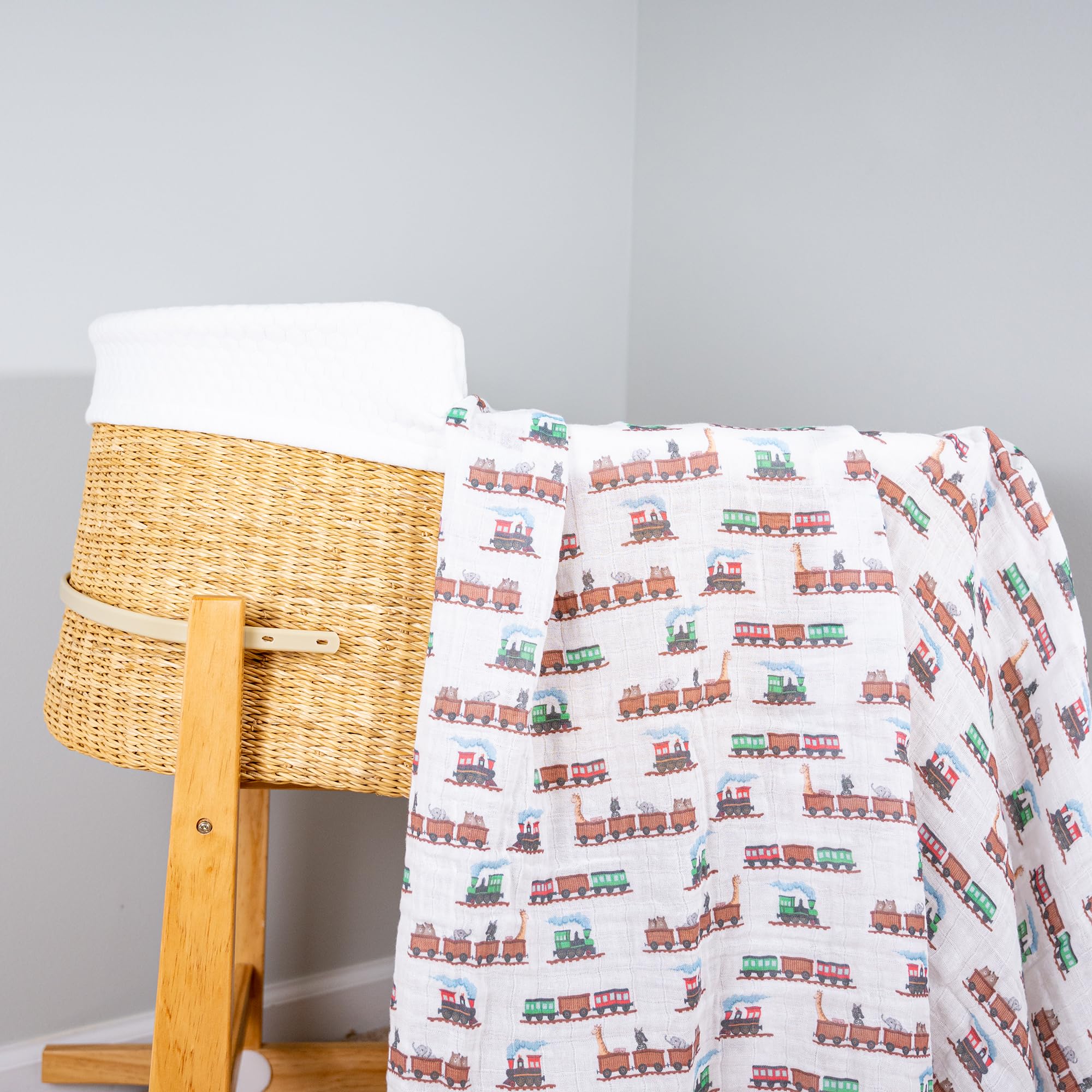 ANIMAL TRAIN - Ride into cozy comfort with this muslin swaddle blanket printed in colorful animal train designs. A fun nursery essential that wraps your baby in breathable softness from nap to playtime