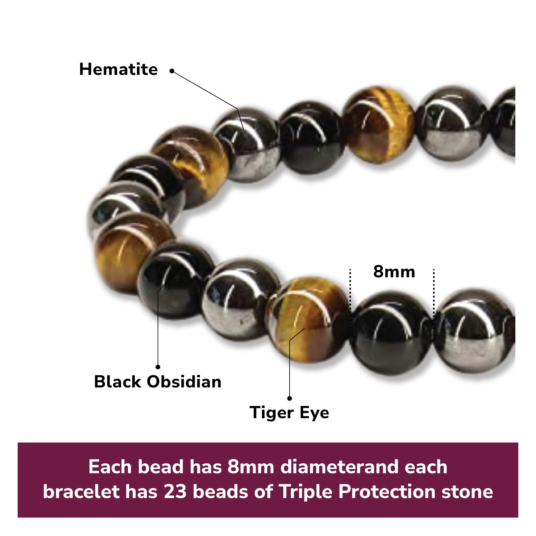 β PHENOMENOL PROTECTION ENERGY - Tigers eye crystal supports mind and body and helps in releasing fear and anxiety. It provides courage and self confidence and protects against negative energy. Black Obsidian have strong healing properties that provides power to face fears, absorbs negative energy and transforms stress into positivity. Hematite is a well-known protective and grounding power stone which dispels negativity and filter the emotional stress in the body