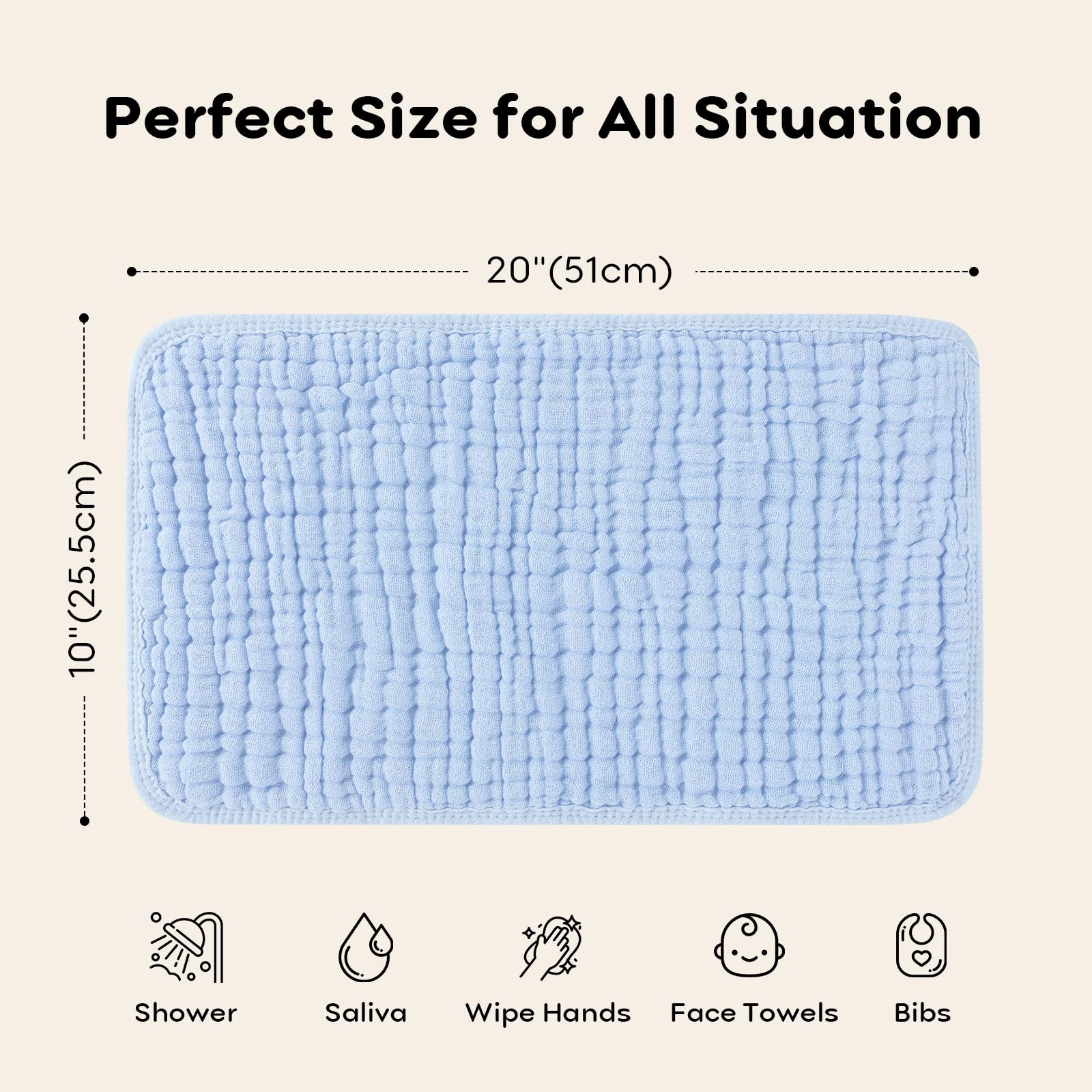 MULTI-FUNCTION - 20x10 inches, our muslin washcloths will be your favorite daily essentials as reusable baby wipes, burp cloths, baby face towels, cloth diapers, body washcloths, adult face towels and anything else that's available. Perfect 6pcs meet your baby's different need.