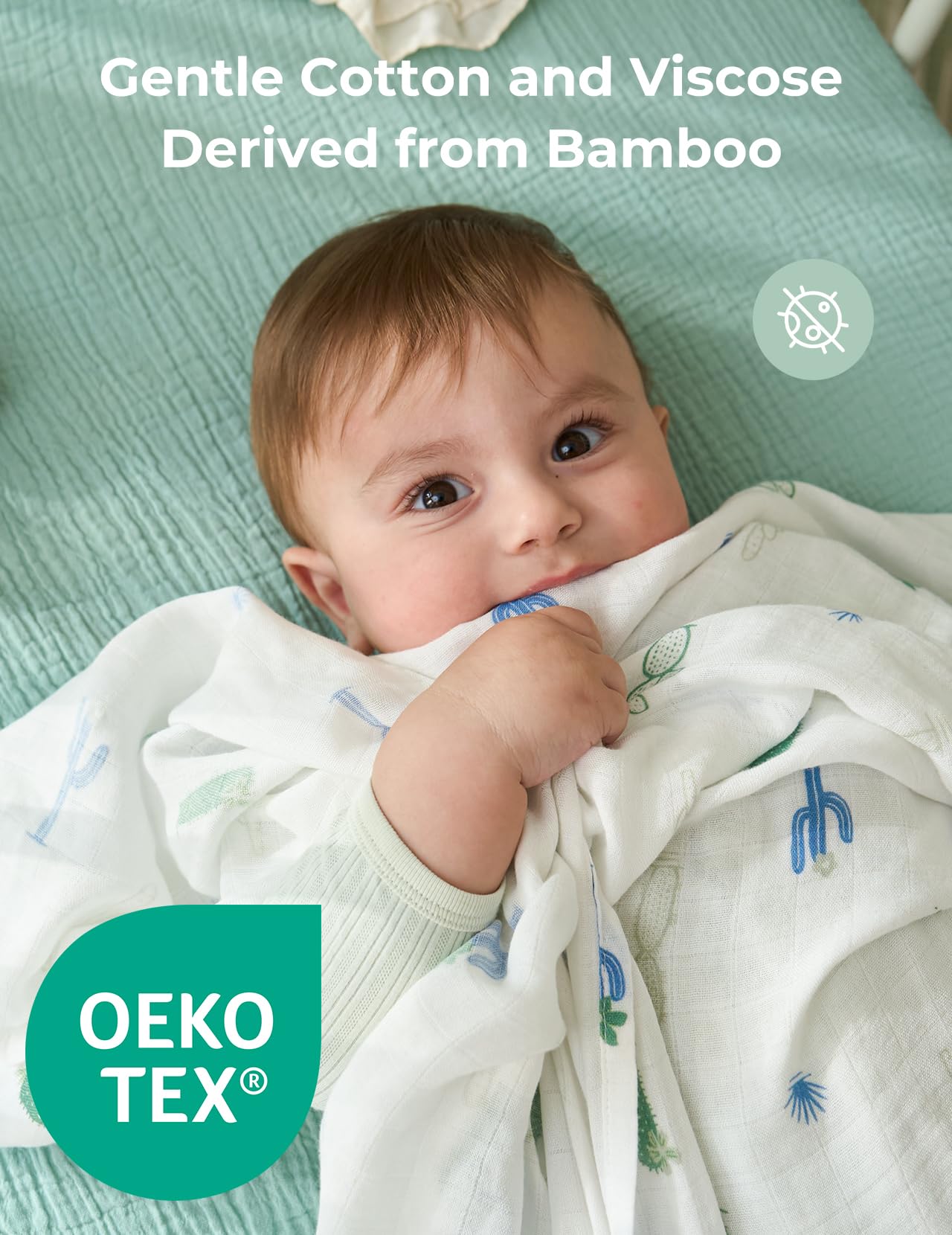 【Silky Texture Material, Softness Makes Gentle Love for Baby's First Born】 Momcozy practical ultra soft newborn muslin swaddle blankets are made from natural cotton and the viscose derived from bamboo, which is friendly for baby delicate skin. No weird odors or blurred designs, gentle and cushy swaddle blanket provides a comfortable surface and a safe sleeping environment for babies helping soothe your newborn and keeping them calm when they are in sleep.