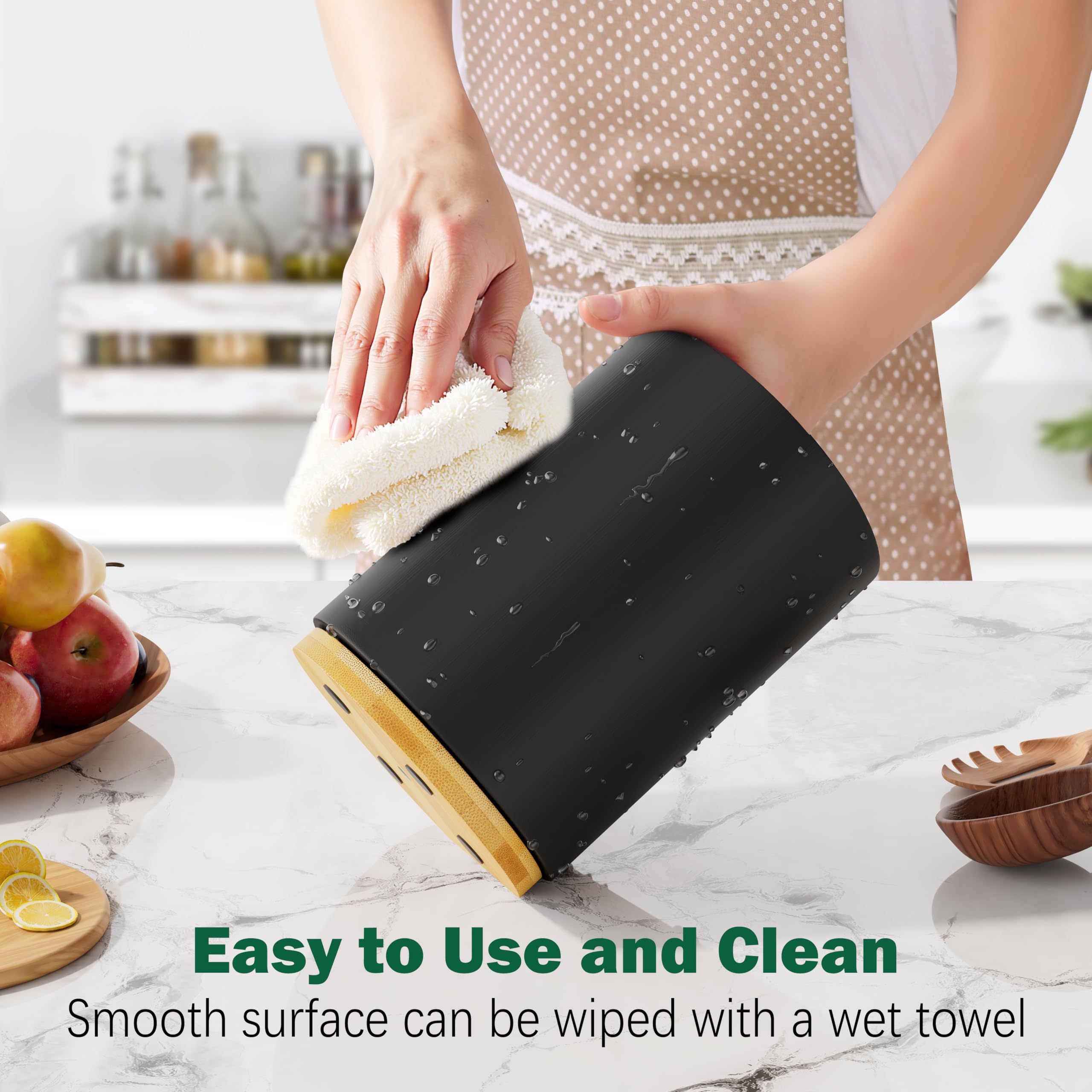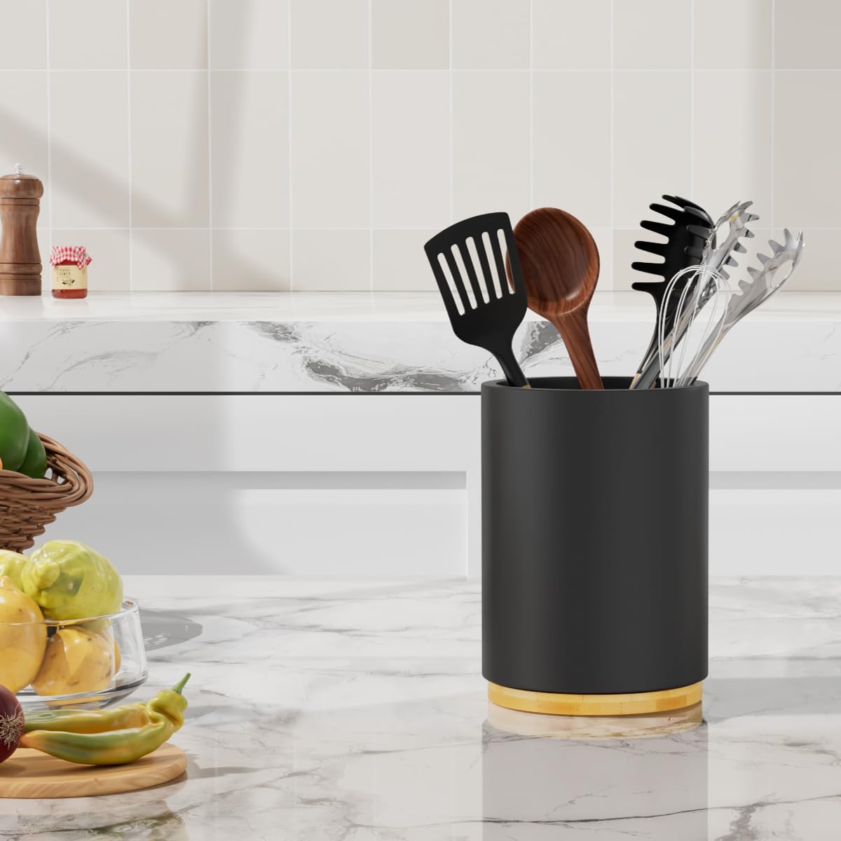 STABLE & LASTING - Made of bamboo, this kitchen utensil holder is obviously heavier and steadily stands on your countertop. Black style design with playful and long lasting kitchen decorations