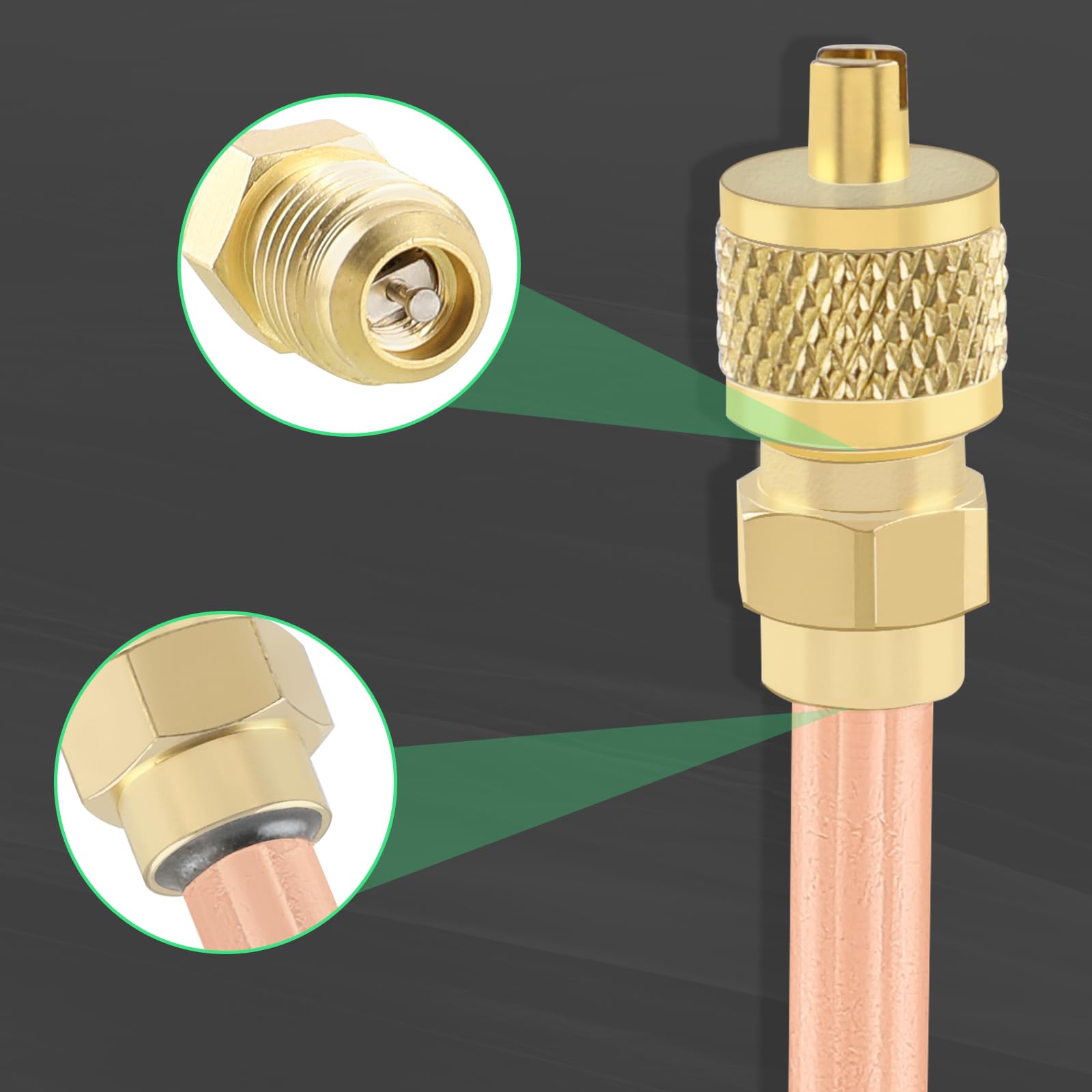 The caps are made of brass, they are provided with core remover and have an inside rubber o-ring