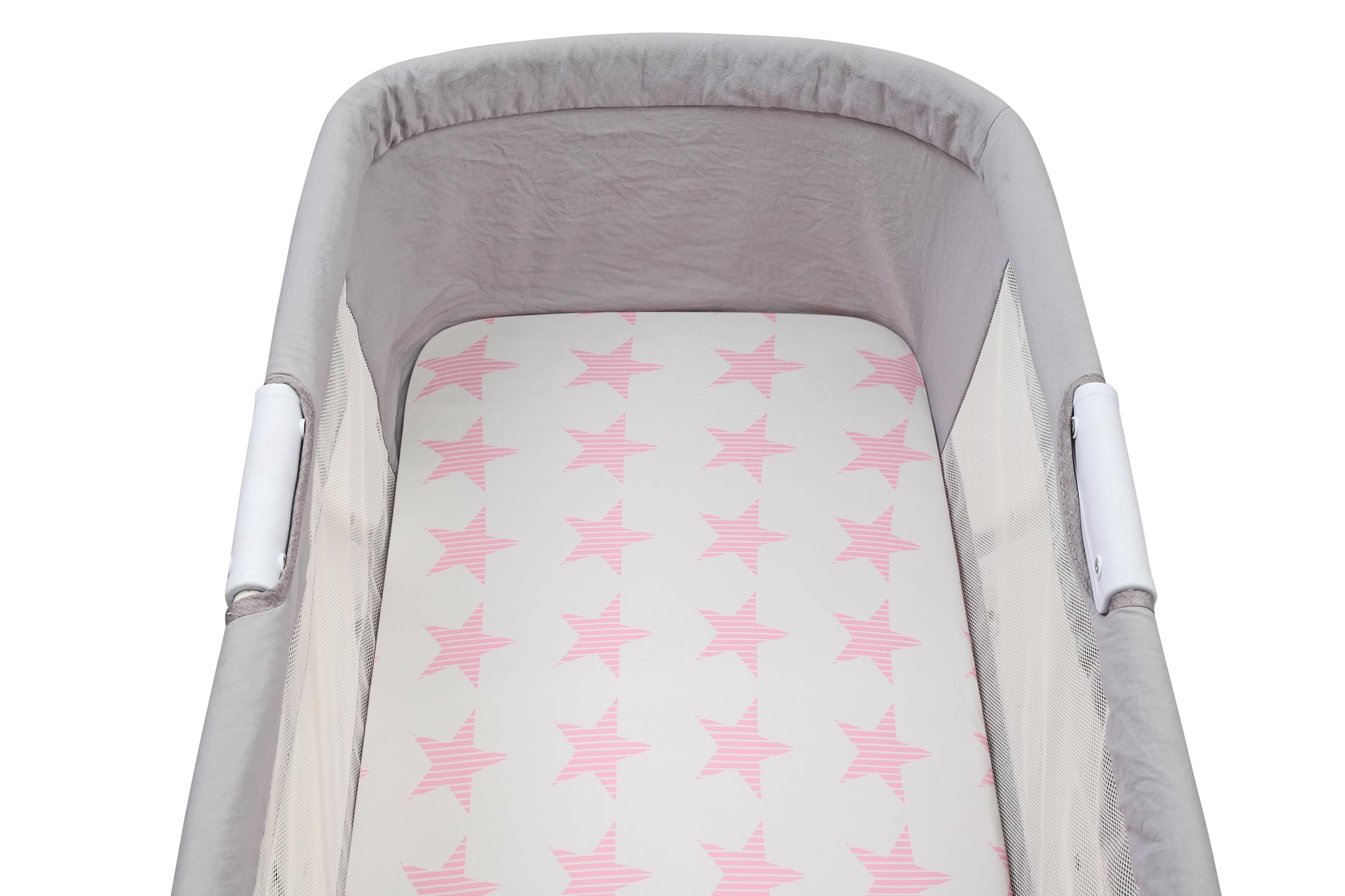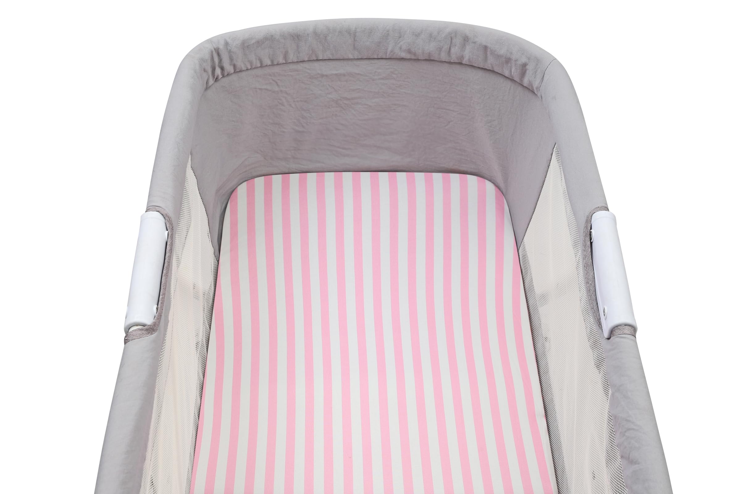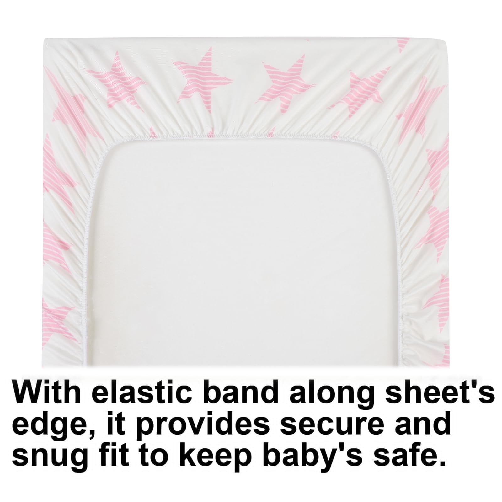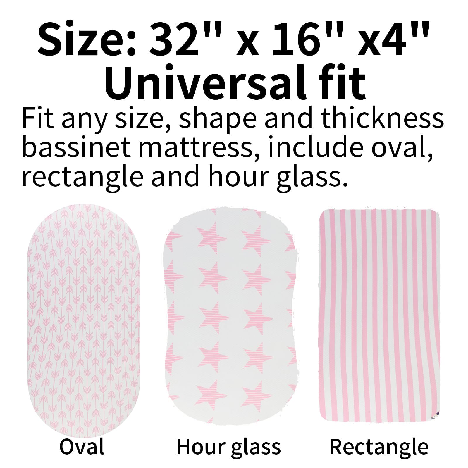 Pink Star Arrow Stripe Bassinet Fitted Sheet Set 3 Pack for Baby Girl UNIVERSAL SIZE Each sheet measures 16"x32"x4", this size allows you to fit our sheets on almost rectangle, hour glass and oval bassinet mattresses. Example: 31 x 15 x 1 inch oval bassinet mattresses; 29.5 x 18 x 1 inch hourglass bassinet mattresses; 32 x 16 x 2 inch rectangle bassinet mattresses and 29 x 14 x 2 inch rectangle bassinet mattresses. 360Β°ELASTIC BAND Elastic band is sewn along sheet for covering bassinet mattress/ pad snugly and firmly, say goodbye to those sheets which are ill-fitting or bunched up because too loose or too tight. ADORABLE DESIGNS Printed with pink star arrow stripe, our bassinet sheets match any style baby girl's room decoration. SOFT, SKIN-FRIENDLY FABRIC Our bassinet sheets are made of premium quality knitted fabric, hypoallergenic and beathable, gentle to touch, safe for baby delicate skin. It will help your little one sleep comfortably and peacefully! GREAT VALUE Our 3 pack sheets allows you to always have a clean sheet on hand. CARE TIPS: Warm gentle machine wash separately before use Don't bleach Tumble dry on low heat