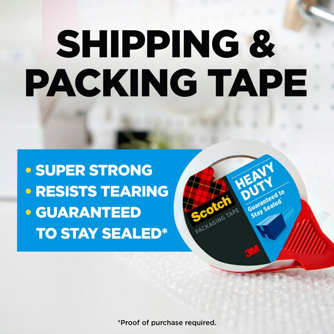 Scotch Heavy Duty Shipping Packing Tape provides excellent holding power for your packaging and shipping needs. This 3.0-mil thick (typical) box sealing tape holds strong on all box types, including harder-to-stick 100% recycled boxes, and is guaranteed to stay sealed (1). Designed with industrial-strength, solvent-free adhesive, this tape locks in the heavy-duty contents of your boxes and locks out everything else, even through rough handling conditions. Scotch Heavy Duty Shipping Packing Tape features instant adhesion and resists slivering, splitting and tearing to keep your moving boxes closed. Whether you're shipping heavy items, moving across the country or packing away seasonal decorations, this adhesive tape is equipped to keep your boxes sealed with just one strip on each seam. Each roll of box tape features a release coating to make unwinding easy and comes in a convenient dispenser that makes application a breeze. Fall-back tabs on the dispenser help ensure the tape doesn’t fall back on the roll, keeping it ready for the next use. (1) If your box does not stay sealed, 3M will refund the purchase price of this tape. Proof of purchase required. Contact: 1-800-3MHELPS (2) Typical Value