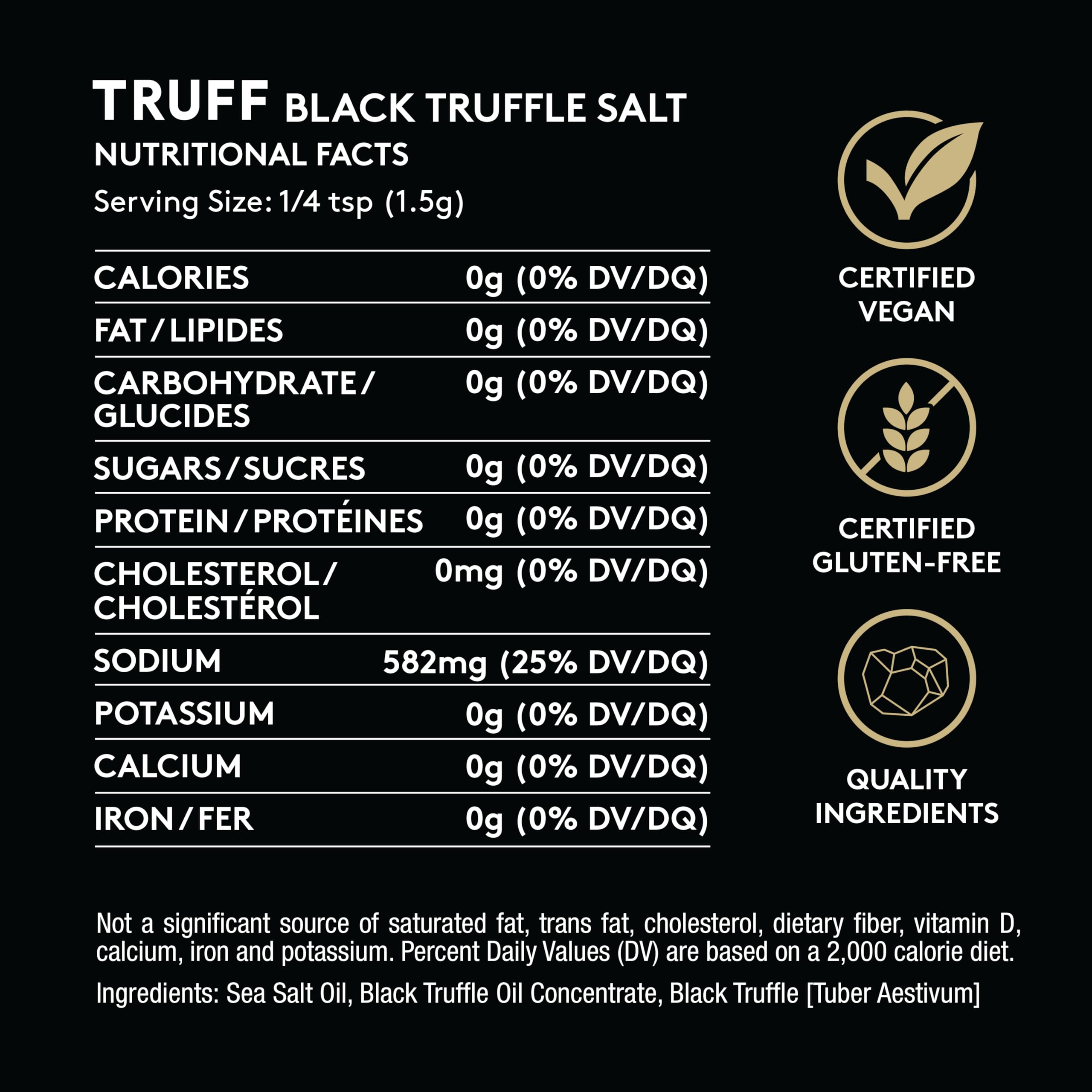 Add to Everything. TRUFF Truffle Salt is the perfect way to add the pure flavor and aroma of real black truffles to compliment every dish. You can use our Truffle Salt in your go-to recipes by sprinkling it on as a finishing salt, or incorporating it as an ingredient in the recipe. Honestly, we think your biggest challenge will be figuring out what doesn’t pair perfectly with Truffle Salt.