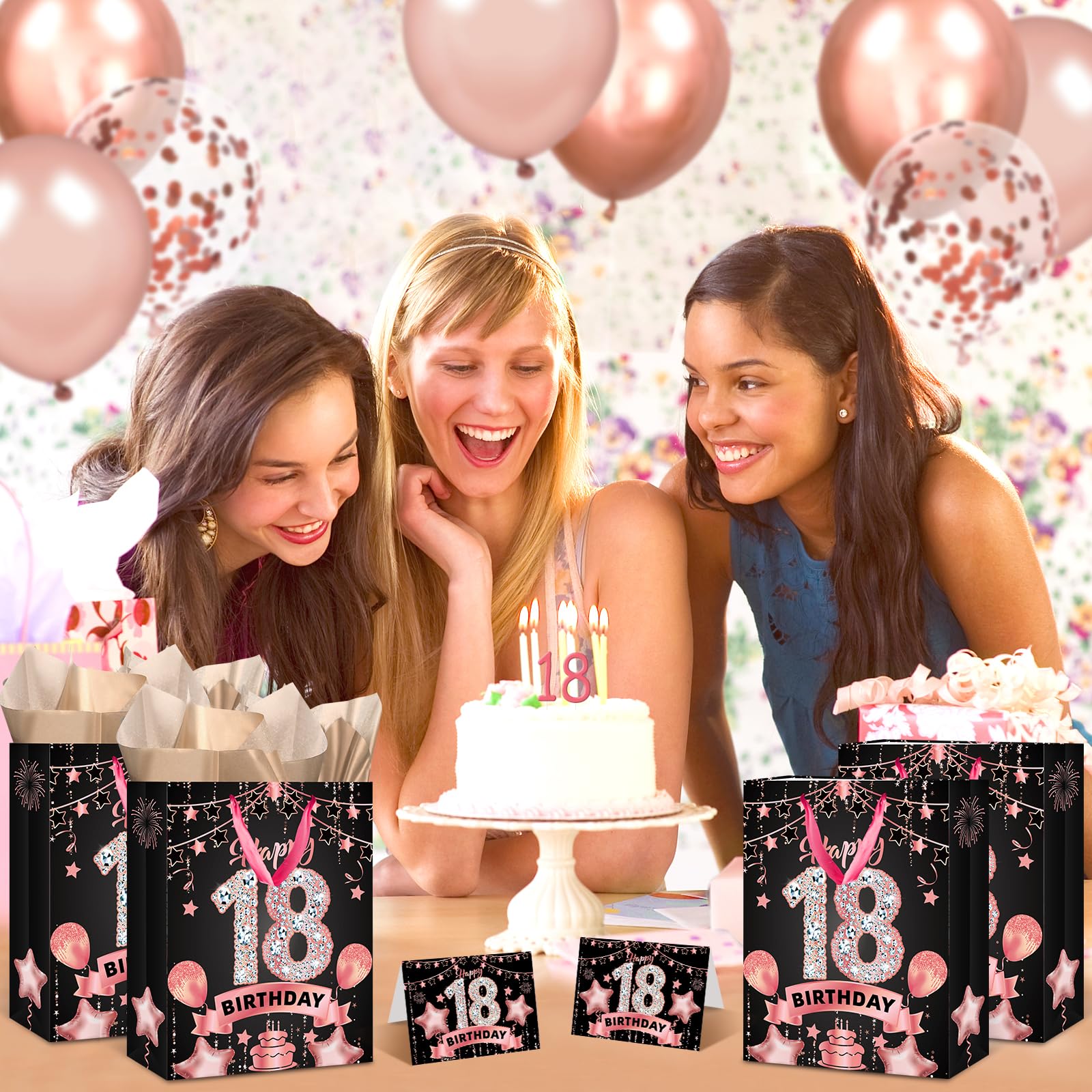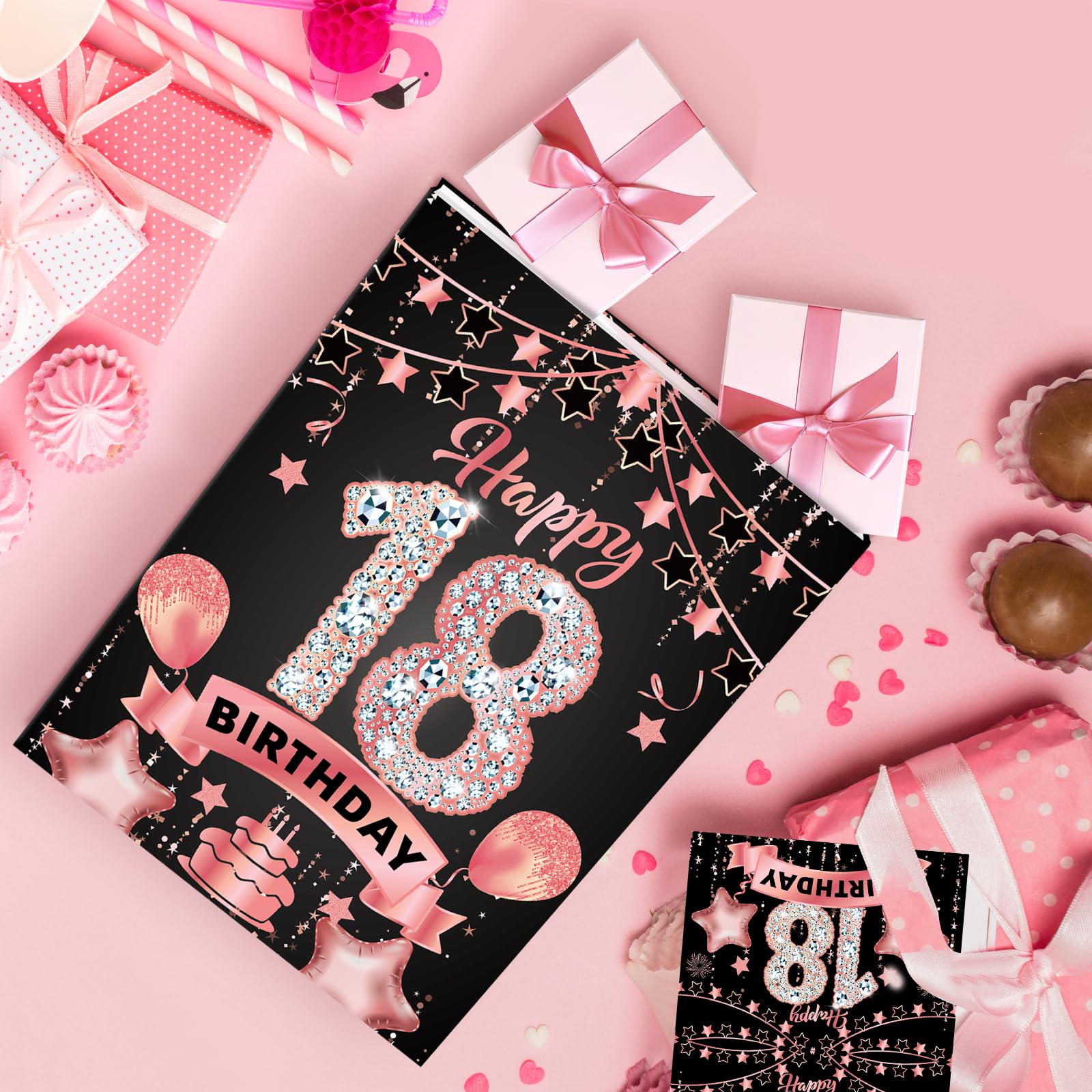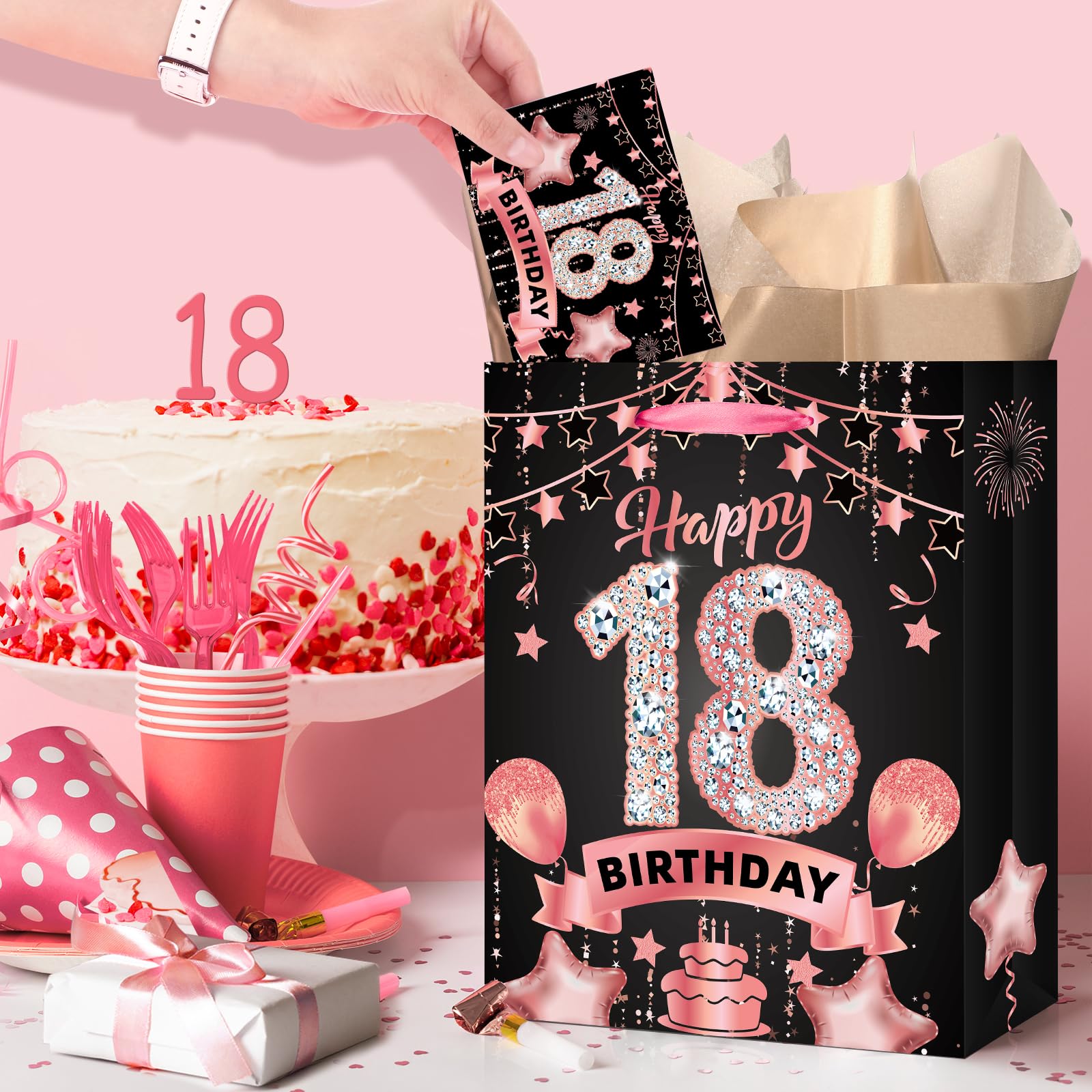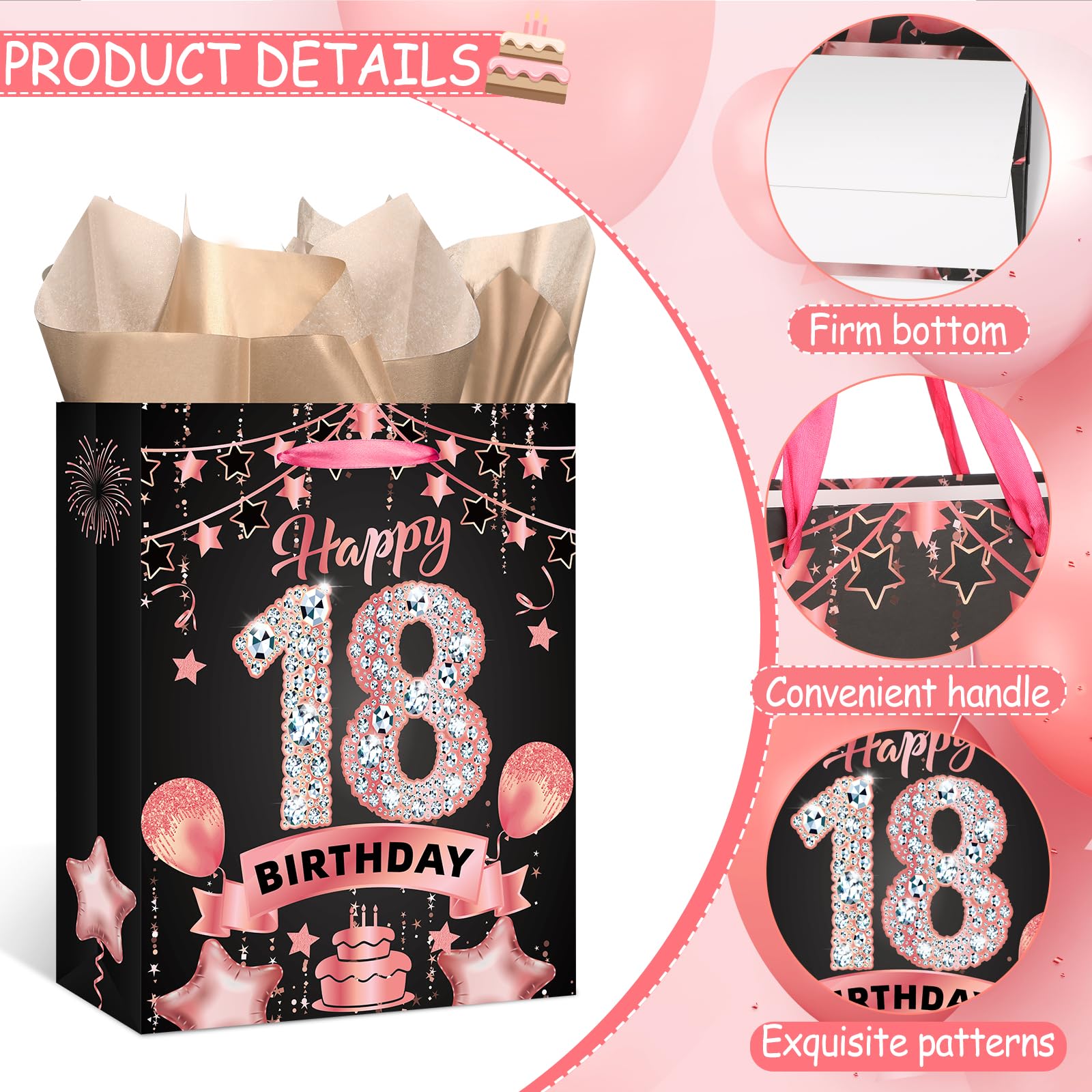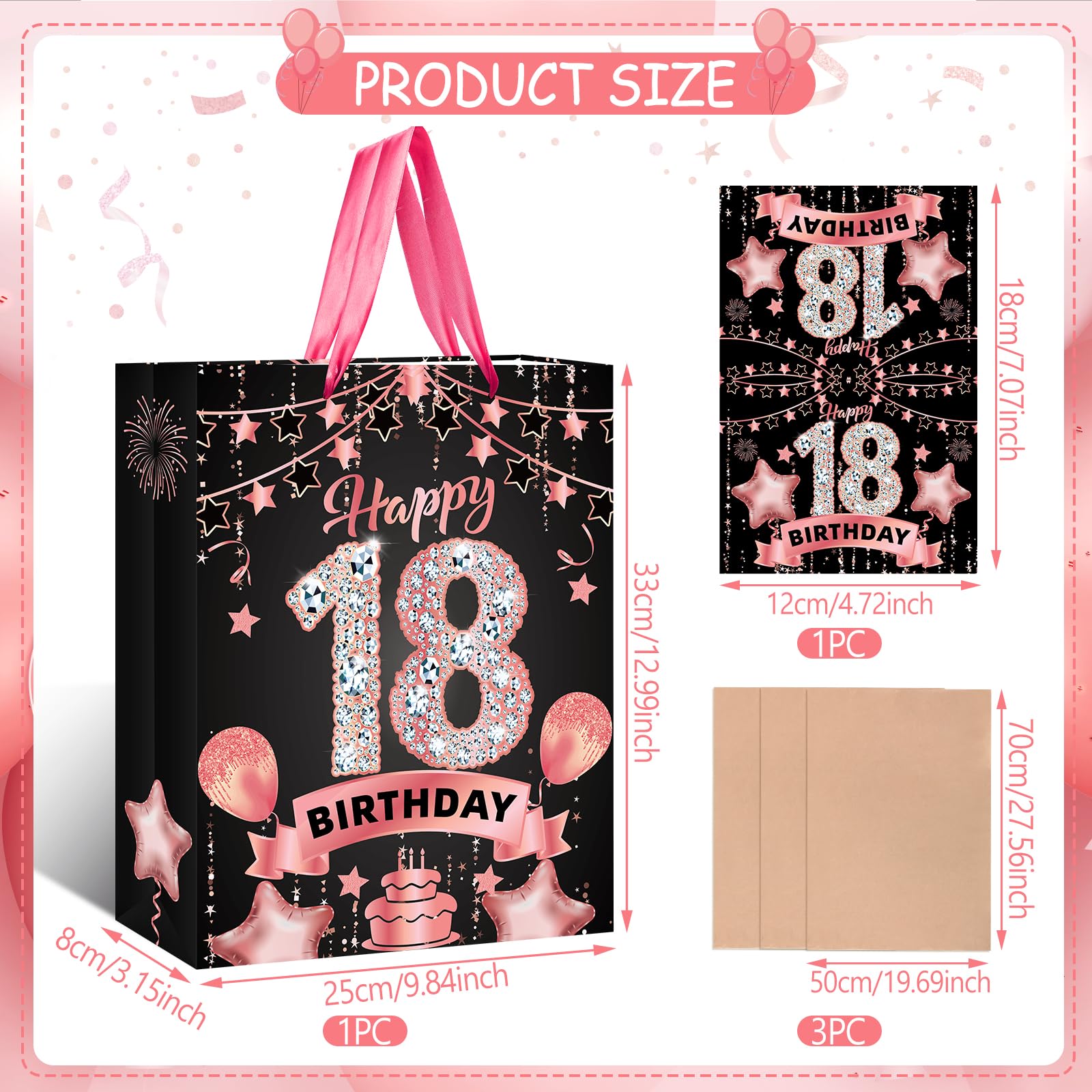 18th Birthday Gift Bag: This rose gold 18th birthday gift set includes 1 piece 18th birthday gift bag + 1 piece 18th birthday greeting card + 3 pieces tissue papers,and the 18th birthday gift bag features exquisite 18th birthday celebration pattern, such as cakes, balloons, fireworks which will leave a deep impression