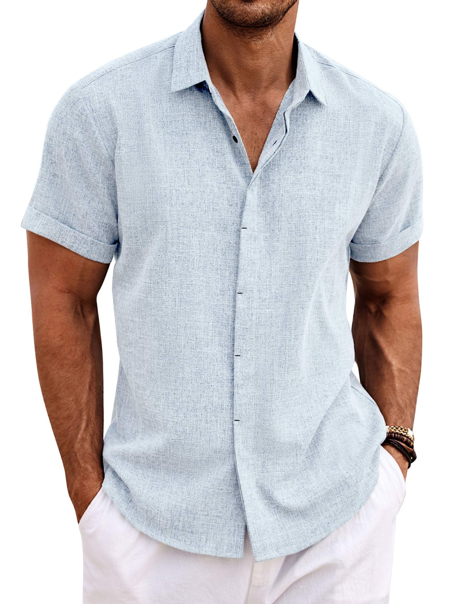 CASUAL & FASHION --- Mens Casual Linen Shirts comes with button-down closure, short sleeve, adjustable cuff, silm fit, solid color. Casual Beach Style Design to make you feel better about this summer