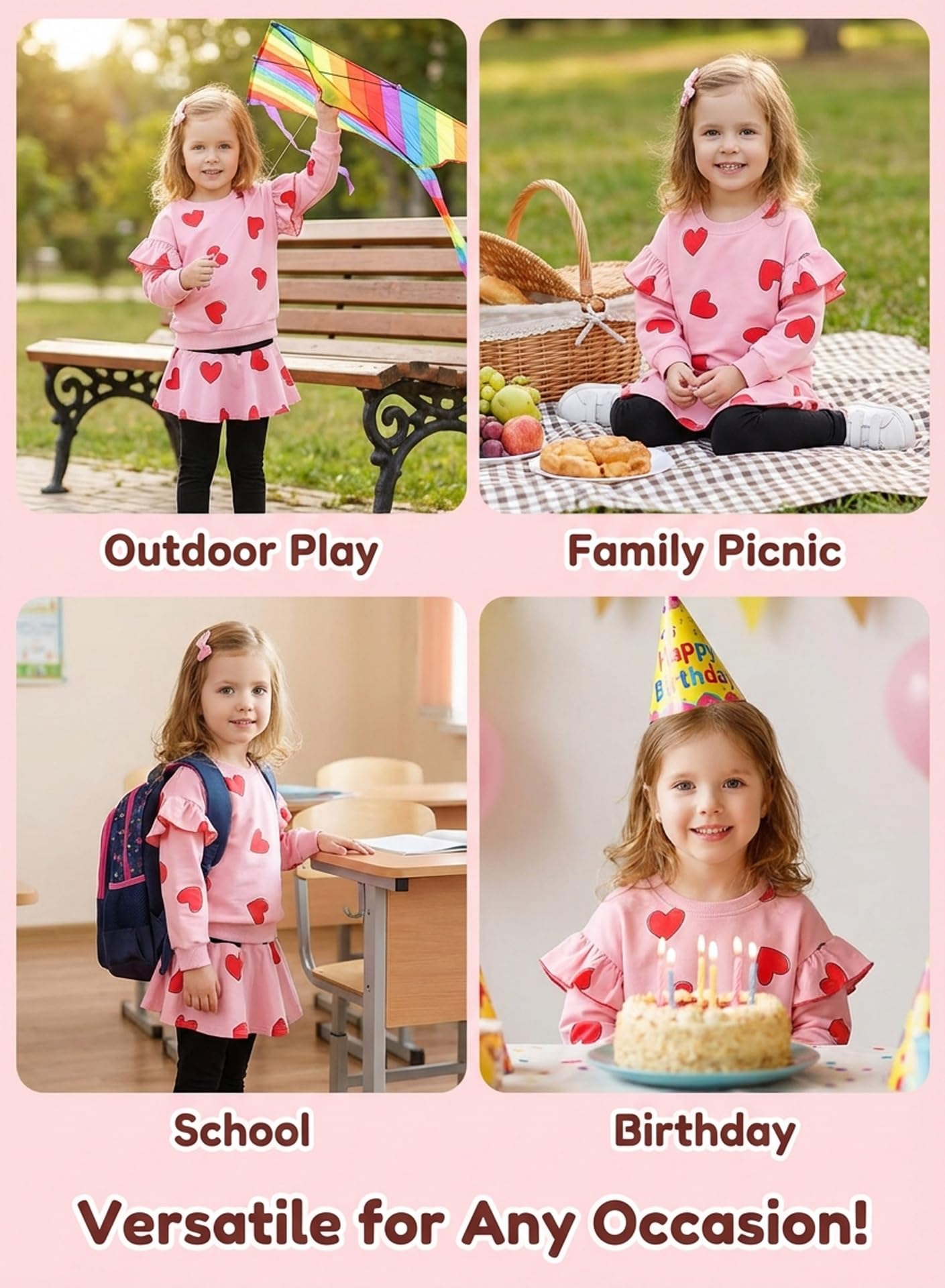 🌟 Versatile and Stylish: Designed with a cozy long-sleeve shirt and a stylish skirt-pants combo, this outfit ensures your little one stays warm and comfortable. The cheerful heart prints add a fun touch, making it a standout choice for both special and everyday wear.