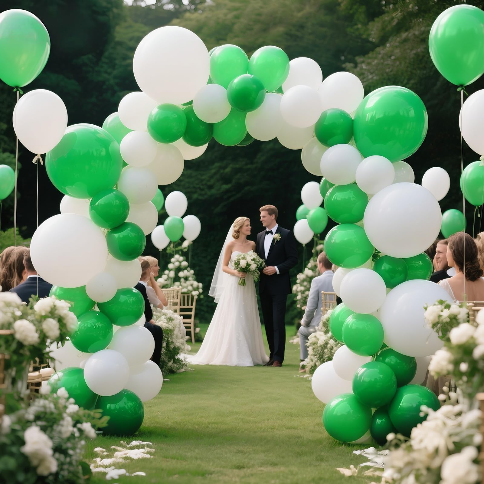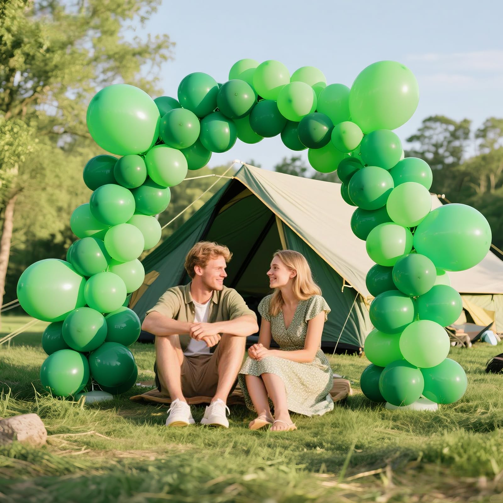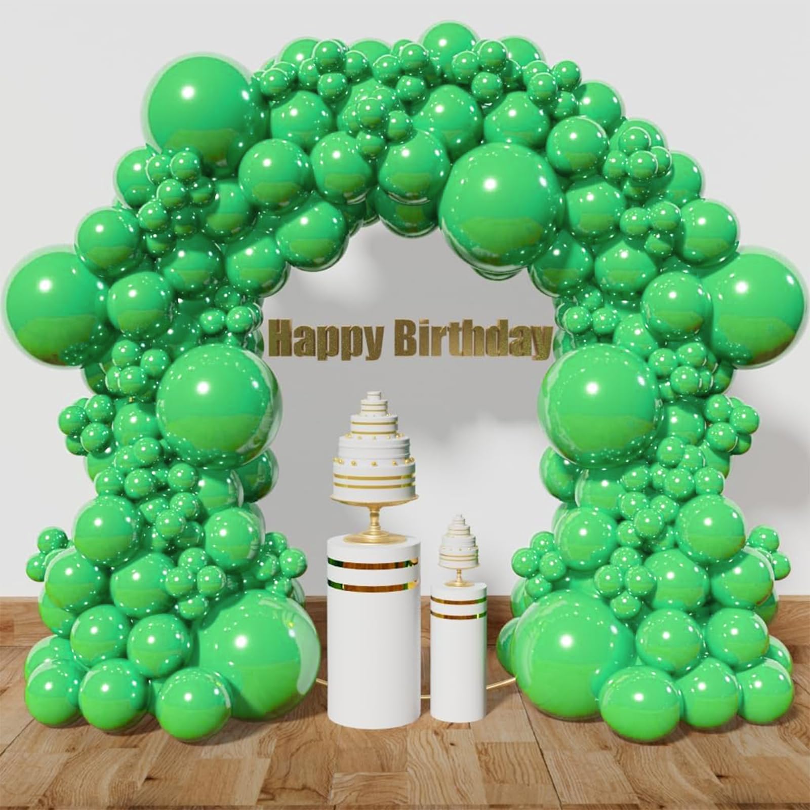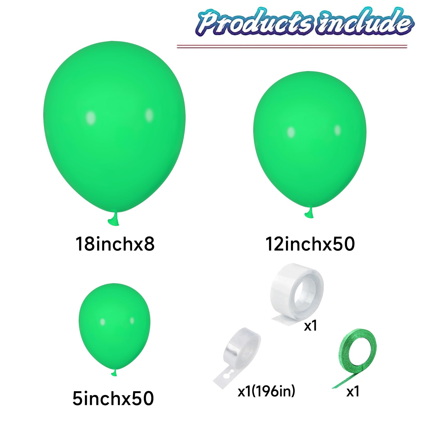 Green balloon garland kit: 111Pcs Green balloons pack, including 8 pcs 18 inch balloons, 50 pcs 12 inch balloons, 50 pcs 5 inch balloons, a 5 meter balloon chain, 100 dots of glue dots, a roll of ribbon.