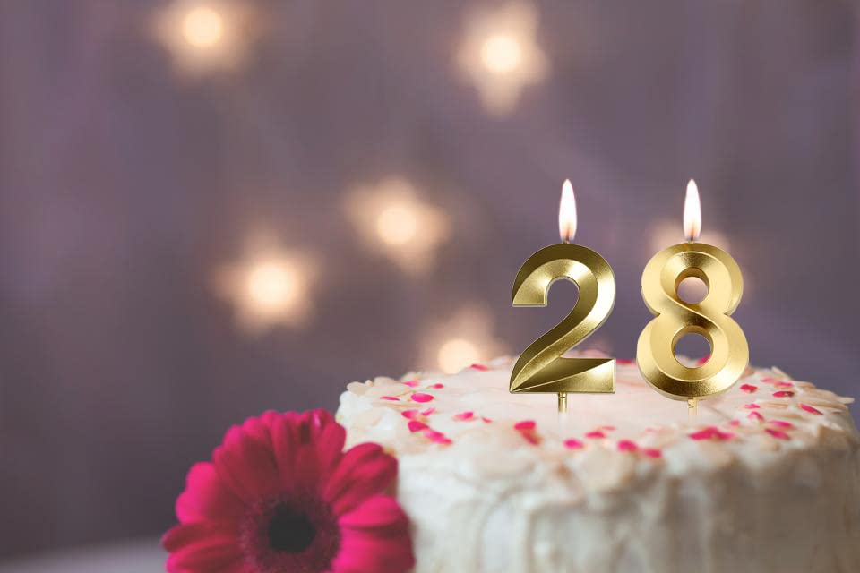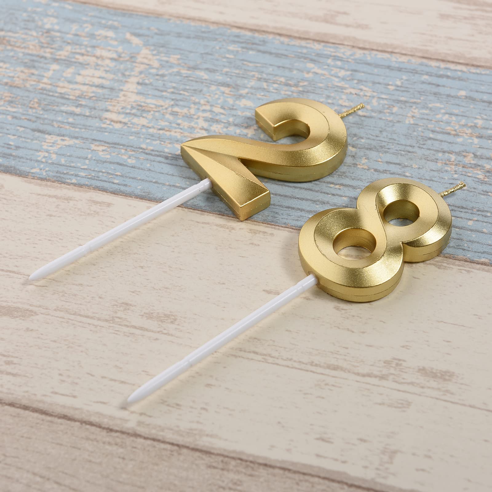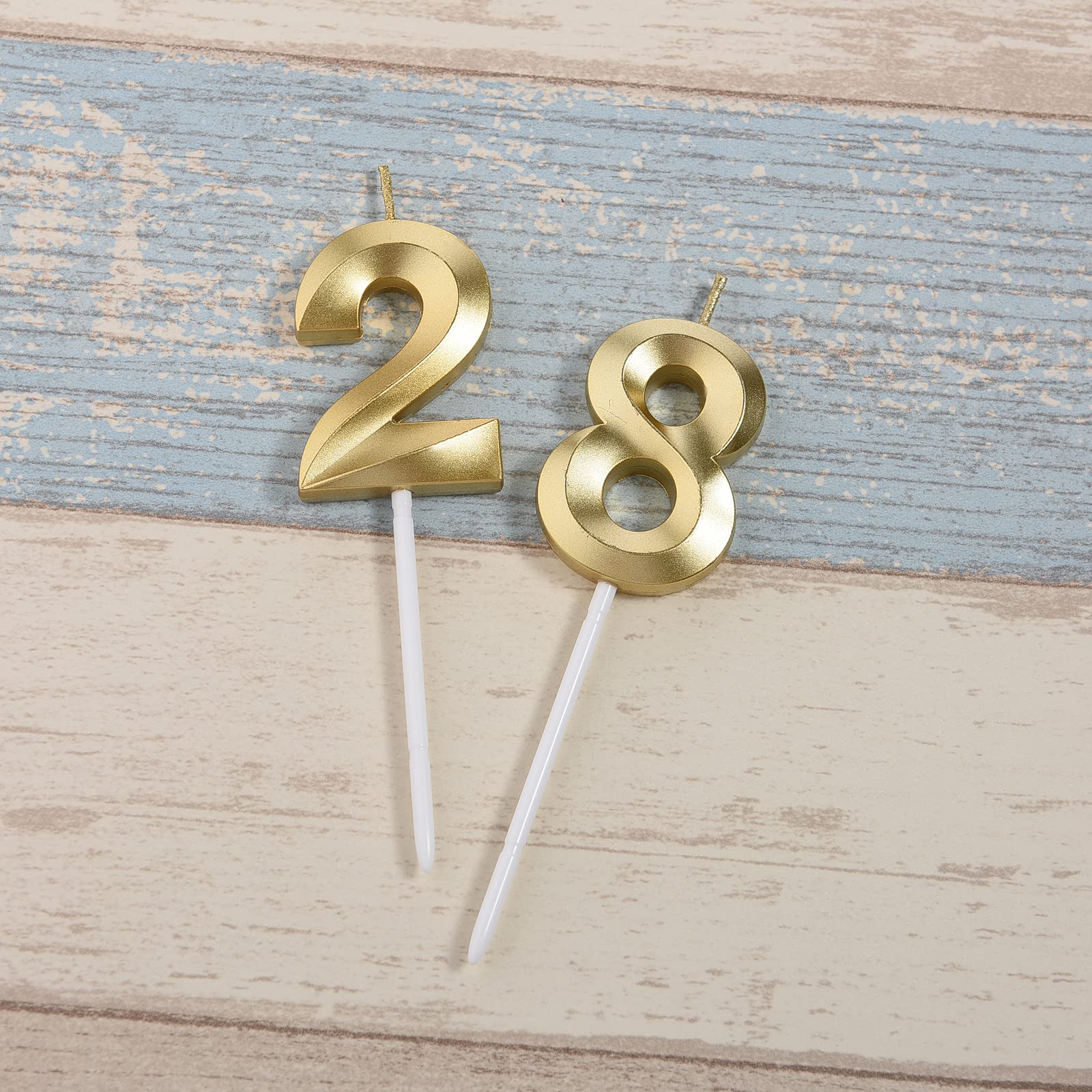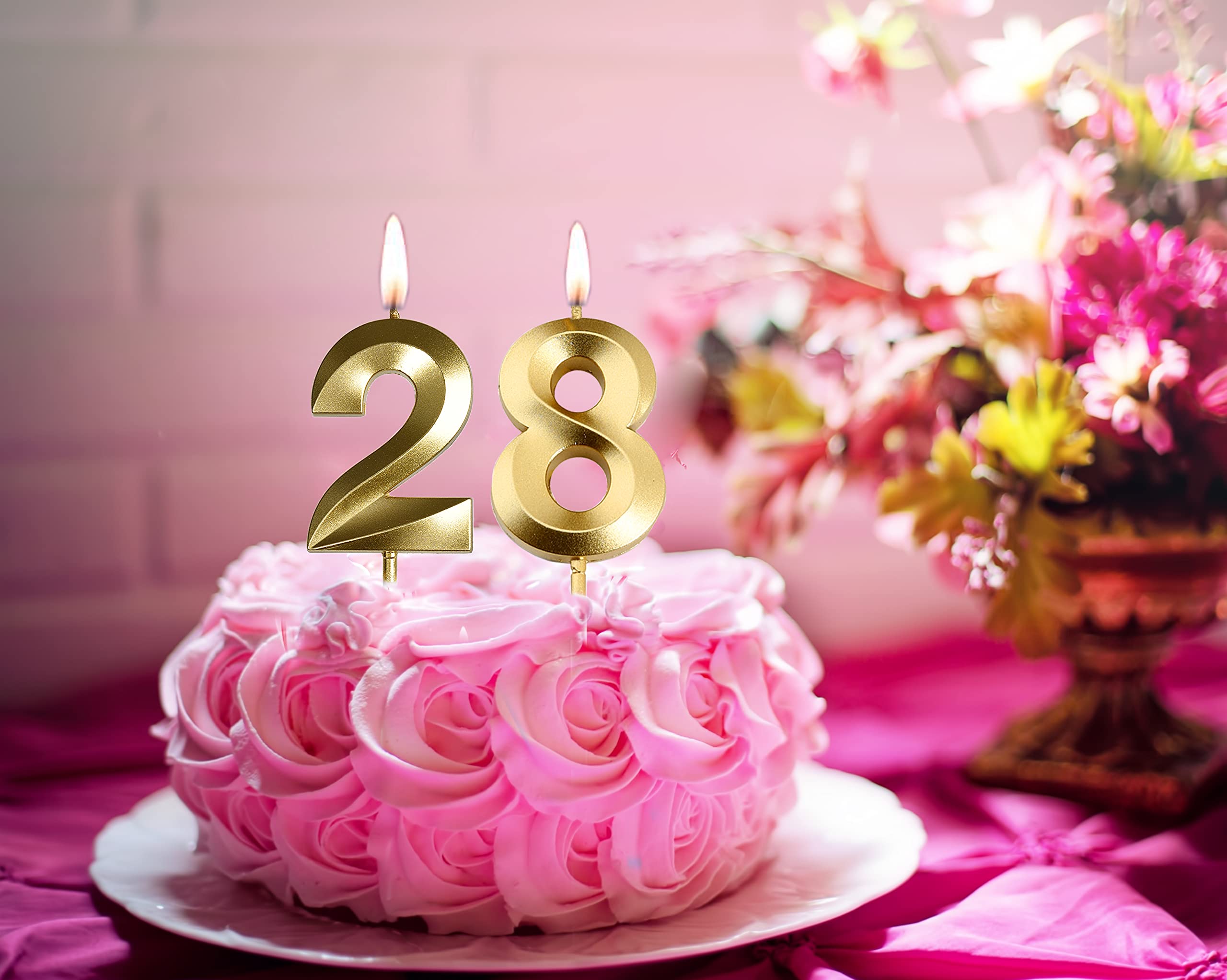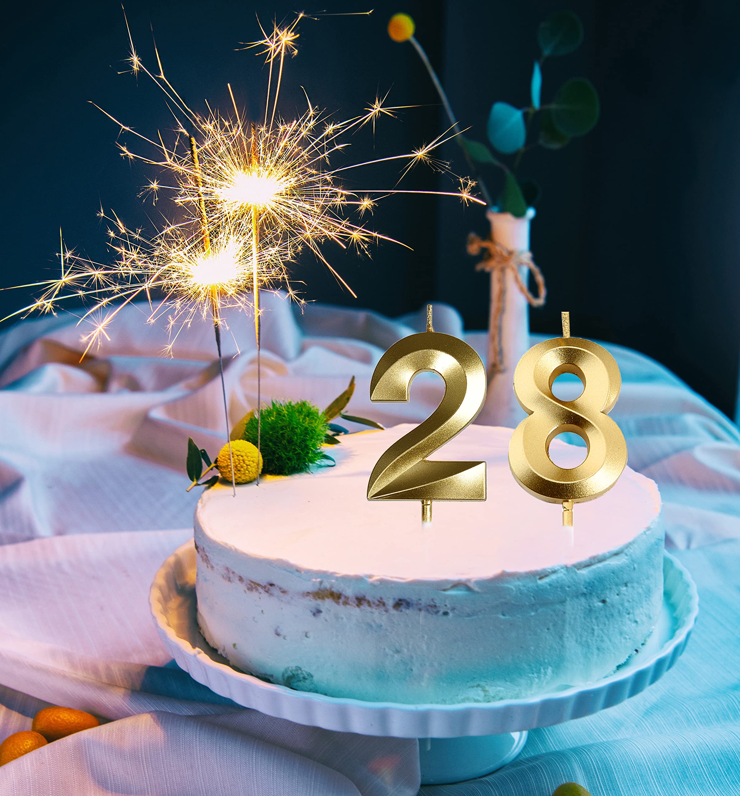 INSTRUCTIONS: Size: Width:1.3 in. Number height: 1.9 in. Total height: 4.8in Color : Glitter Gold Material : quality wax ,smokeless and non-toxic Burning Time :approx 4-5 minutes Package included:2 Pcs ,Gold Number 28 birthday candles PLEASE NOTE: Please keep the candles in shade away from the fire and make sure the size match to your birthday cakes