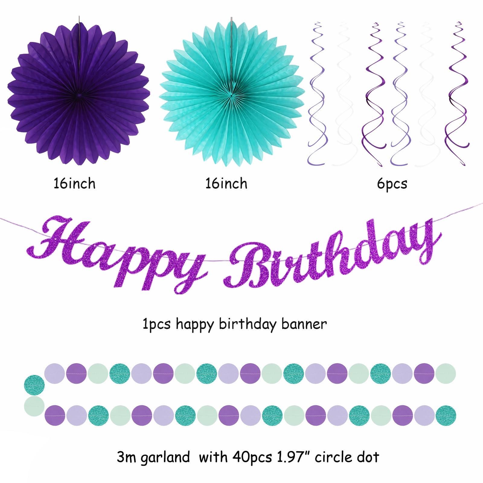 【Teal Purple Lavender Party Favors】This kits include 1pcs happy birthday banner, 1pcs circle dots paper banner, 4pcs tissue pom poms: 3pcs 10" and 1pcs 12" , 3pcs 8inch paper honeycom ball, 2pcs 8inch paper lantern, 4pcs 12inch paper flower fan, 6pcs Paper swirls hanging streamers.