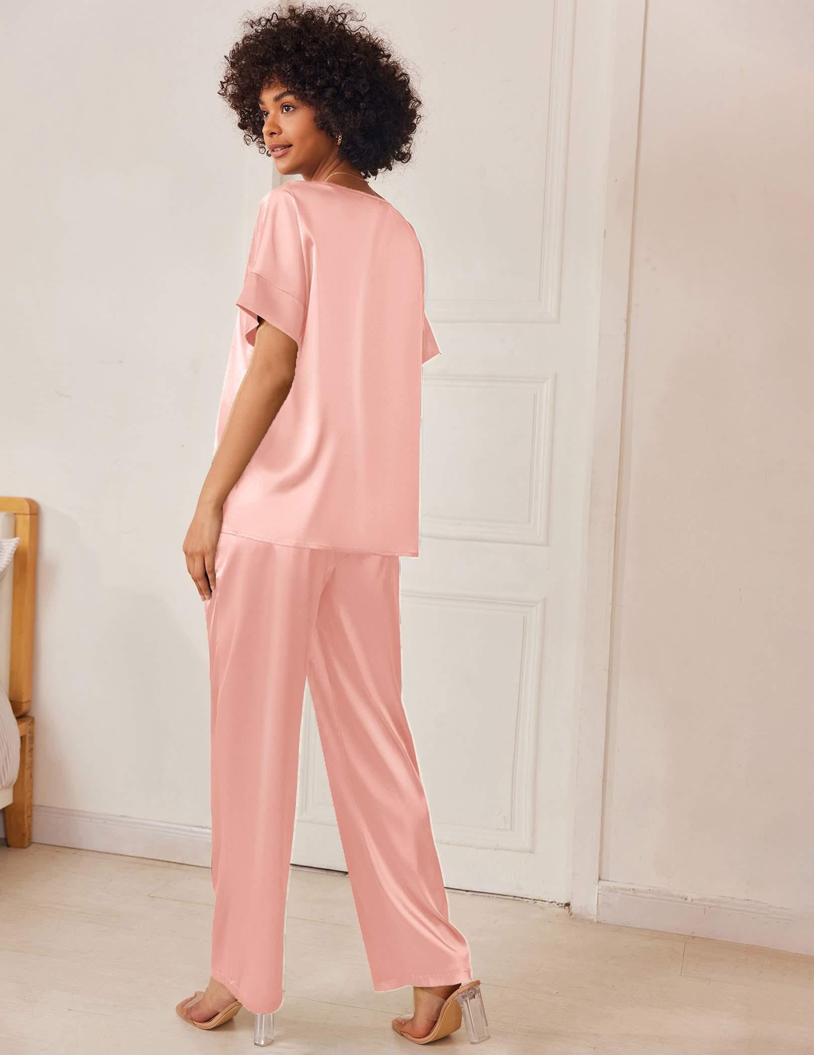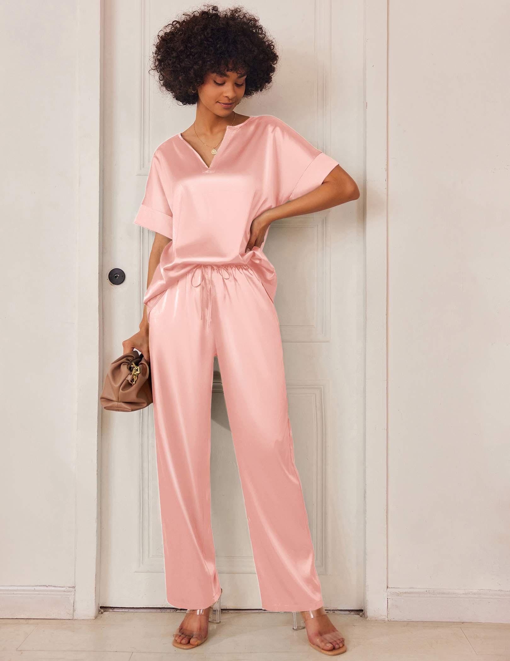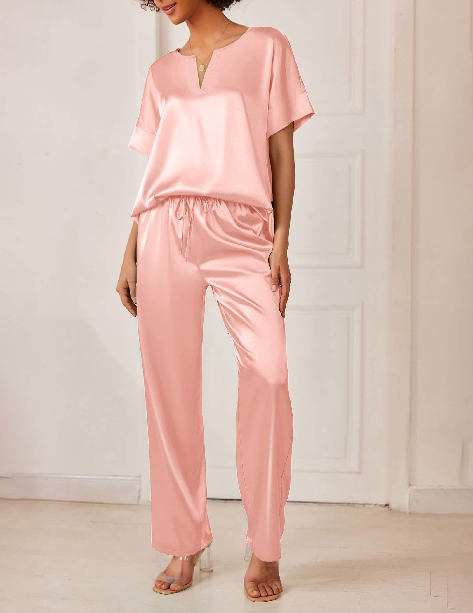 DESIGN&FEATURES: Top: Deep V-neck, short sleeve with wide sides. Pants: Relaxed fit wide legs long pants with high stretch elasticated trousers and 2 sides large pockets.Silk pajamas for women with popular designs makes your family wander more elegant