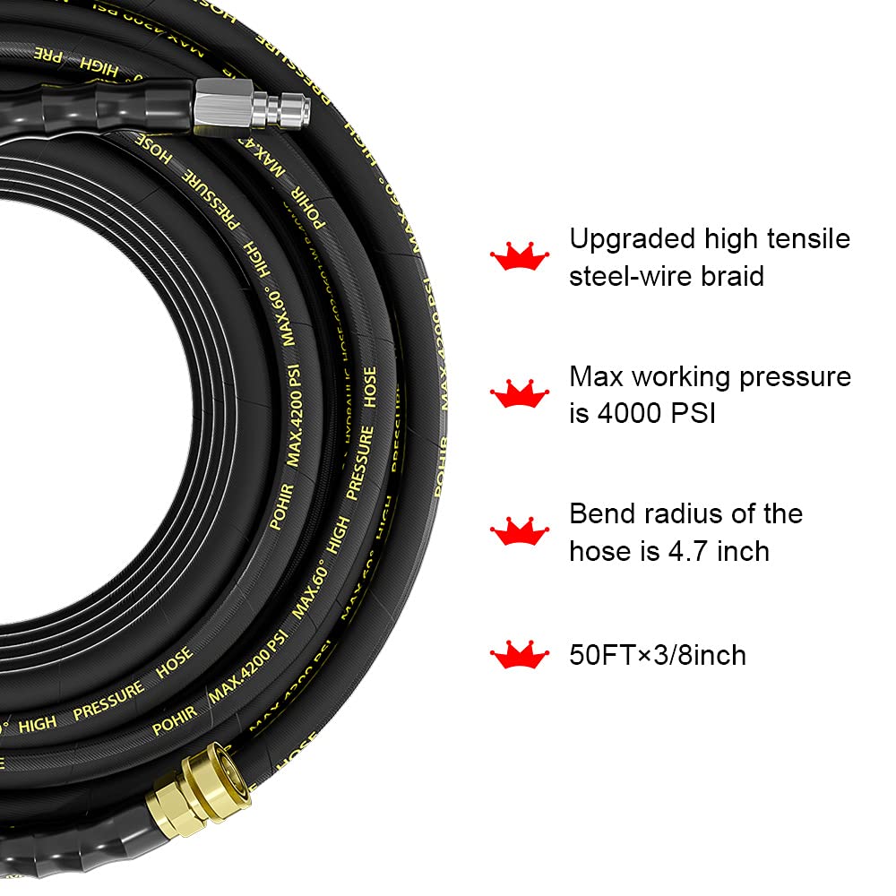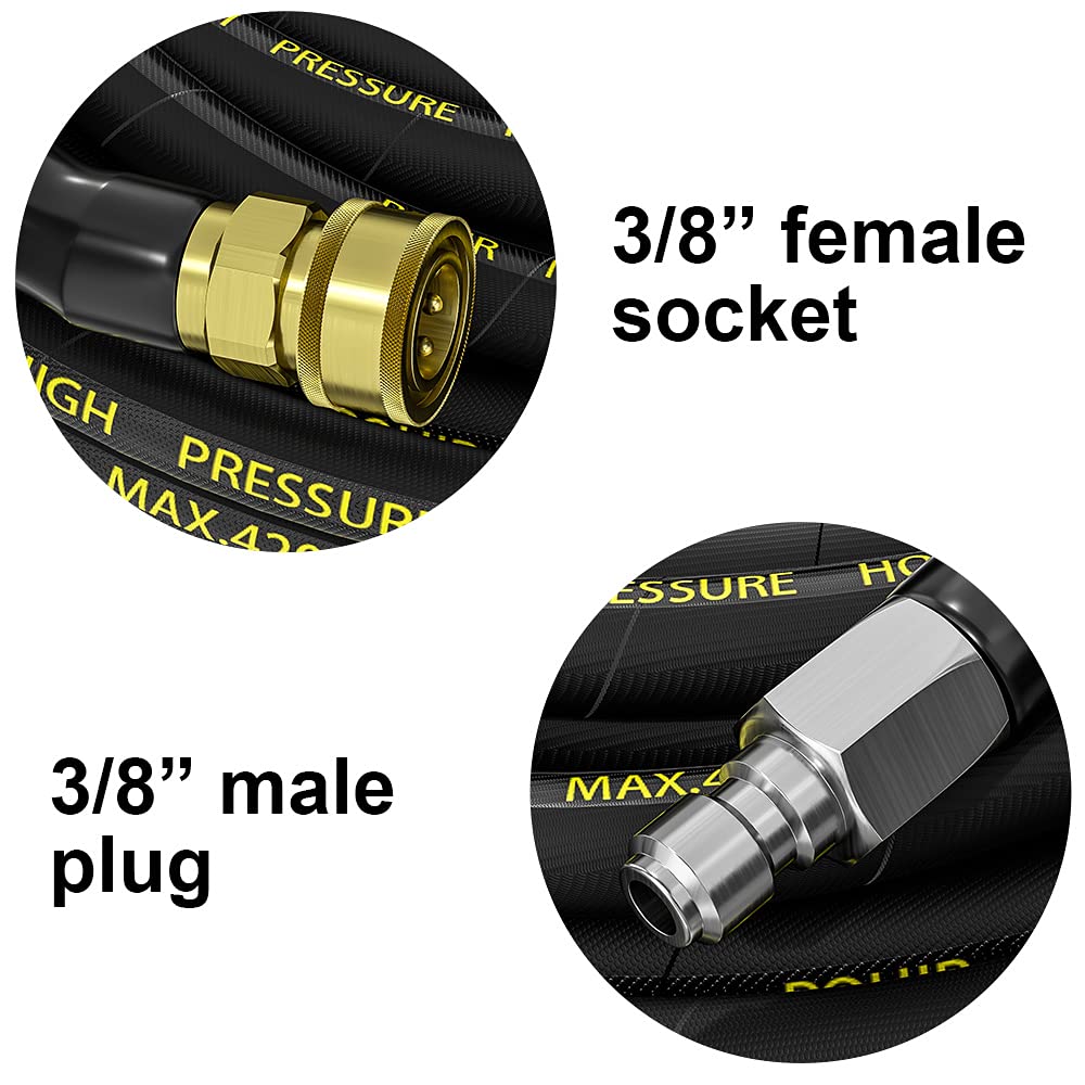 【3/8 Quick Connect Pressure Washer Hose】The pressure hose is equipped with 3/8" quick connector which is not only easy to connect & disconnect, but also helps connect firmly to the pressure washer without being easily shaken, damaged, rusted or leaked. Warm tips: it's a pressure hose, not a garden hose. Suitable for pressuer washer only.