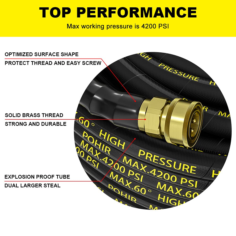 【Pressure Washer Hose 4200 psi】MAX working pressure of this high pressure washer hose can reach 4200 PSI. The burst pressure is up to 16000 PSI. Max working temperature is 140℉/ 60℃. Flow rate is 2.5 GPM to 5 GPM. It's designed to be compatible with most brands of power washers.